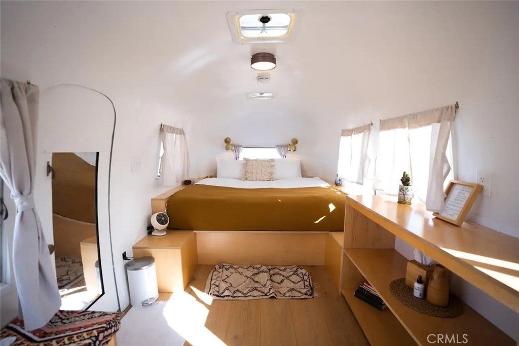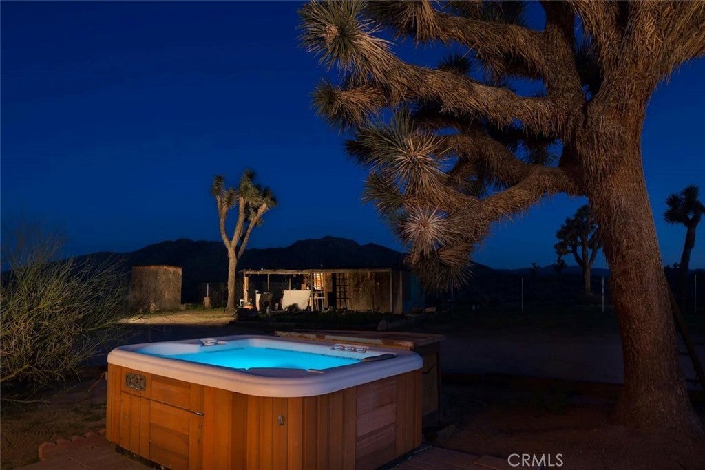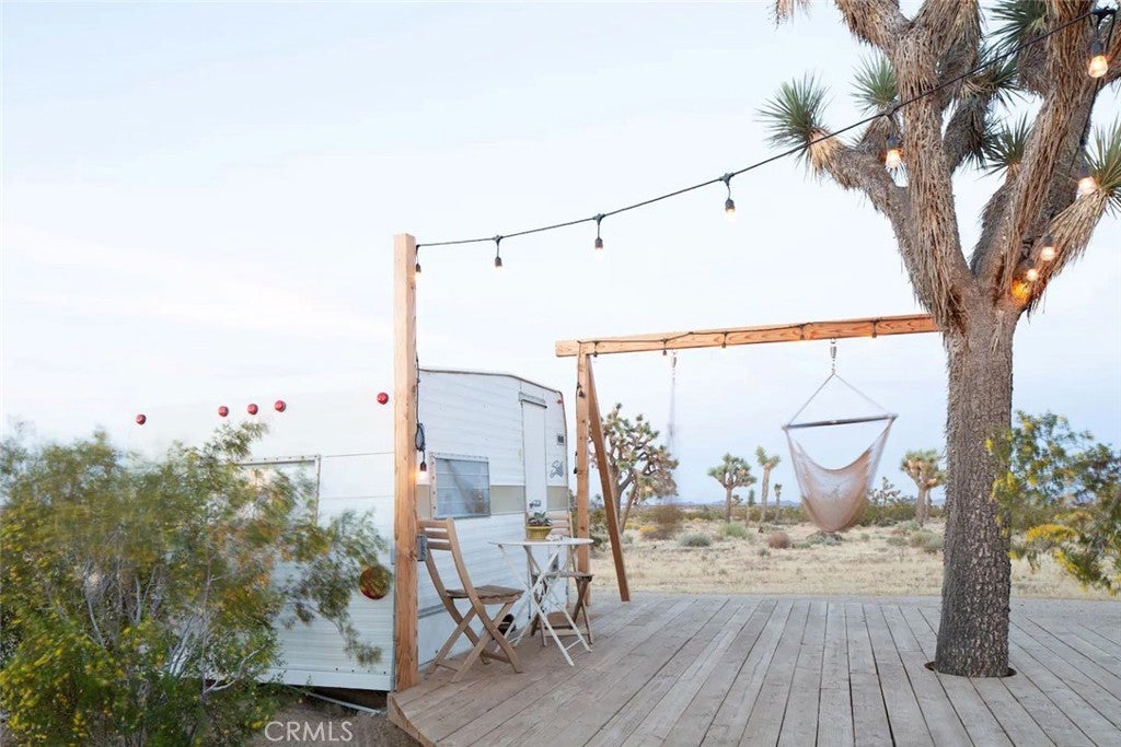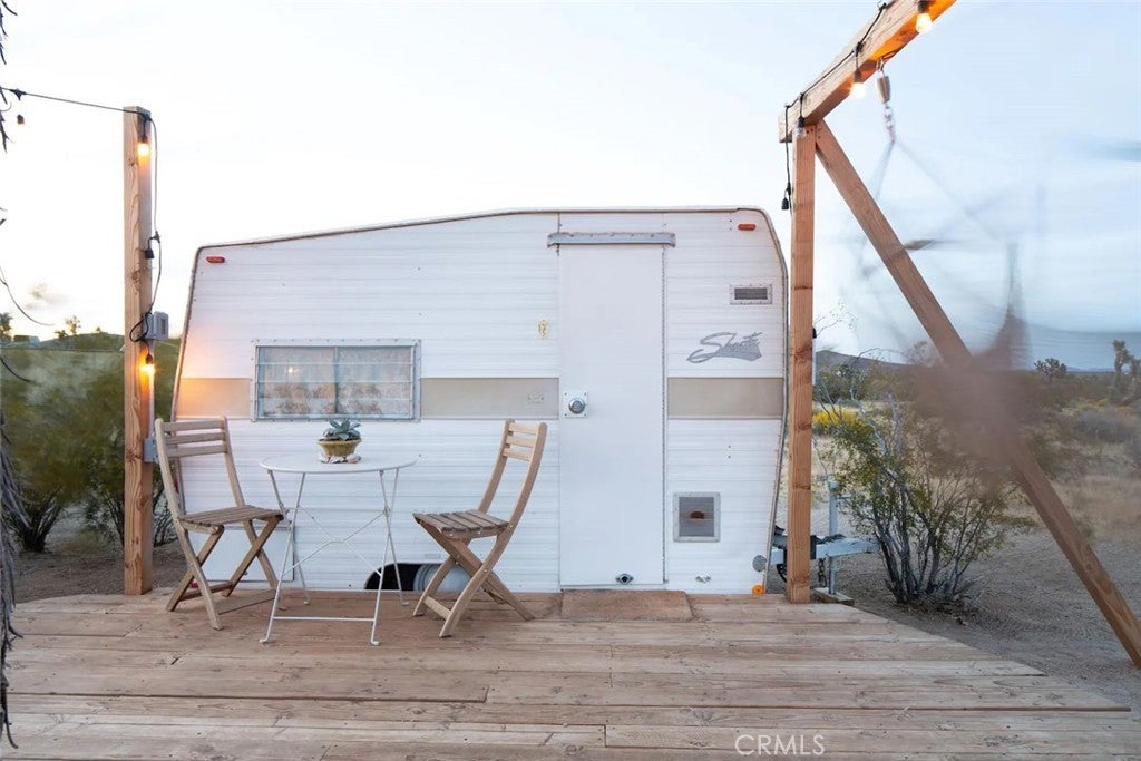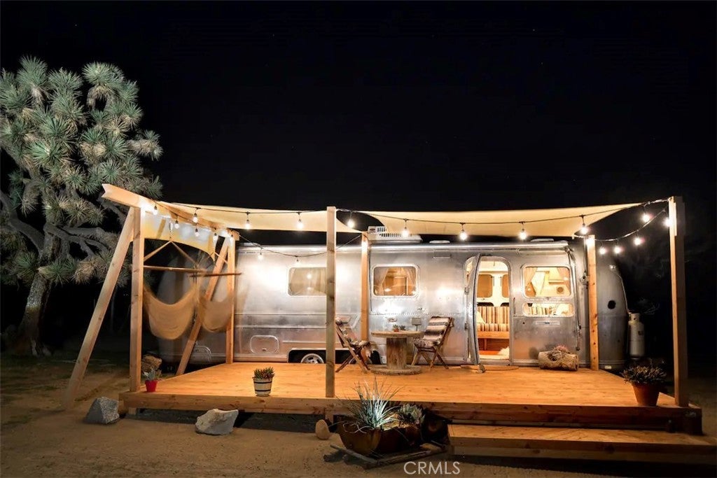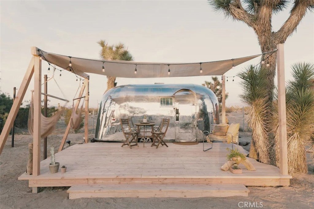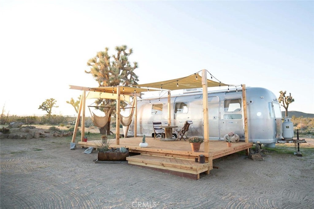 Discover vintage allure and modern luxury at your own haven in Joshua Tree, California. This lovely small home features flexible, indoor and outdoor living. The interior features 1 bedroom and 1 bathroom and a cozy kitchen space and high ceilings, and mini split unit for heating and air conditioning. The Exterior is expansive, kitchen with pizza oven and BBQ, showers, and auxiliary bathroom/ laundry building. The Full 10 Acres are fenced in with automatic main gate and 3 other access gates. Relax in the spa, take a dip in cold plunges, and enjoy solace amid the breathtaking scenery. Dine under the stars in on the patio, savoring meals with friends while surrounded by the vast desert sky. As the sun sets, witness the desert's diurnal life—quail, dove, jack rabbits stir under LARGE iconic Joshua trees. Joshua Tree Acres is Nestled on 10 acres of desert landscape, two vintage and two meticulously restored Airstreams and a Vintage Shasta offer a unique blend of charming, and comfortable way *rough it*Situated in Joshua Tree's enchanting landscape, your new home provides front-row seats to stunning sunsets and star-studded nights. This unique energy defines you every moment. Escape the ordinary and embrace the extraordinary, a journey into vintage inspired luxury, natural wonder, and inner peace. Includes all 6 Trailers and Furnishings. New 400 Amp panel