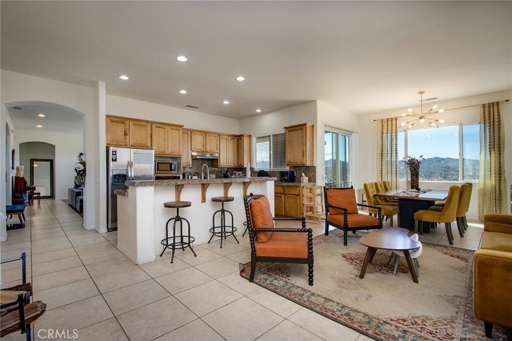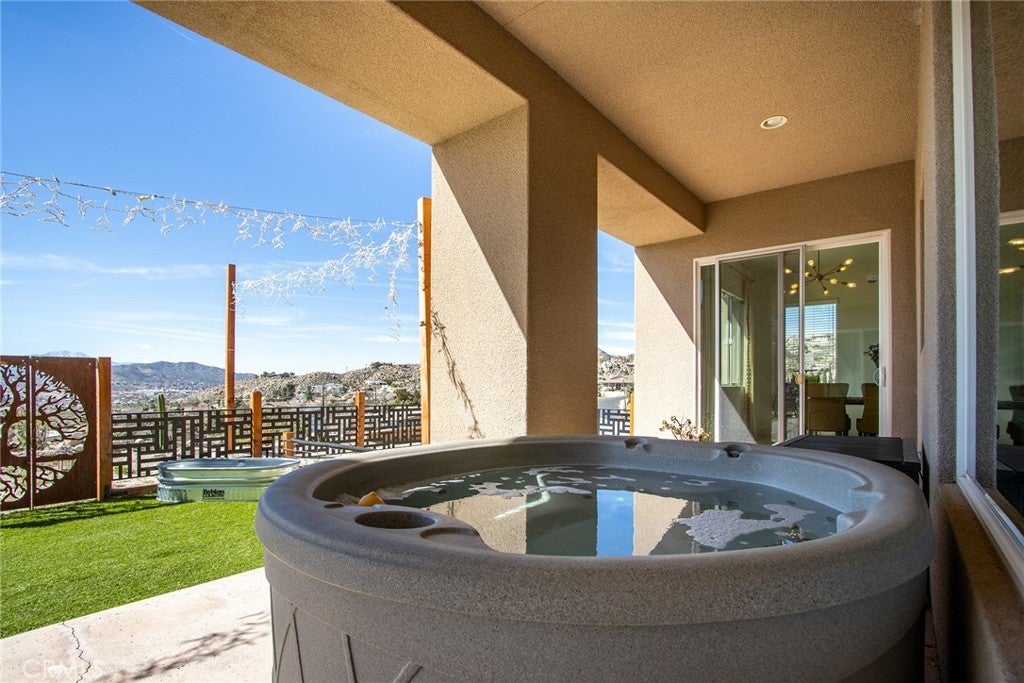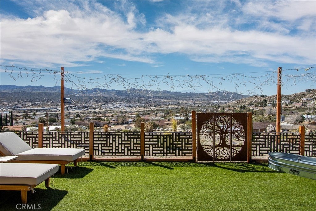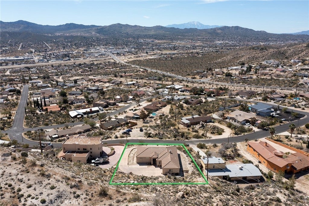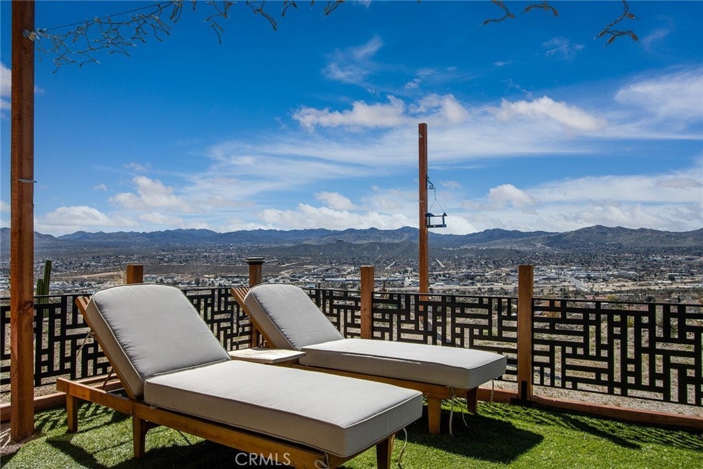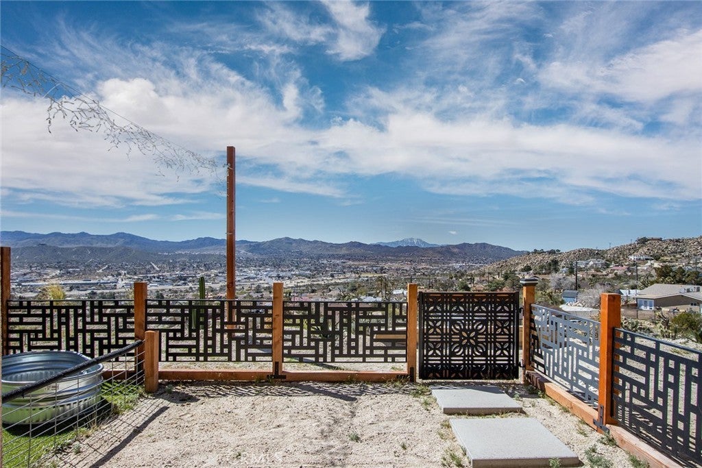 How do you describe a view like this? Panoramic? Breathtaking? Even those fall short. Perched along the north hillside of Yucca Valley and tucked into the iconic Western Hills boulder formations, this one-of-a-kind view home delivers a perspective that is truly unmatched. Designed in a modern Santa Fe style, the residence offers over 2,368 square feet of living space on an expansive 24,000+ square foot parcel, perfectly positioned to capture unobstructed 180° vistas stretching across city lights and all the way to Joshua Tree National Park. Inside, the living room is anchored by dramatic picture windows that frame the landscape like living artwork, filling the home with natural light and emphasizing the connection between indoor comfort and outdoor beauty. A covered patio extends the living space, creating the ideal setting for entertaining or simply taking in the desert’s stunning sunsets and night skies. The open-concept kitchen flows seamlessly into the dining and family rooms, where a fireplace adds warmth and ambiance on cooler evenings. The split floor plan enhances privacy, with the oversized primary suite situated on the east wing. This retreat offers ample space for a sitting area, office, or fitness setup, along with a well-appointed bathroom featuring a separate tub and shower, private water closet, expansive walk-in closet, and a wet bar perfectly suited for a coffee station. On the west side of the home, two additional bedrooms provide comfortable accommodations, including one with direct access to a bathroom. A dedicated laundry room leads to the finished two-car garage for added convenience. High ceilings, granite finishes, and an abundance of natural light contribute to the home’s bright and airy feel. But ultimately, this property is defined by its setting. At the end of the day, this is more than a home—it’s a front-row seat to one of the desert’s most captivating views. Make time to experience it for yourself.