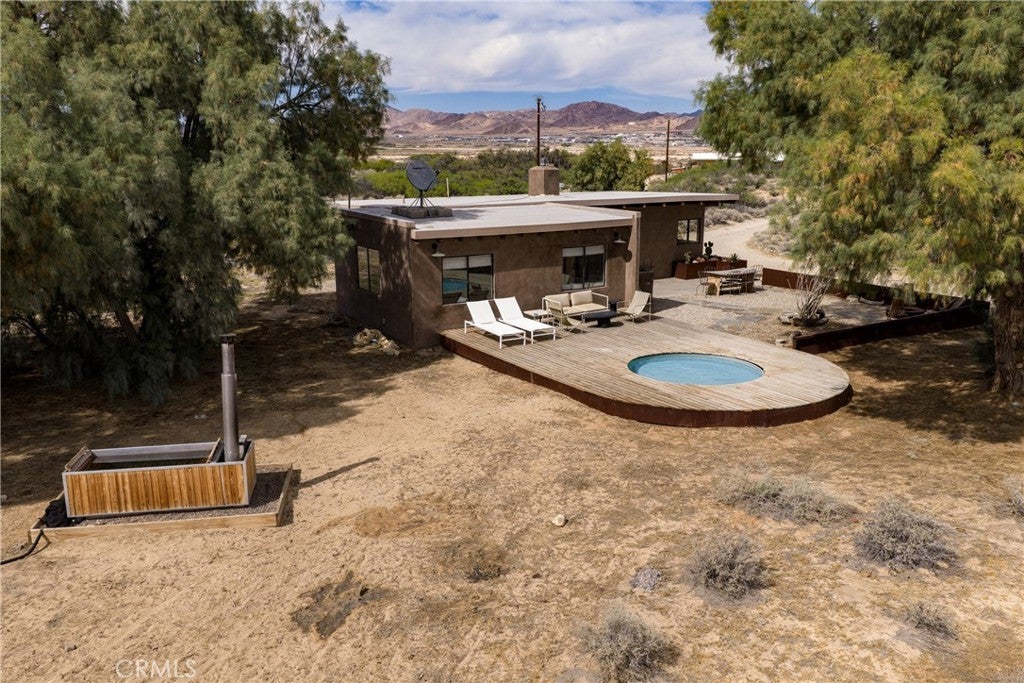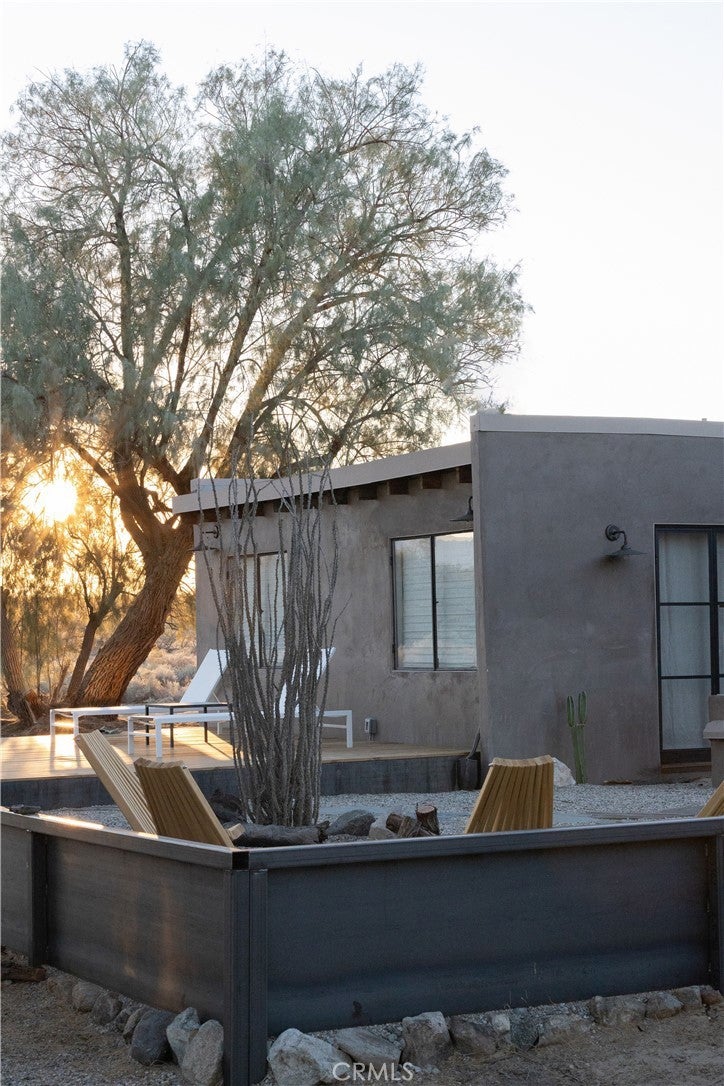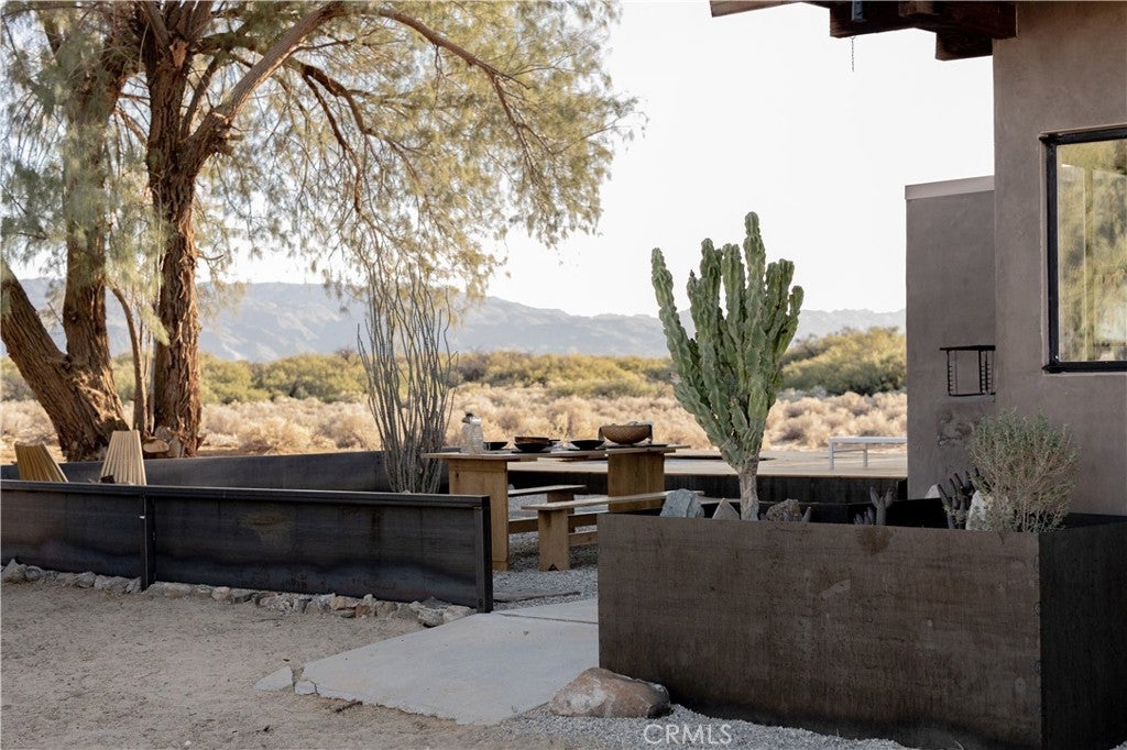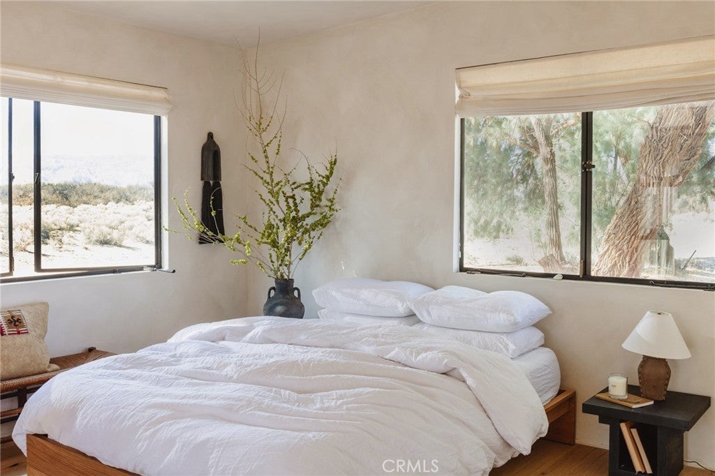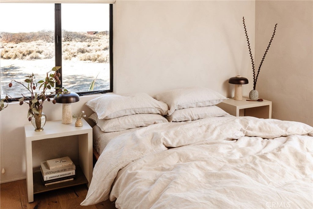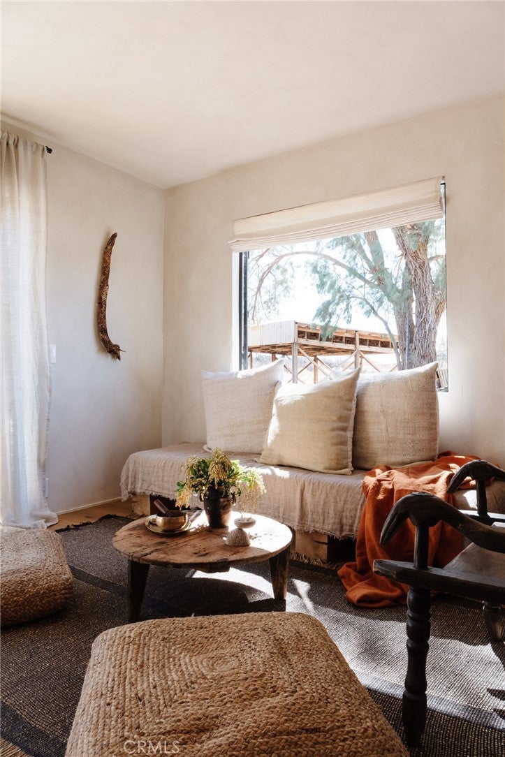 Arro Dunes, created by Studio Marrant Interiors, is a renovated 1957 homestead set on 10 acres in Desert Heights with lush mesquite dunes and trees surrounding the property, operating as an active, successful short-term rental that generated $75,000 gross income in 2025 (buyer to verify). The 2-bedroom, 1-bath home blends organic materials, wabi-sabi influence, and minimalist style with carefully curated antiques, custom-built finishes, and modern comforts. Dual bi-fold French doors open to the desert landscape and sweeping 360-degree mountain views. Featured in Condé Nast Traveler, Coveteur and The Makers book by Bed Threads, the home offers a distinctive desert experience with thoughtful design and a strong visual identity. The spacious bedroom includes a sitting area/tea room, while the original brick fireplace with steel hood remains a standout architectural feature in the living room. Outdoor amenities include a wood-burning hot tub, cowboy pool, fire pit, outdoor dining area, bocce ball court, and horseshoe pit. Additional features include A/C and heat in every room, WiFi, projector entertainment system, and a thoughtfully outfitted kitchen with premium appliances. Turn key with designer furnishings excluding some personal items. Conveniently located near the eastern entrance of Joshua Tree National Park and just minutes from downtown Twentynine Palms, with local dining, shopping, and the Sunday farmers market nearby. Ideal as a second home, short-term rental investment, or full-time primary residence.