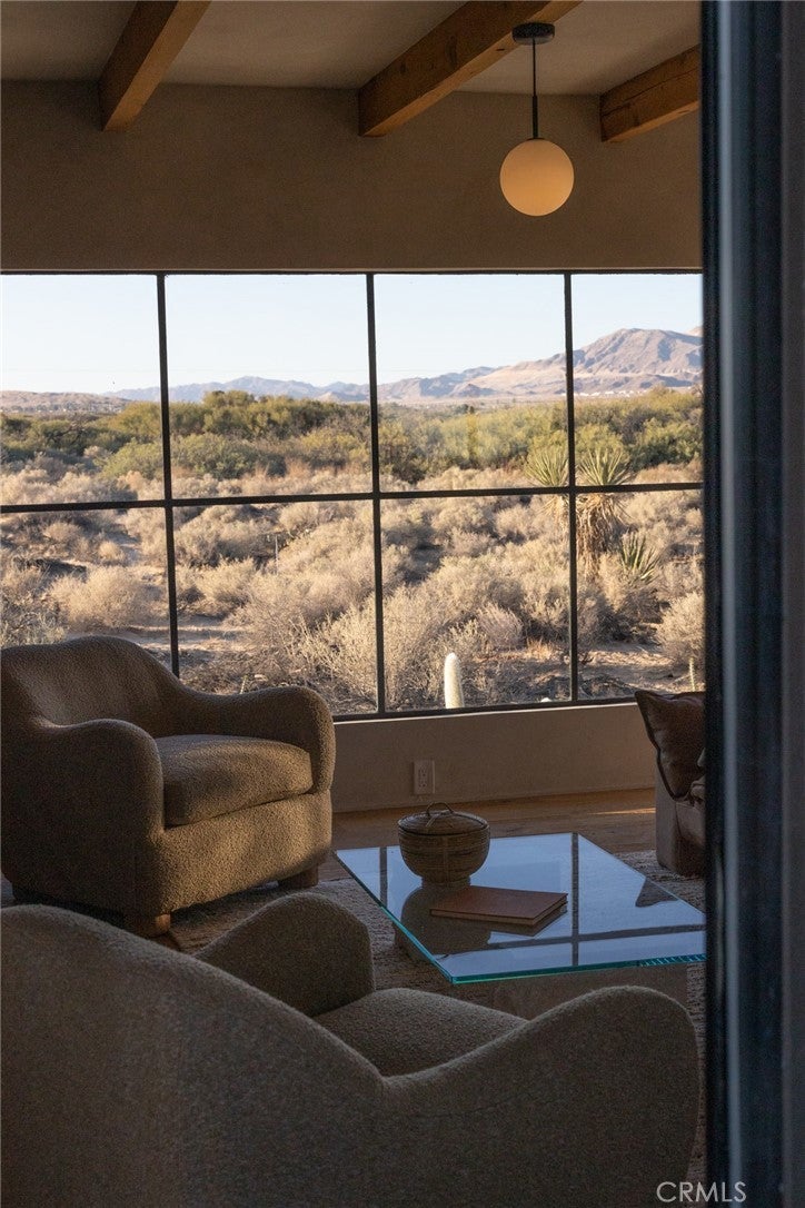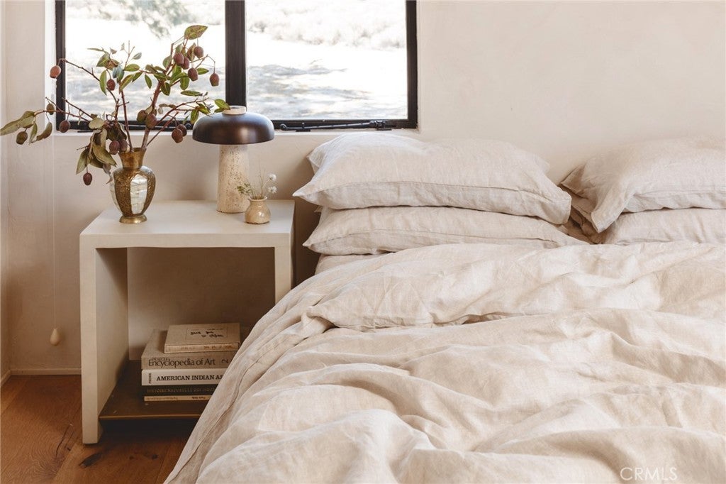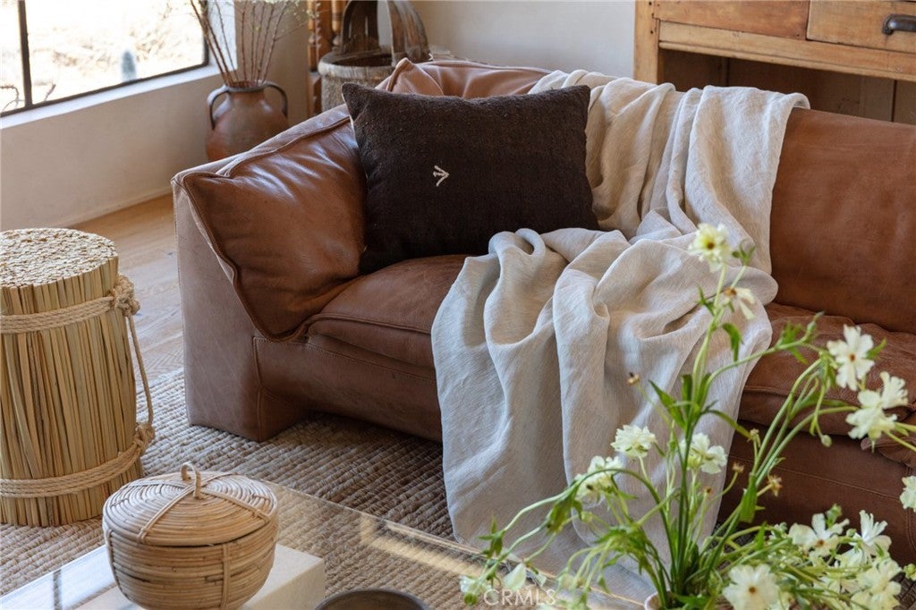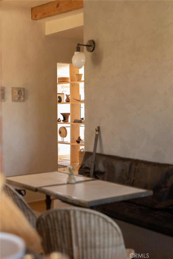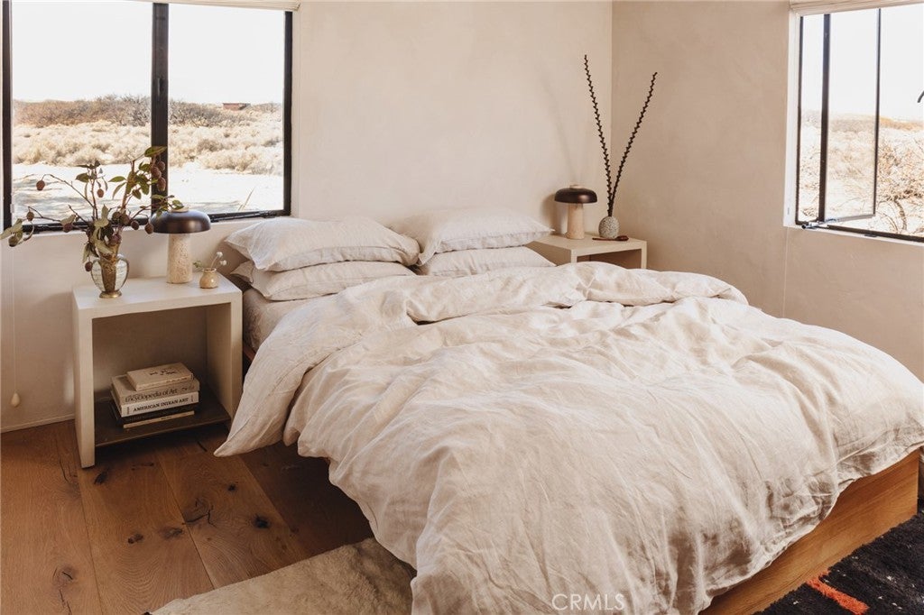 Arro Dunes, created by Studio Marrant Interiors, is a renovated 1957 homestead set on 10 acres in Desert Heights with lush mesquite dunes and trees surrounding the property, operating as an active, successful short-term rental that generated $75,000 gross income in 2025 (buyer to verify). The 2-bedroom, 1-bath home blends organic materials, wabi-sabi influence, and minimalist style with carefully curated antiques, custom-built finishes, and modern comforts. Dual bi-fold French doors open to the desert landscape and sweeping 360-degree mountain views. Featured in Condé Nast Traveler, Coveteur and The Makers book by Bed Threads, the home offers a distinctive desert experience with thoughtful design and a strong visual identity. The spacious bedroom includes a sitting area/tea room, while the original brick fireplace with steel hood remains a standout architectural feature in the living room. Outdoor amenities include a wood-burning hot tub, cowboy pool, fire pit, outdoor dining area, bocce ball court, and horseshoe pit. Additional features include A/C and heat in every room, WiFi, projector entertainment system, and a thoughtfully outfitted kitchen with premium appliances. Turn key with designer furnishings excluding some personal items. Conveniently located near the eastern entrance of Joshua Tree National Park and just minutes from downtown Twentynine Palms, with local dining, shopping, and the Sunday farmers market nearby. Ideal as a second home, short-term rental investment, or full-time primary residence.