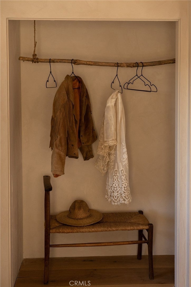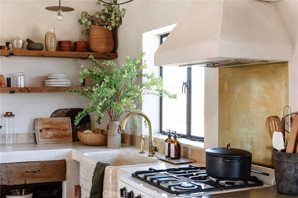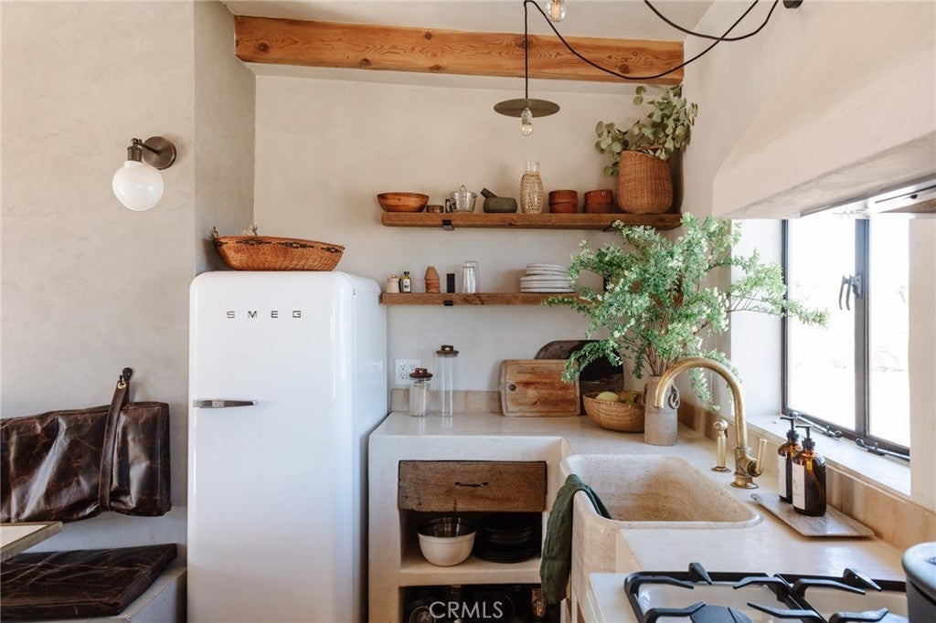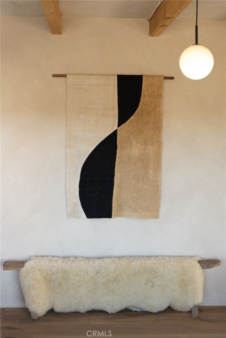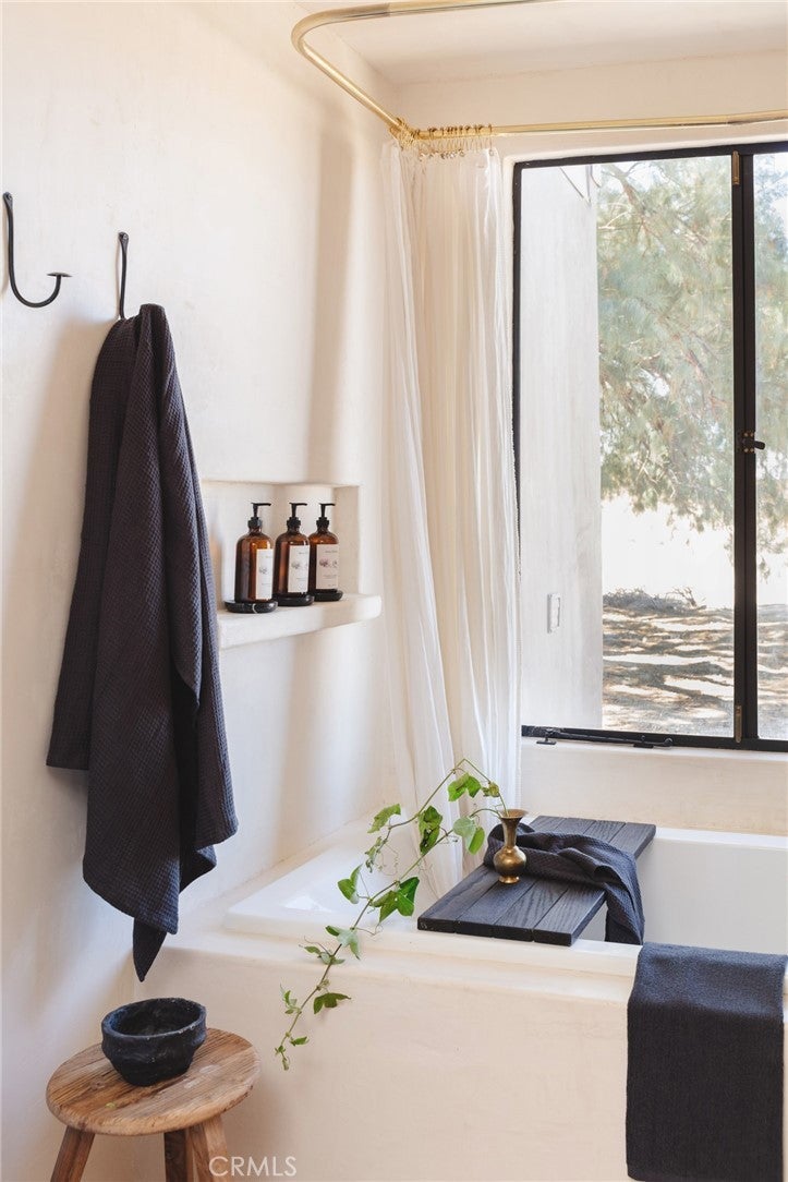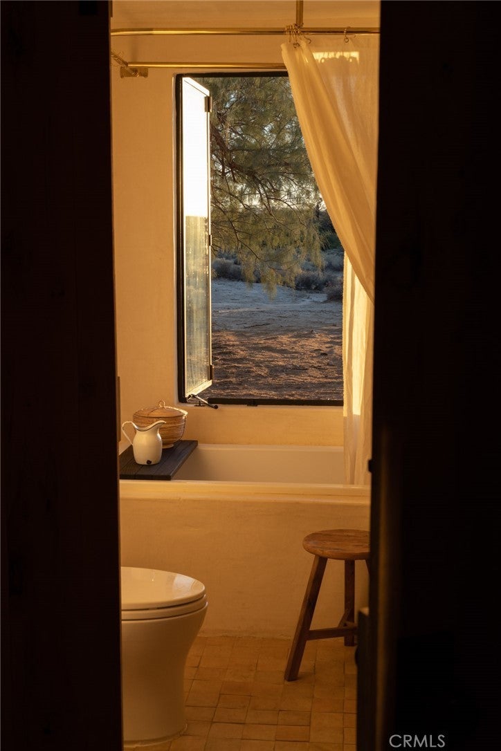 Arro Dunes, created by Studio Marrant Interiors, is a renovated 1957 homestead set on 10 acres in Desert Heights with lush mesquite dunes and trees surrounding the property, operating as an active, successful short-term rental that generated $75,000 gross income in 2025 (buyer to verify). The 2-bedroom, 1-bath home blends organic materials, wabi-sabi influence, and minimalist style with carefully curated antiques, custom-built finishes, and modern comforts. Dual bi-fold French doors open to the desert landscape and sweeping 360-degree mountain views. Featured in Condé Nast Traveler, Coveteur and The Makers book by Bed Threads, the home offers a distinctive desert experience with thoughtful design and a strong visual identity. The spacious bedroom includes a sitting area/tea room, while the original brick fireplace with steel hood remains a standout architectural feature in the living room. Outdoor amenities include a wood-burning hot tub, cowboy pool, fire pit, outdoor dining area, bocce ball court, and horseshoe pit. Additional features include A/C and heat in every room, WiFi, projector entertainment system, and a thoughtfully outfitted kitchen with premium appliances. Turn key with designer furnishings excluding some personal items. Conveniently located near the eastern entrance of Joshua Tree National Park and just minutes from downtown Twentynine Palms, with local dining, shopping, and the Sunday farmers market nearby. Ideal as a second home, short-term rental investment, or full-time primary residence.