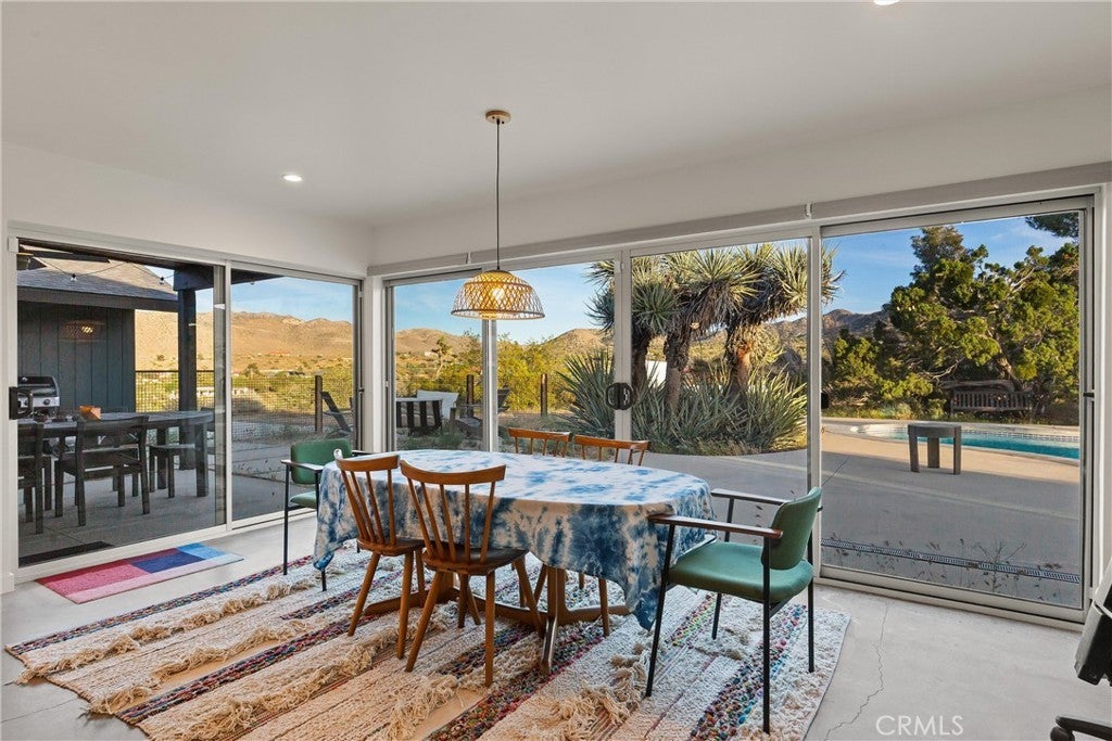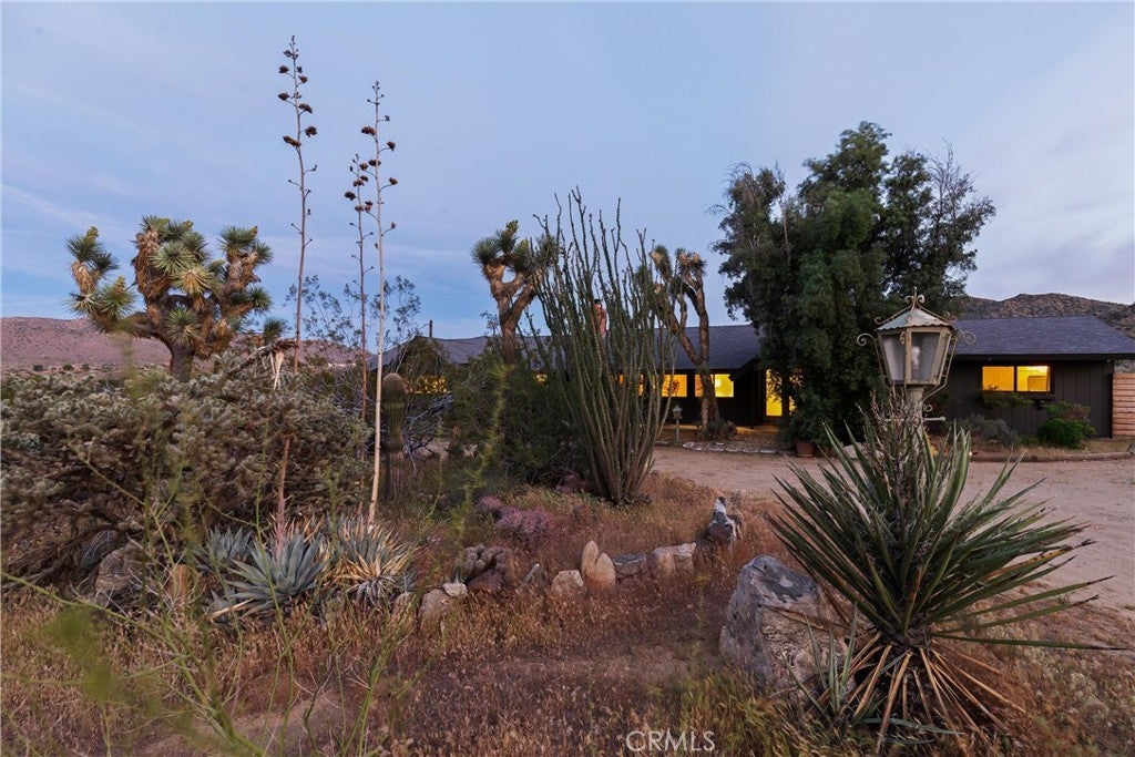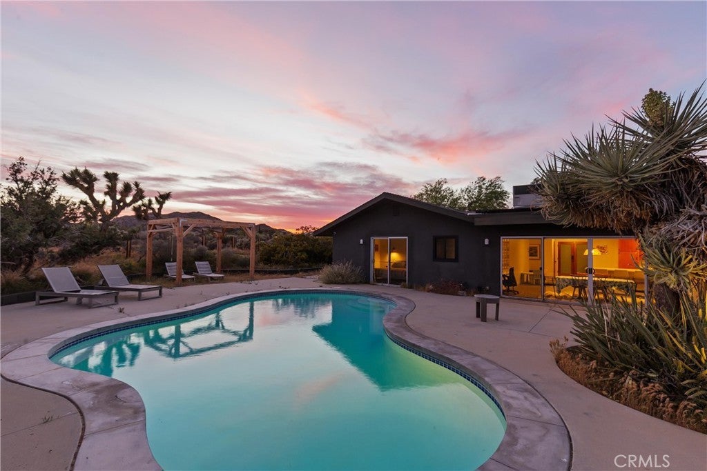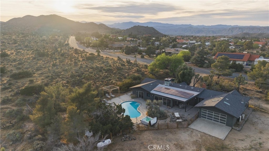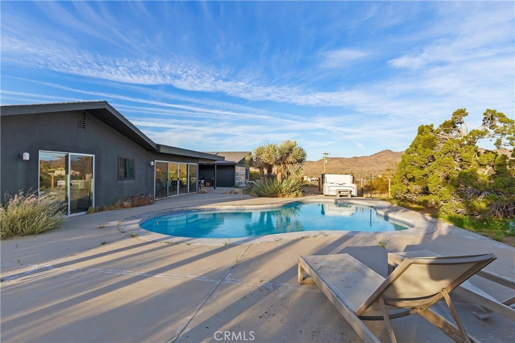Set on 1.65 acres with unobstructed views toward Joshua Tree National Park, this thoughtfully updated ranch home offers privacy, comfort, and an easy connection to the surrounding desert. Clean, tasteful updates complement the home’s original character, including a handmade vintage rock fireplace that anchors the main living space. The spacious kitchen features rich hardwood cabinetry, generous storage, and room to cook, gather, and entertain. The layout includes three bedrooms, two and a half bathrooms, a separate office, an oversized bonus room currently used as a private screening room, and an attached finished studio that could also serve as a workshop or high-finish garage. An owned solar system adds long-term value, and every day efficiency. Outside, mature desert landscaping, sculptural cactus, and established trees create a beautifully grounded setting. The pool and spa sit beneath open skies, while the open land beyond and trail access just past the back gate give the property a rare sense of space and privacy. Set in a great location with easy access to town, the national park, and the best of the area, this is a home that works beautifully as a full-time residence, second home, or standout short-term rental.