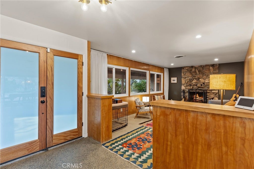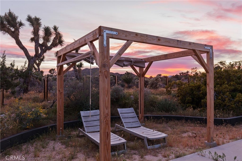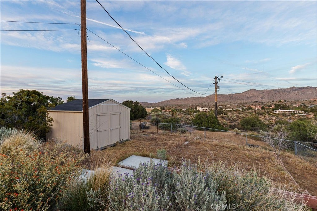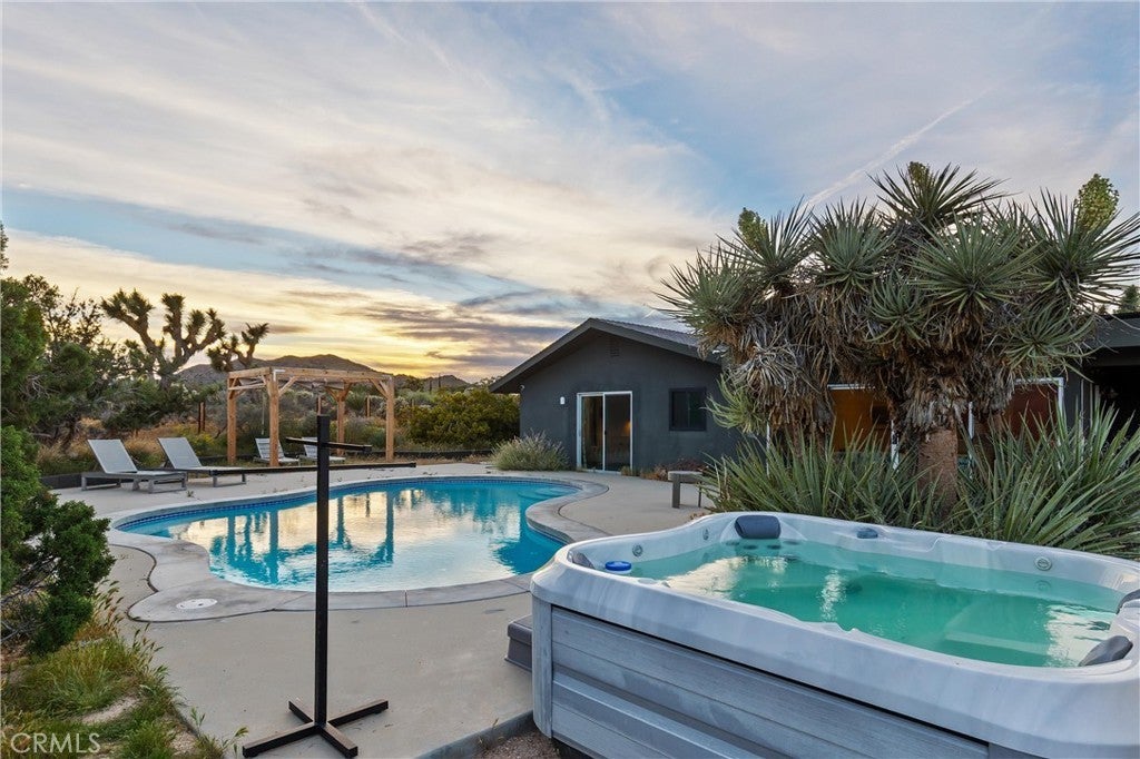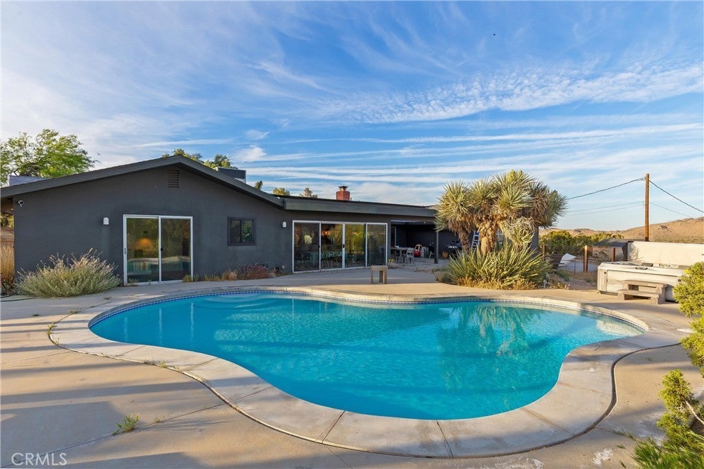 Set on 1.65 acres with unobstructed views toward Joshua Tree National Park, this thoughtfully updated ranch home offers privacy, comfort, and an easy connection to the surrounding desert. Clean, tasteful updates complement the home’s original character, including a handmade vintage rock fireplace that anchors the main living space. The spacious kitchen features rich hardwood cabinetry, generous storage, and room to cook, gather, and entertain. The layout includes three bedrooms, two and a half bathrooms, a separate office, an oversized bonus room currently used as a private screening room, and an attached finished studio that could also serve as a workshop or high-finish garage. An owned solar system adds long-term value, and every day efficiency. Outside, mature desert landscaping, sculptural cactus, and established trees create a beautifully grounded setting. The pool and spa sit beneath open skies, while the open land beyond and trail access just past the back gate give the property a rare sense of space and privacy. Set in a great location with easy access to town, the national park, and the best of the area, this is a home that works beautifully as a full-time residence, second home, or standout short-term rental.