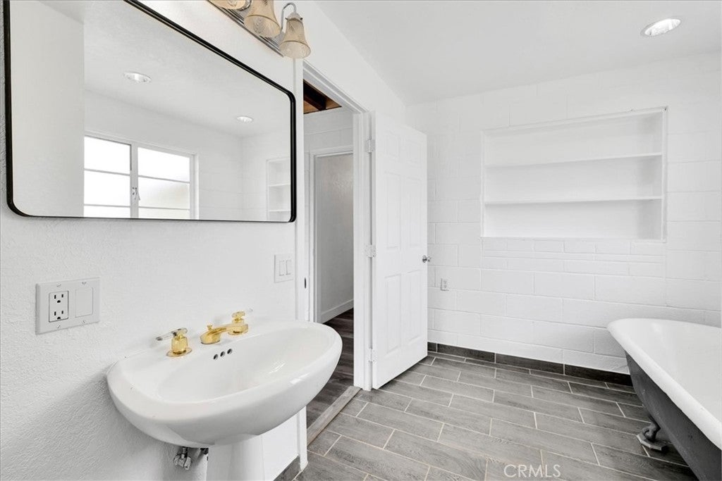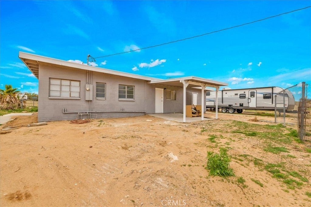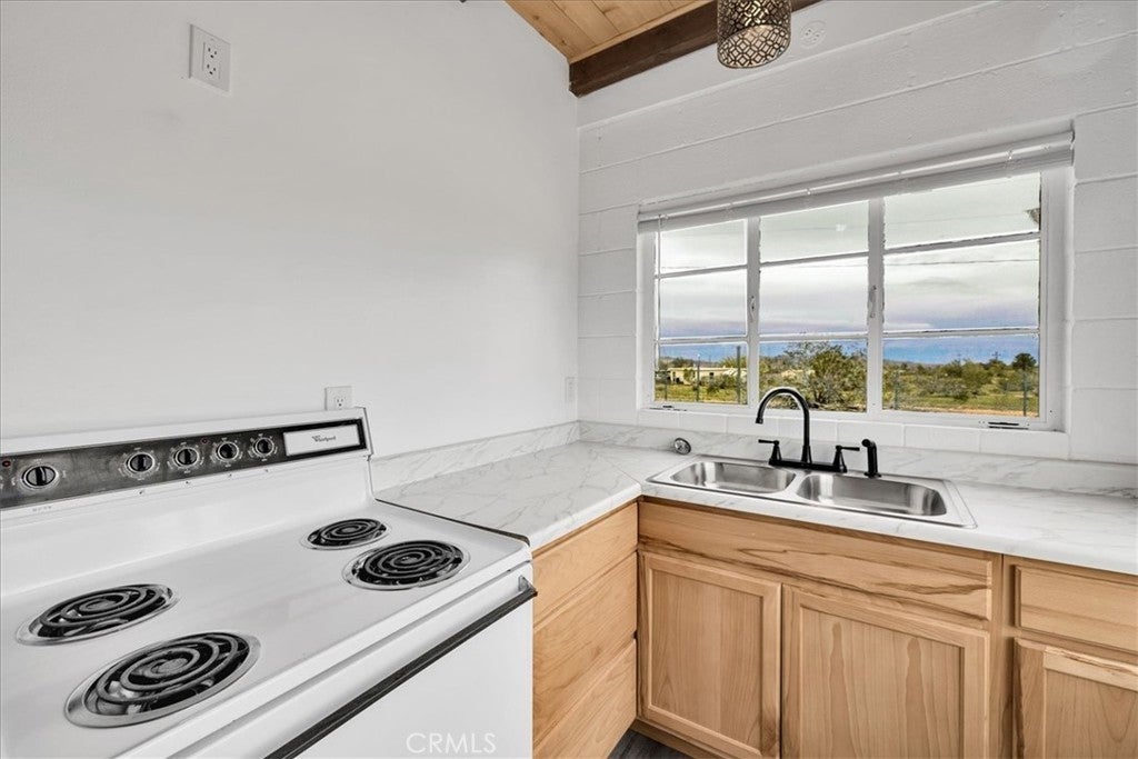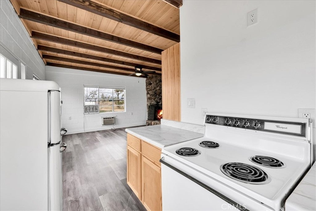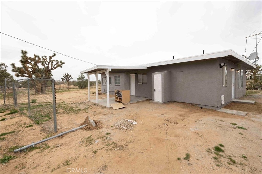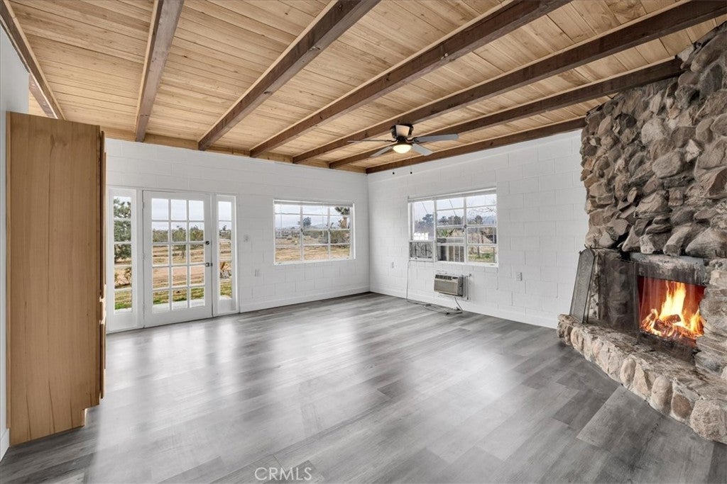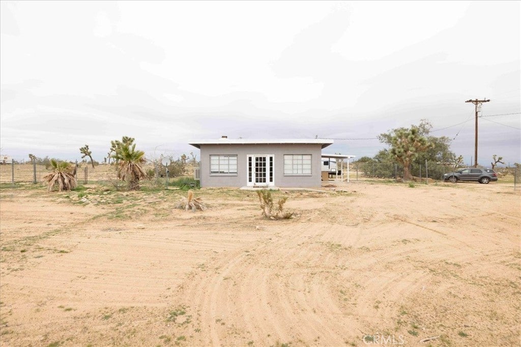 Set on 2 acres in the sought-after Flamingo Heights area of Yucca Valley, this 3 bedroom, 2 bath home offers space, privacy, and classic high desert character surrounded by mature Joshua trees and wide-open views. The expansive living room is a true centerpiece, featuring wood-beamed ceilings, wood-look flooring, built-in storage, and a dramatic stone hearth corner fireplace that anchors the space with warmth and charm. The kitchen is both functional and inviting, with quartz countertops, warm wood cabinetry, and large windows that bring in natural light and desert scenery. The primary bedroom is generously sized and filled with light, complete with a ceiling fan and an attached bath featuring a jetted tub/shower combo and a stylish basin sink. A comfortable guest bedroom includes two closets for ample storage, while the second bathroom stands out with a claw foot tub, a separate quartz-enclosed shower, and a pedestal sink. The third bedroom offers large windows and its own outdoor access, making it ideal for guests, a home office, or creative space. Outside, the property showcases mature Joshua trees, open desert surroundings, and sweeping views that define the Flamingo Heights lifestyle. With room to roam and a layout that blends rustic appeal with thoughtful updates, this home is a peaceful desert retreat with timeless character.