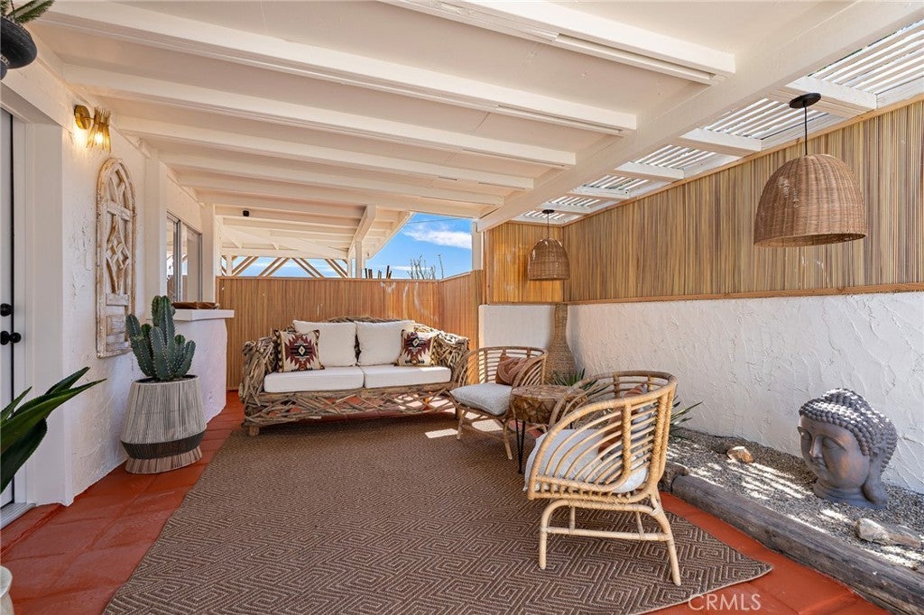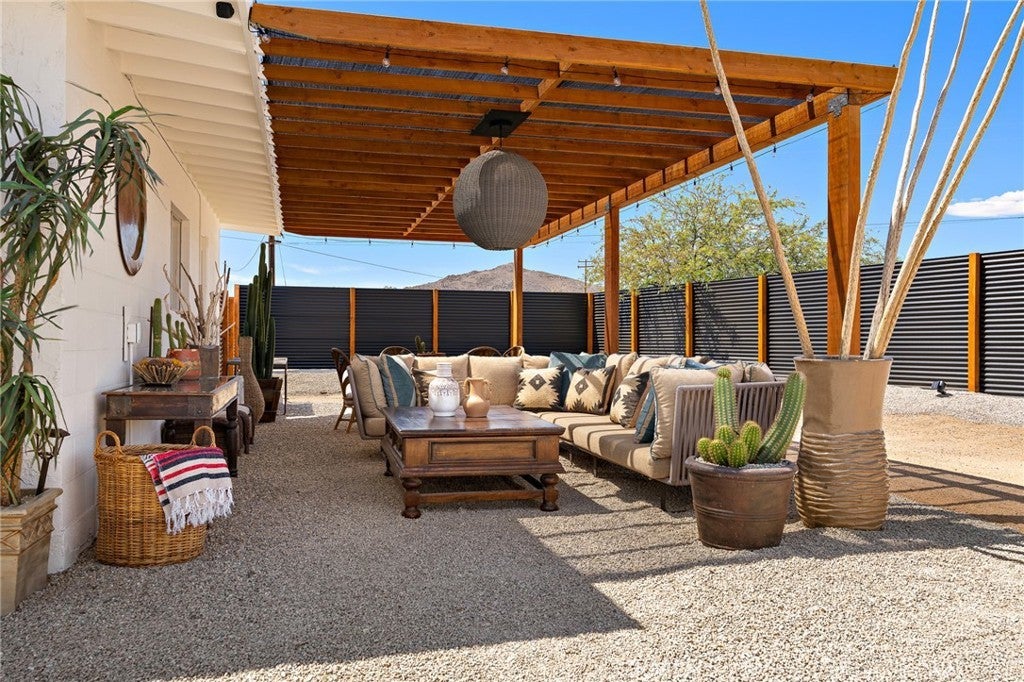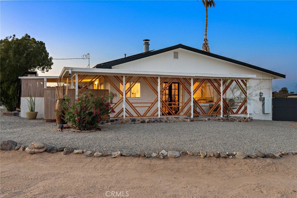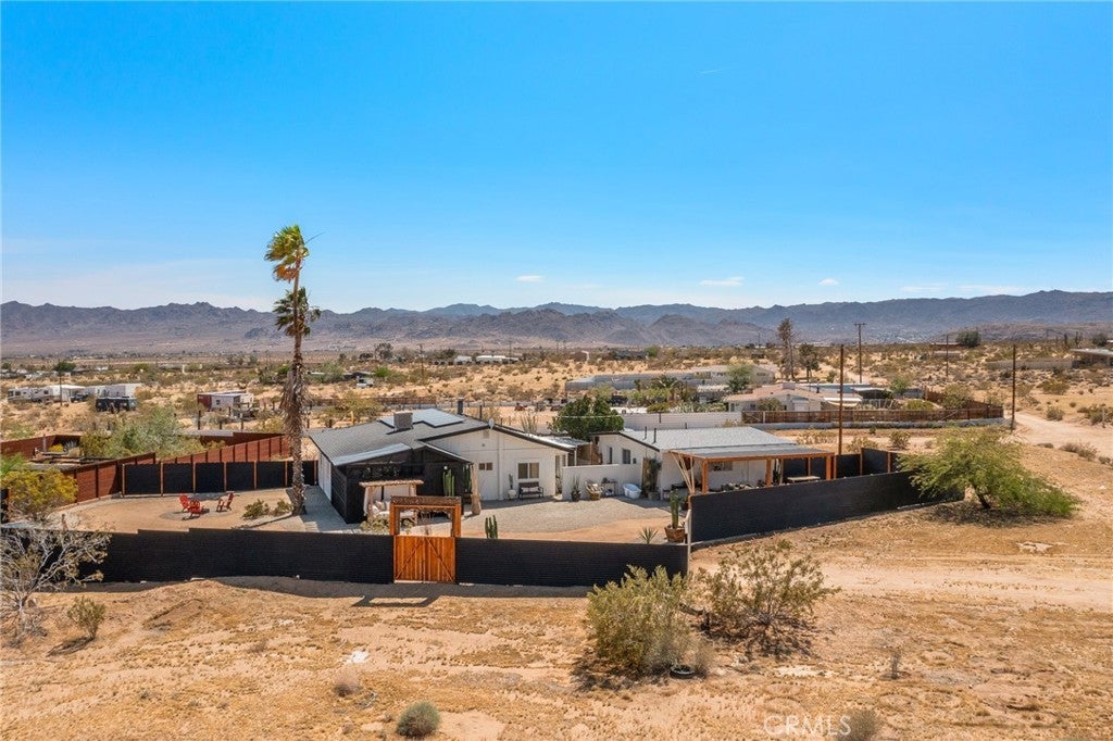 Set on 4.5 acres just minutes from the heart of Joshua Tree, this charming two-bedroom home offers a rare blend of character, space, and quiet desert beauty. Tucked away with paved road access yet only five minutes from downtown shops and dining, it’s the kind of place that feels both connected and completely your own. Inside, the home has been thoughtfully updated with a remodeled kitchen and bathroom, new flooring, and a warm, cohesive design that honors its original charm. Natural light pours in from every angle, filling the space with an easy, inviting energy throughout the day. The primary bedroom opens to a unique outdoor atrium—an intimate, private space that blurs the line between indoors and out. The home is equipped with solar, helping to offset energy costs and enhance overall efficiency. The garage has been reimagined into a flexible bonus space, ideal for a home office, creative studio, or overflow guest quarters, enhancing both form and function. Outdoor living is where this property truly comes to life. A large front porch overlooks the National Park ridgeline, offering a front-row seat to moonrise and ever-changing desert skies. The grounds are dotted with thoughtfully designed spaces, including a private front courtyard and a landscaped backyard that invite creativity and quiet moments in nature. Unwind beneath the shaded pergola, soak in the outdoor tub under a sky full of stars, and take in endless sunset views across the open land. With multiple outdoor environments designed for relaxation and inspiration, this property lends itself beautifully to a vacation home or high-performing short-term rental. With room to expand, explore, or simply breathe, this is a place to slow down and settle into the rhythm of Joshua Tree living.