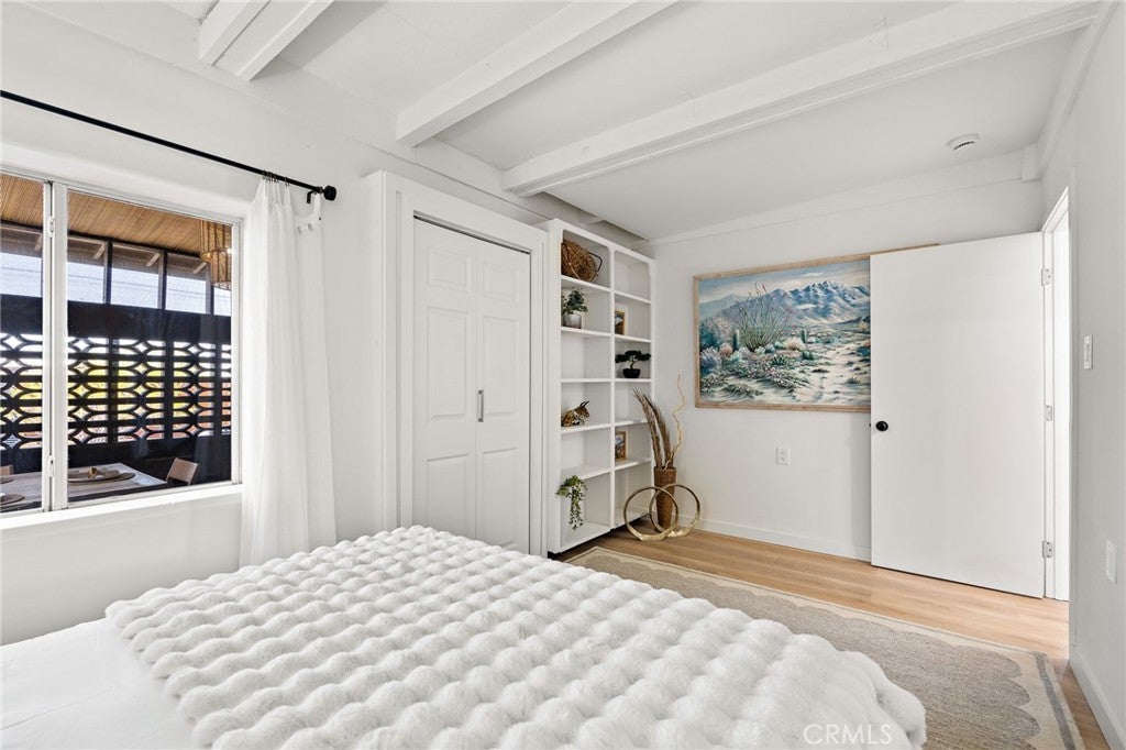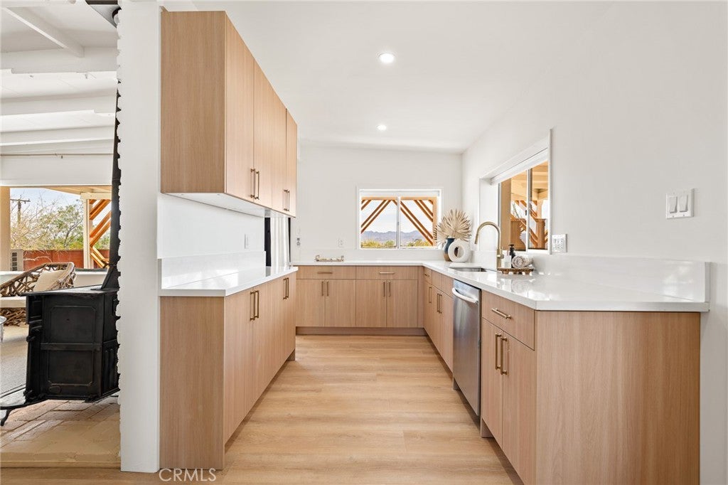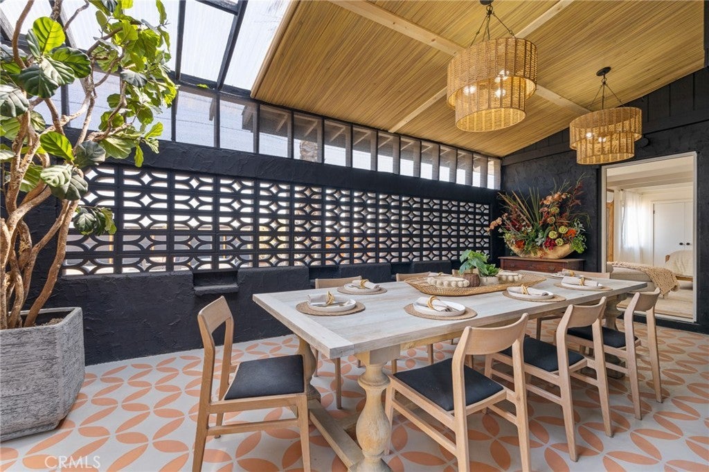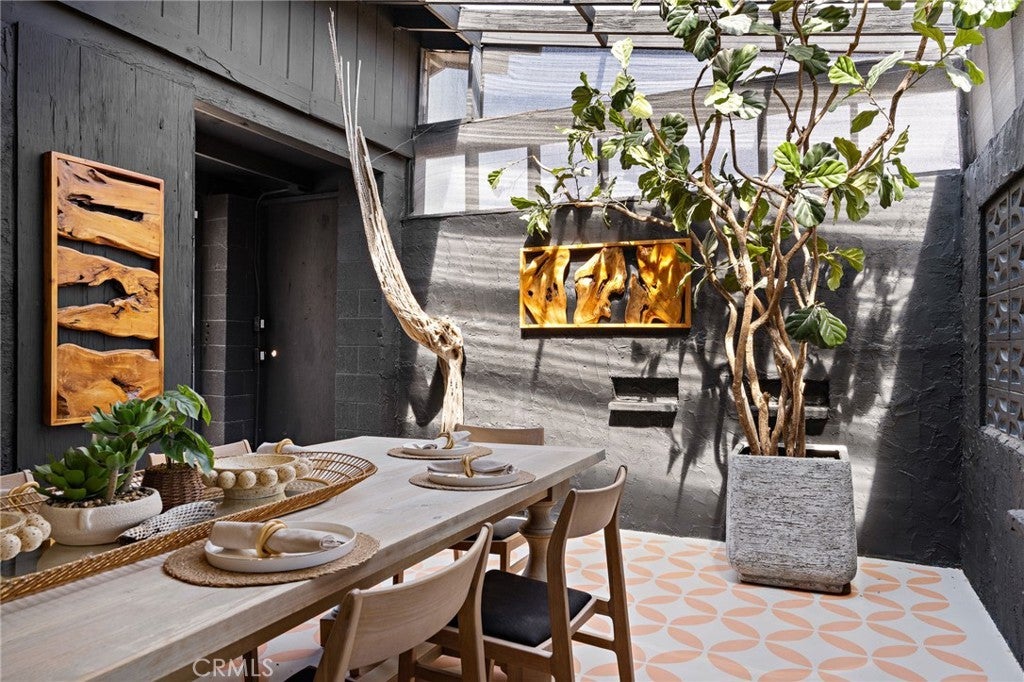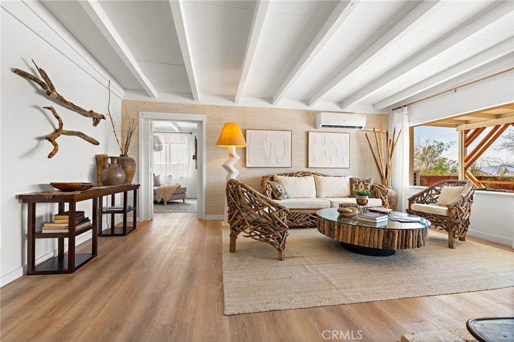 Set on 4.5 acres just minutes from the heart of Joshua Tree, this charming two-bedroom home offers a rare blend of character, space, and quiet desert beauty. Tucked away with paved road access yet only five minutes from downtown shops and dining, it’s the kind of place that feels both connected and completely your own. Inside, the home has been thoughtfully updated with a remodeled kitchen and bathroom, new flooring, and a warm, cohesive design that honors its original charm. Natural light pours in from every angle, filling the space with an easy, inviting energy throughout the day. The primary bedroom opens to a unique outdoor atrium—an intimate, private space that blurs the line between indoors and out. The home is equipped with solar, helping to offset energy costs and enhance overall efficiency. The garage has been reimagined into a flexible bonus space, ideal for a home office, creative studio, or overflow guest quarters, enhancing both form and function. Outdoor living is where this property truly comes to life. A large front porch overlooks the National Park ridgeline, offering a front-row seat to moonrise and ever-changing desert skies. The grounds are dotted with thoughtfully designed spaces, including a private front courtyard and a landscaped backyard that invite creativity and quiet moments in nature. Unwind beneath the shaded pergola, soak in the outdoor tub under a sky full of stars, and take in endless sunset views across the open land. With multiple outdoor environments designed for relaxation and inspiration, this property lends itself beautifully to a vacation home or high-performing short-term rental. With room to expand, explore, or simply breathe, this is a place to slow down and settle into the rhythm of Joshua Tree living.