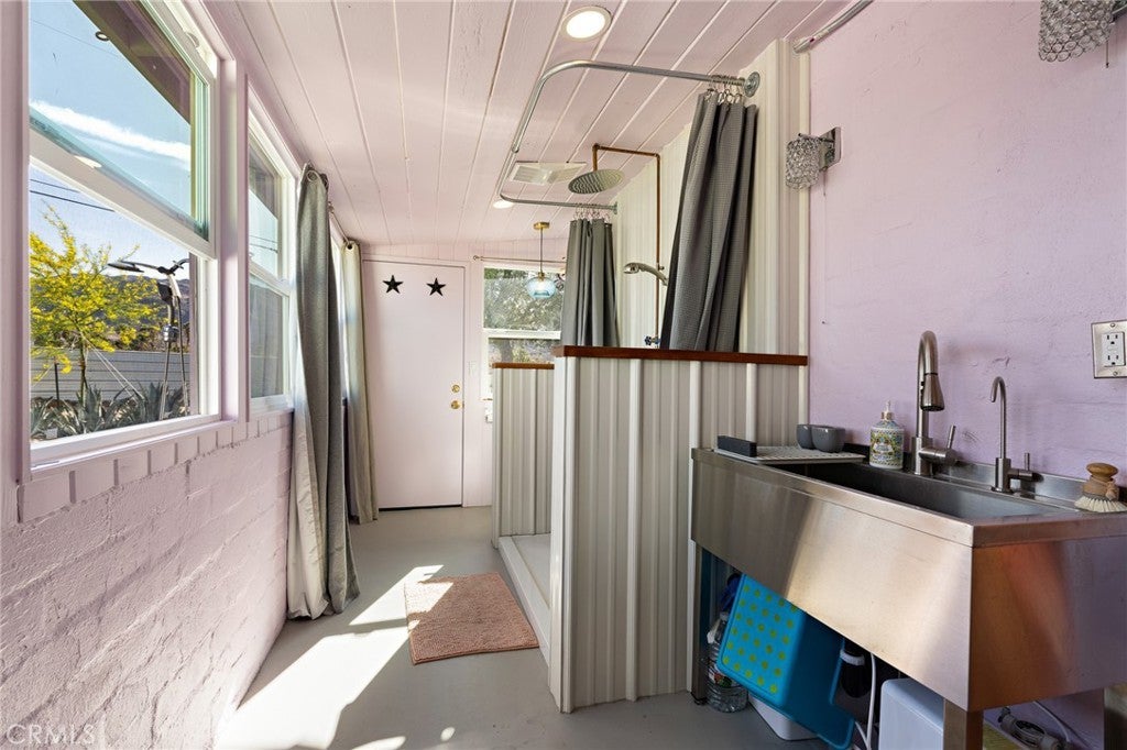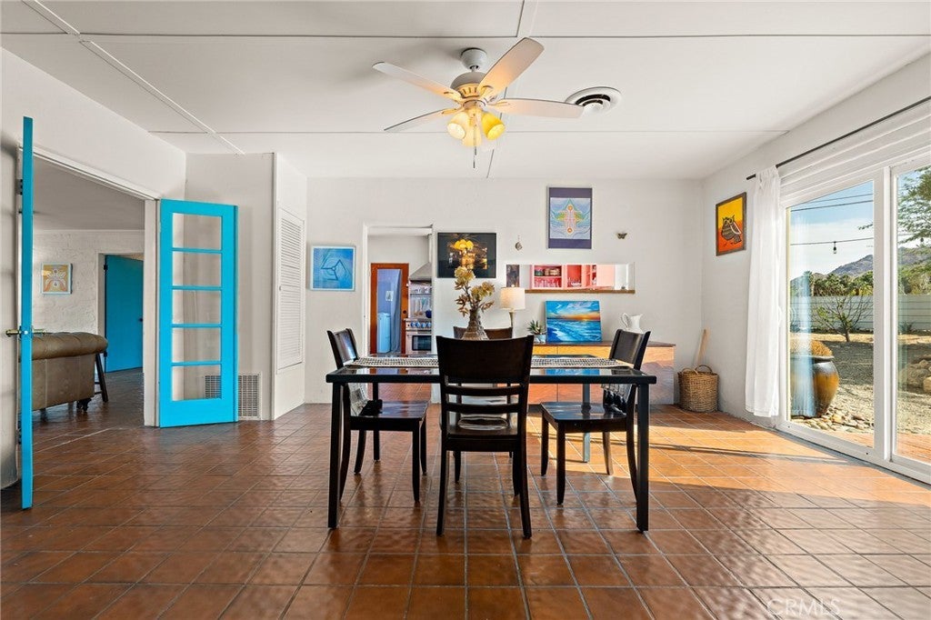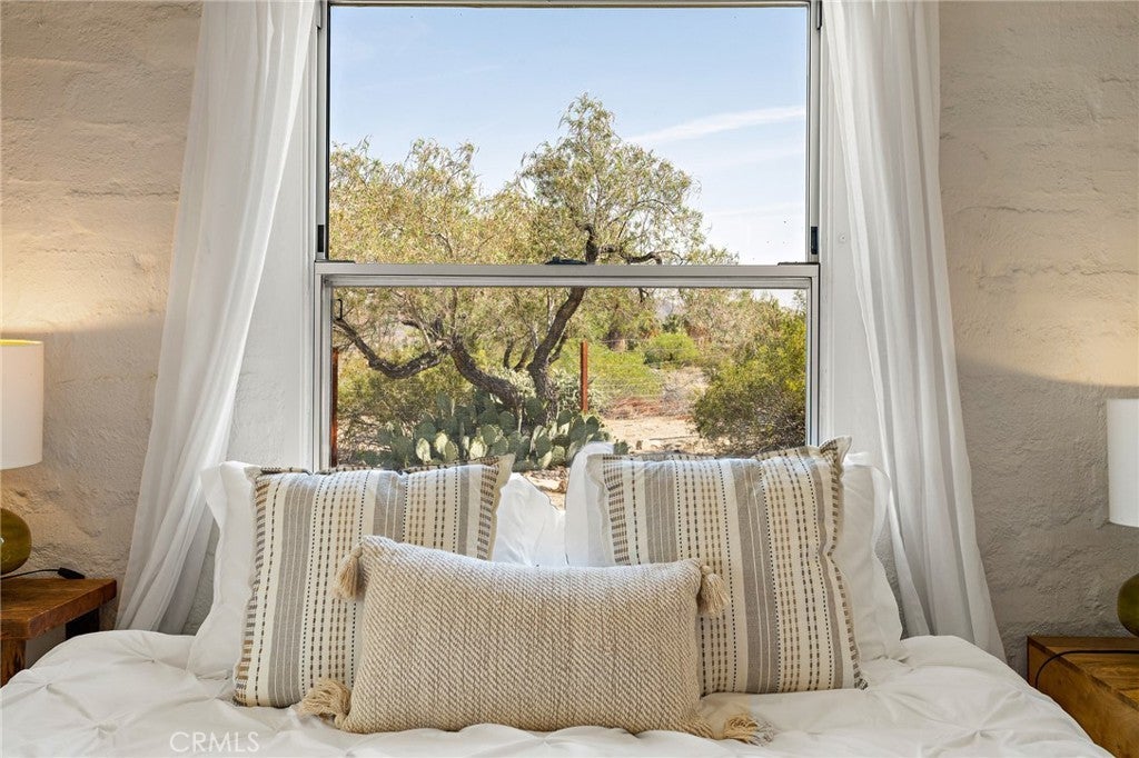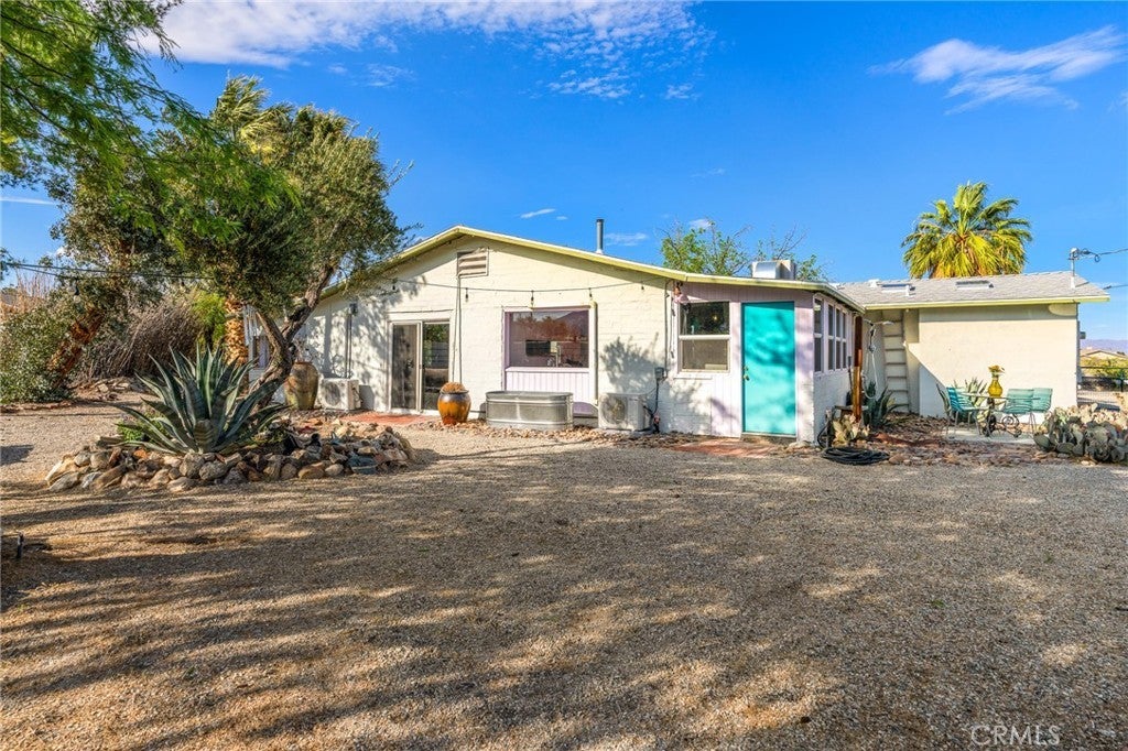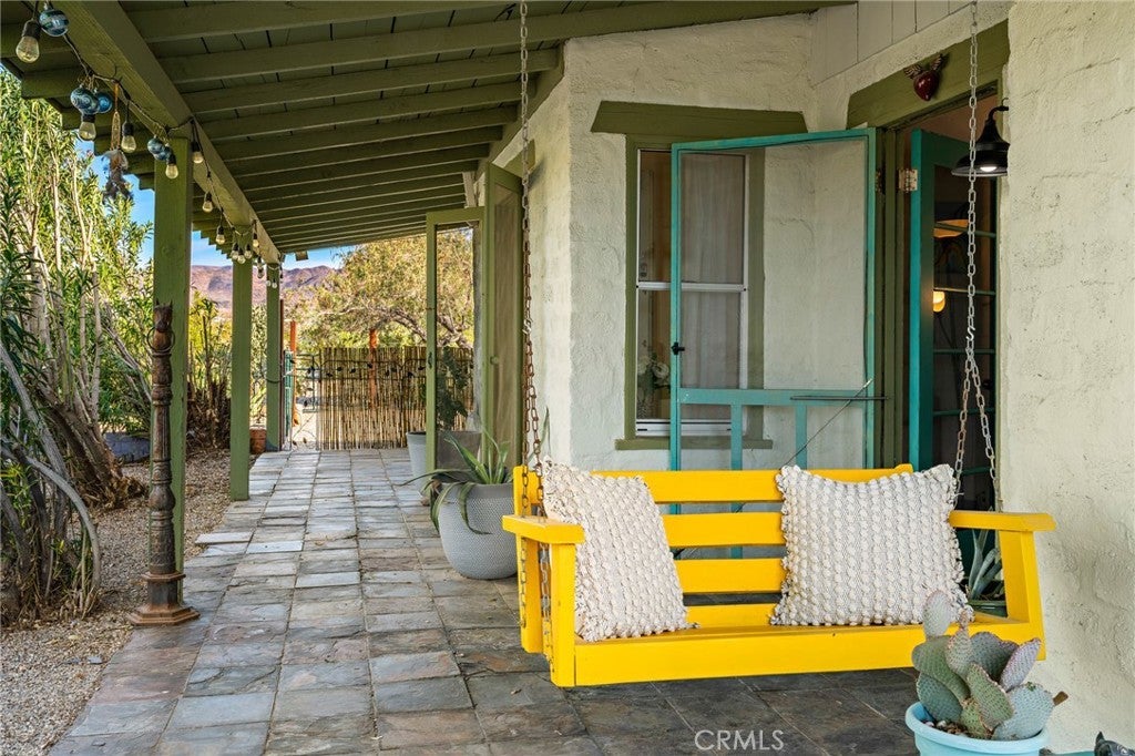HISTORIC 1938 ADOBE: This architecturally significant property – featured in Historic Adobe Homes magazine – offers timeless desert appeal. Located within walking distance to the iconic 29 Palms Inn, Kitchen in the Desert and downtown Twentynine Palms, providing a rare opportunity to own an authentic adobe home in one of the town’s most desirable settings. Situated on a .51-acre triangular parcel uniquely positioned so the point of the lot faces directly toward the iconic Oasis of Mara, creating a setting that feels deeply connected to this remarkable natural landmark. Set against the mountains in a prime Twentynine Palms location, the property enjoys beautiful back views of the mature palm groves, with towering palms, mature trees, cactus gardens, and a peaceful breeze from the nearby natural spring pond adding to the sense of a true desert oasis. The home is surrounded by vacant lots on two sides, enhancing the sense of seclusion and making the parcel feel unusually expansive and private. This 3-bedroom, 2-bath home spans 1,491 square feet, with a layout that creates an easy connection to the outdoors, as most rooms have direct access outside, blending indoor and outdoor living. Recent improvements include new windows, a new water heater, a new kitchen counter, and new ductless mini-split heating/cooling system for efficient year-round comfort. The home also features a wood-burning fireplace for ambiance, a front porch facing open desert vistas and lush gardens for morning or evening beverages, in addition to an outdoor shower, private backyard, 4-car garage, and a 220V hookup ready for a future hot tub.