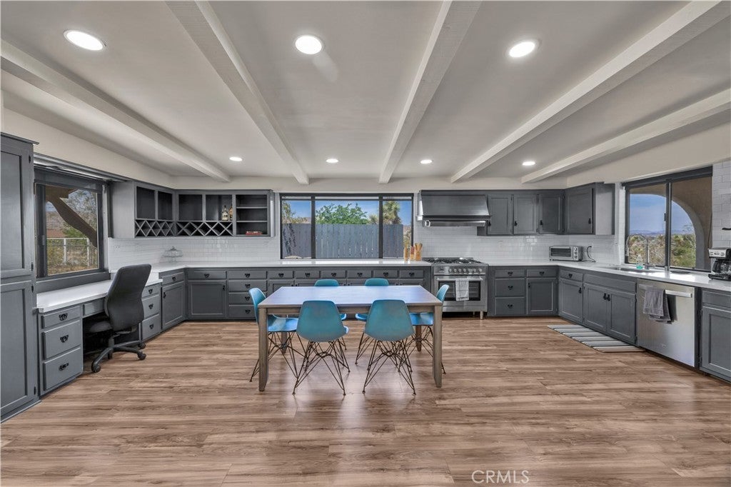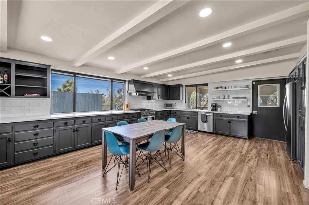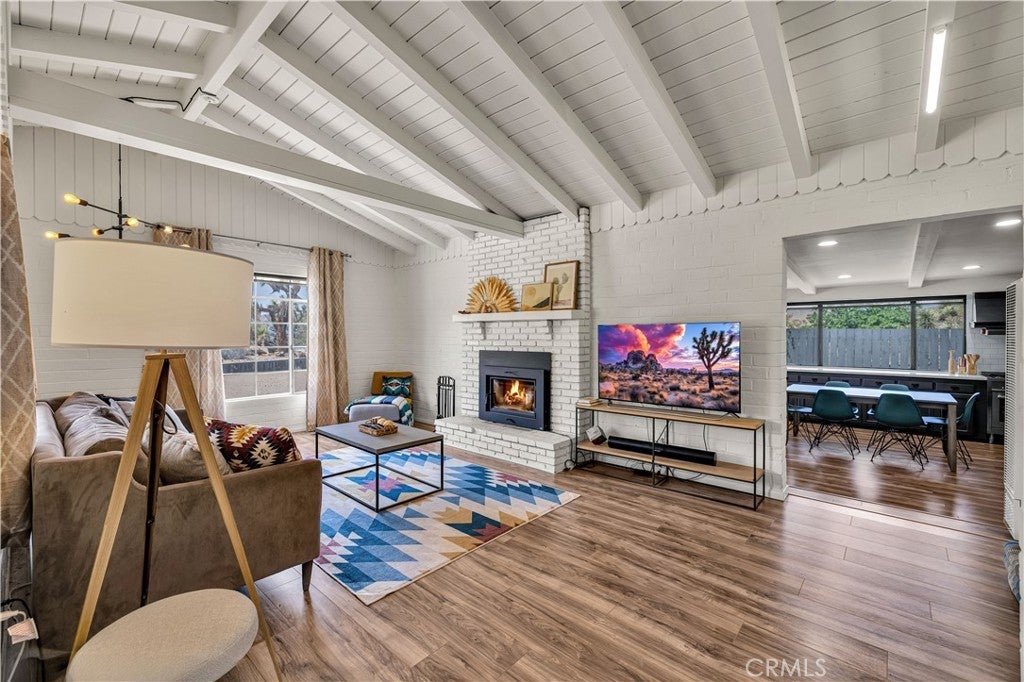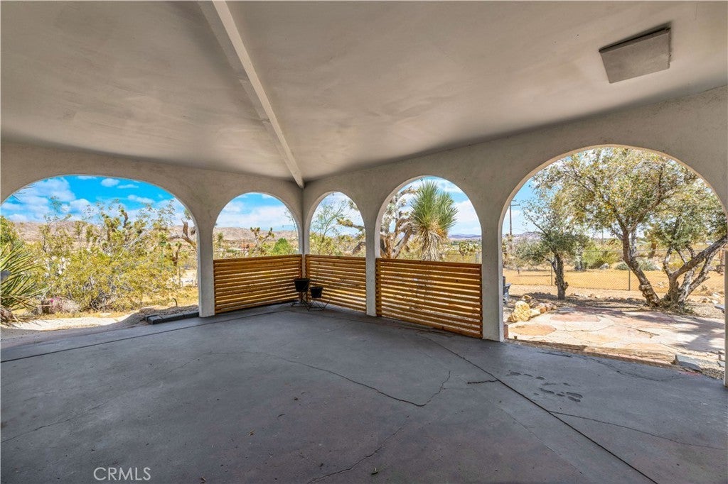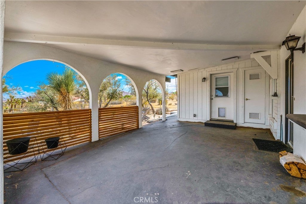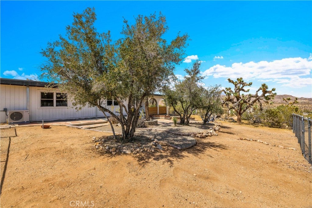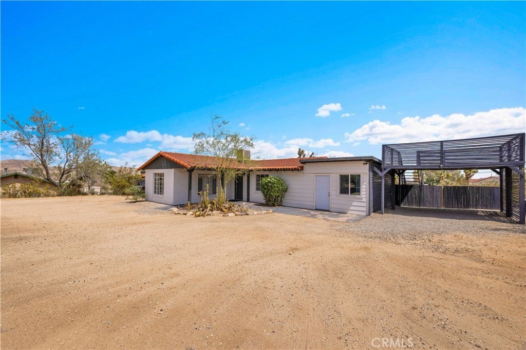 Wonderful Joshua Tree home full of character on a fully fenced 1.25-acre lot and on a paved road. This unique property blends natural desert beauty with thoughtful landscaping, creating a setting that feels perfectly integrated with its surroundings. As you arrive, you’ll appreciate the long driveway that runs through the property to the carport, offering plenty of space and functionality. The carport also serves as a dual-purpose observation deck, providing a great vantage point to take in the surrounding desert views. Step inside and you’ll immediately notice the home’s distinctive character, featuring masonry walls, tall vaulted ceilings, and an abundance of windows that fill the space with natural light. The living area includes a fireplace with a wood-burning stove insert, adding warmth and charm. The kitchen is exceptionally large, offering an impressive amount of cabinet storage, counter space, and quartz countertops. There is ample room for dining, and the view from the kitchen sink looks out to the backyard. Just beyond, the back patio is a standout feature, designed with large rounded archways that beautifully frame the natural desert landscape. All of the bedrooms are generously sized, and the home is equipped with mini-split systems throughout for efficient heating and cooling. The bathroom has been remodeled and features a large vanity with matching finishes to the kitchen along with a tile shower-tub combo. Outside, you’ll find multiple seating areas to relax and enjoy the peaceful surroundings, along with a cross-fenced section that is perfect for pets or added functionality. This is a rare opportunity to own a property that offers space, character, and a true connection to the Joshua Tree landscape.