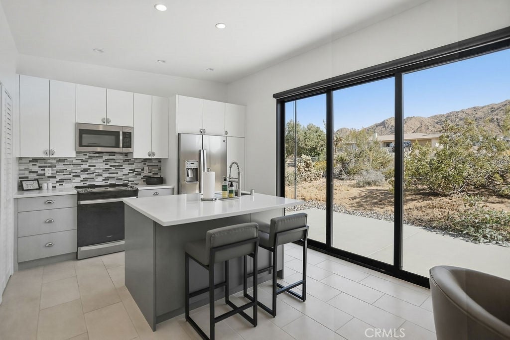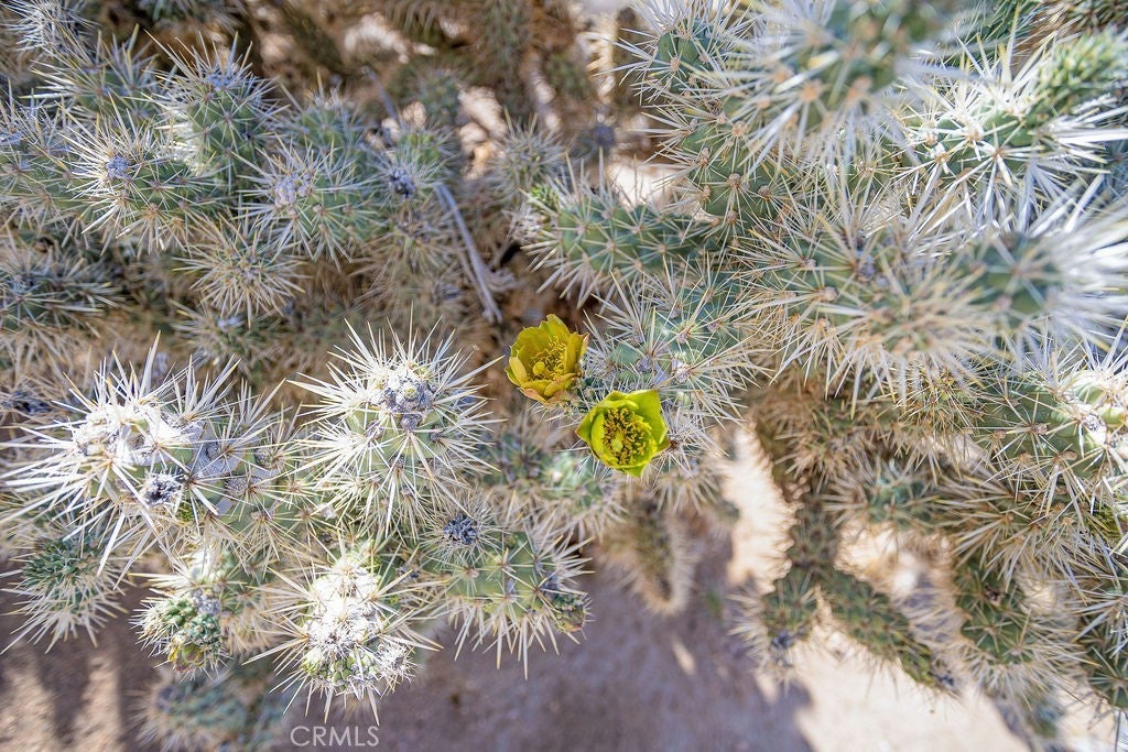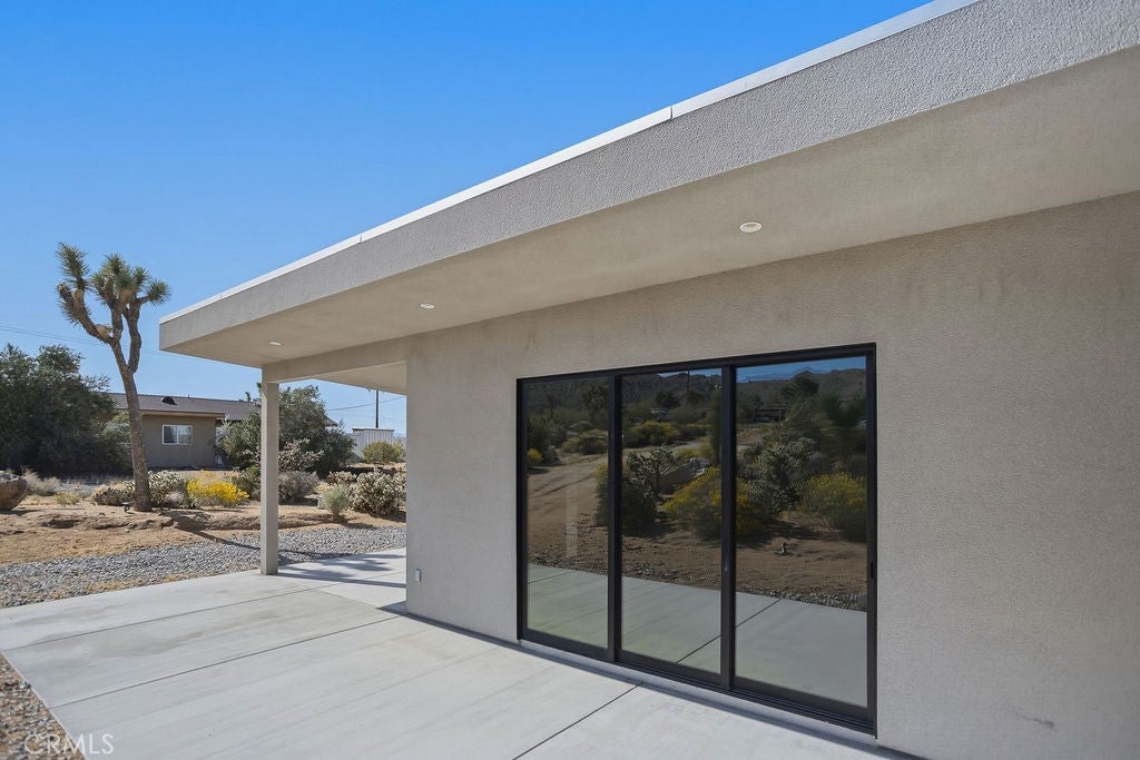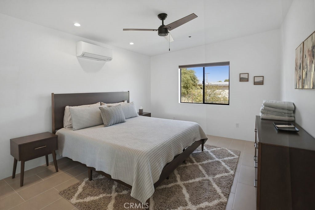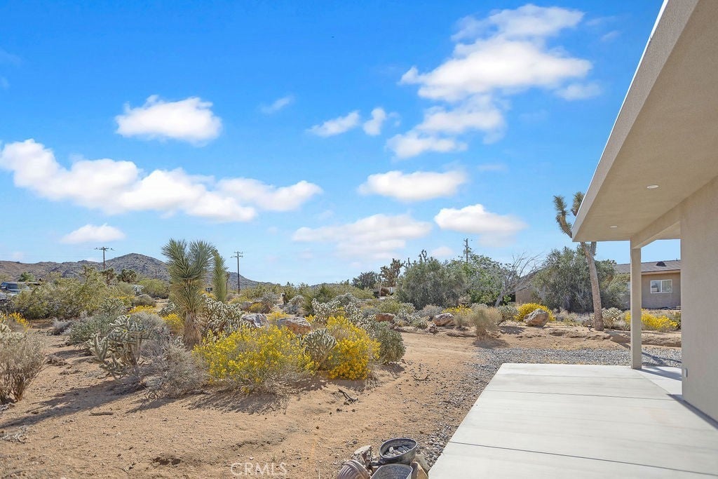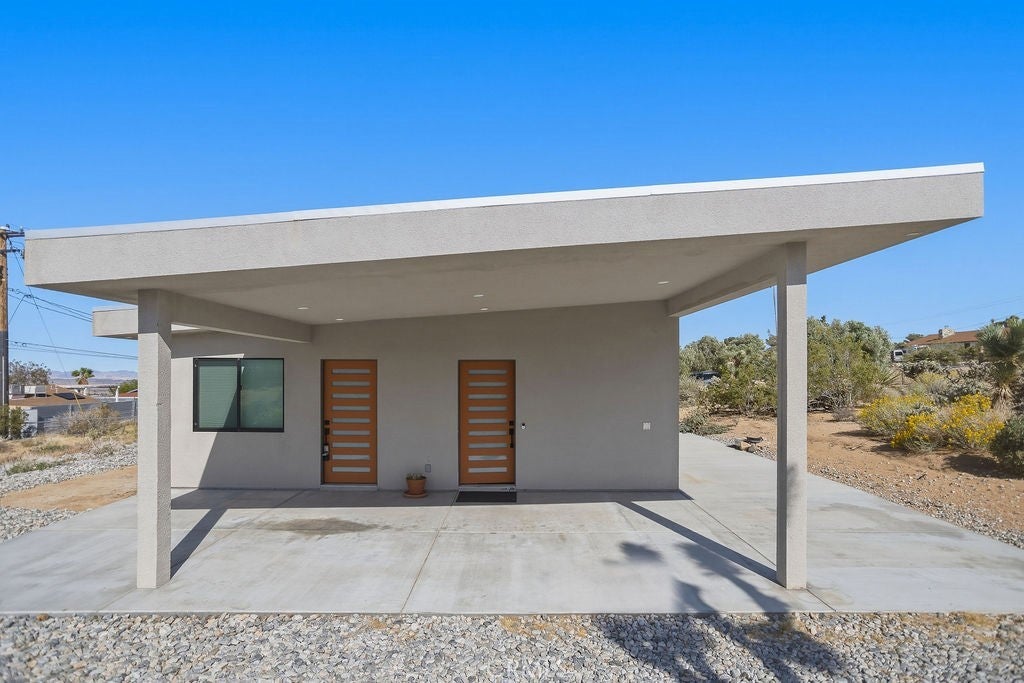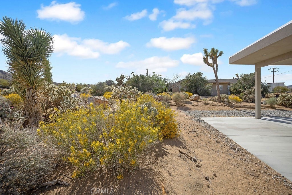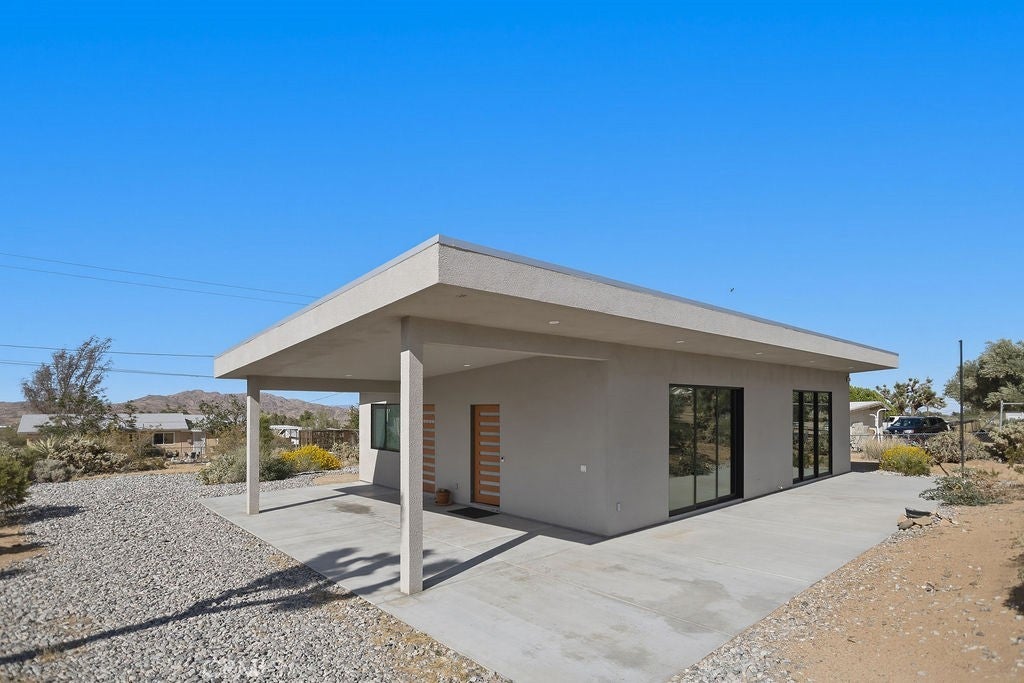 Turn-Key Fully Furnished Modern Construction With Solar Built In 2021 - located in one of the most sought-after areas of the Hi-Desert. Nestled on almost a half-acre lot in Upper Friendly Hills, this property is situated just minutes from the Joshua Tree village, which is full of boutique shopping and gourmet dining, as well as being down the street from captivating hiking trails and Joshua Tree National Park. You can’t ask for a better location! The drive up sets the mood, accompanied by panoramic views of the majestic boulder mountains of Joshua Tree National Park nestled in the backdrop. As you pull into the driveway, you will immediately notice a gorgeous modern design featuring a large carport and custom doors, along with lush xeriscape landscaping filled with cholla, cacti, Joshua trees, and other desert vegetation. Stepping through the front door of this spacious 2-bedroom, 1-bathroom home, you will find the ideal open modern floor plan punctuated by handpicked furniture and decor, high ceilings, recessed lighting, tile flooring, a modern ceiling fan, and a mini-split system for efficient heating and cooling. Two large well-placed windows bring in an abundance of natural light, creating an open and airy feeling that flows throughout this gem. Designed with entertaining in mind, the kitchen opens up to the living area, allowing you to prepare your favorite meals while still being part of the action! Perfectly outfitted with stylish modern cabinetry, a chic mosaic backsplash, brand new stainless steel appliances, quartz countertops, and an island, you have everything you need to prepare your culinary delights! Each bedroom is spacious and comes equipped with individual mini-split systems, modern ceiling fans, ample closet space, and elegant furnishings and decor. The bathroom features a stylish floating vanity, a trendy mirror, shelving, and a walk-in shower! Stepping back outside, enjoy the wraparound concrete patio, perfect for outdoor dining experiences, hosting barbecues, or simply relaxing after a long day while enjoying a soft desert breeze and admiring the starry nights only found in Joshua Tree. Additional features include new doors, paint, windows, a storage shed, indoor laundry with a washer and dryer, owned solar system and more! Don’t miss out on the opportunity to own this stunning modern home. Call today for your private showing before this one is gone!