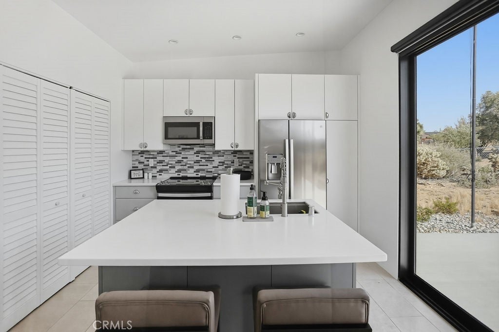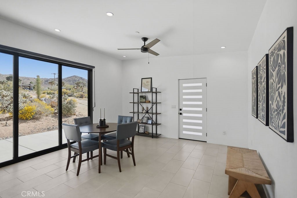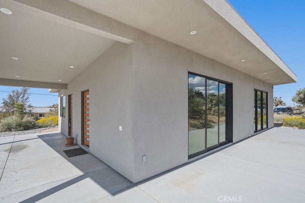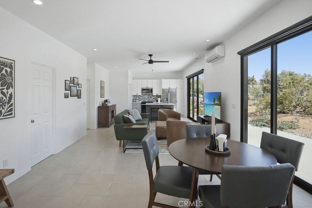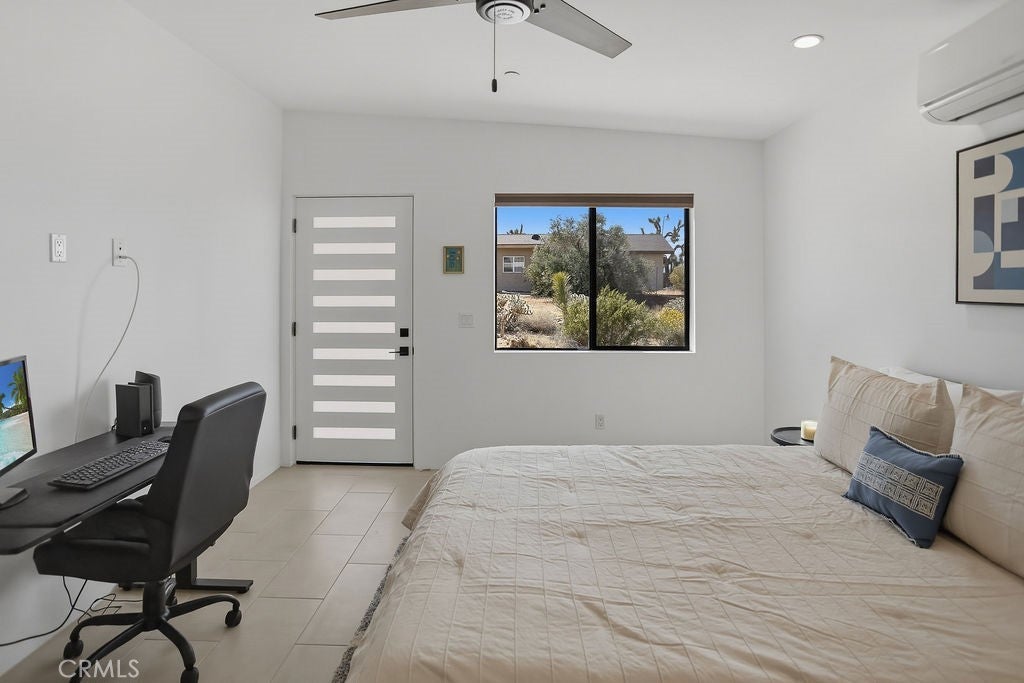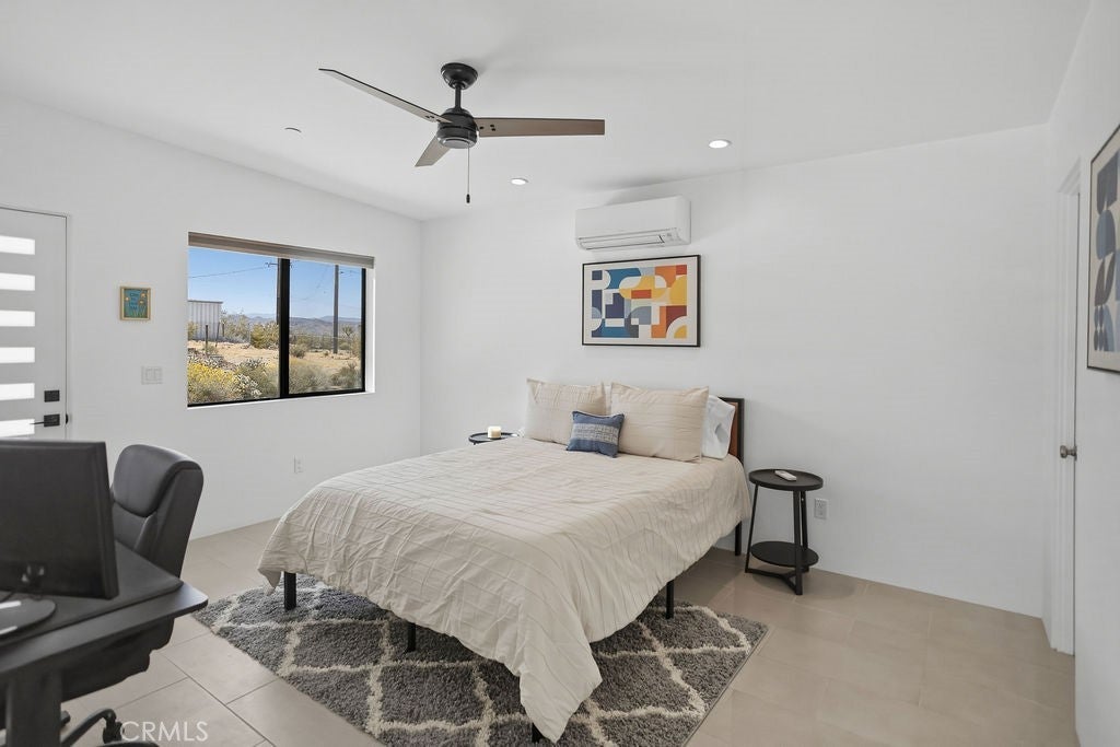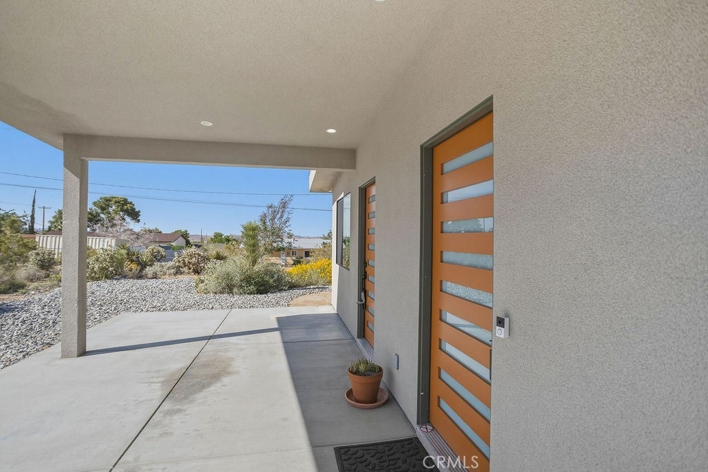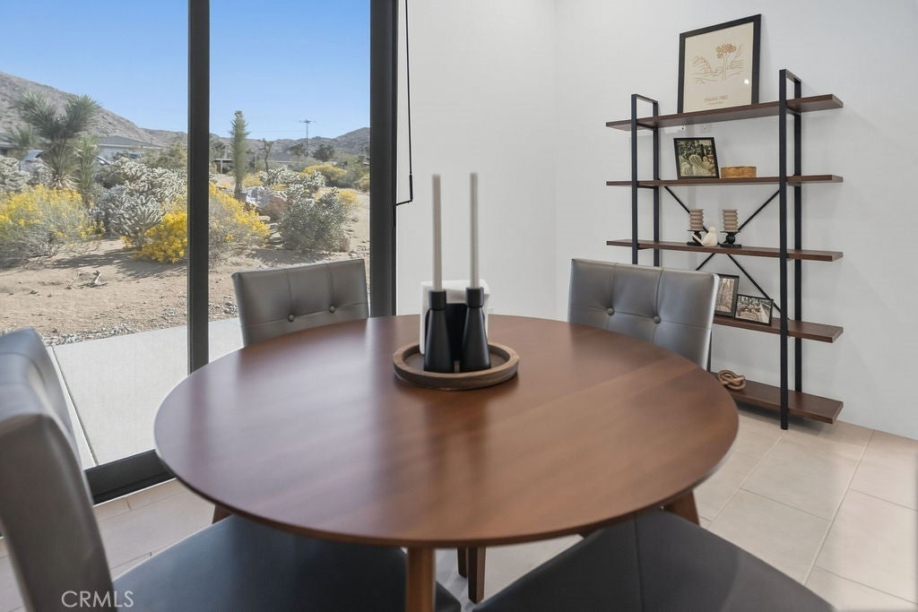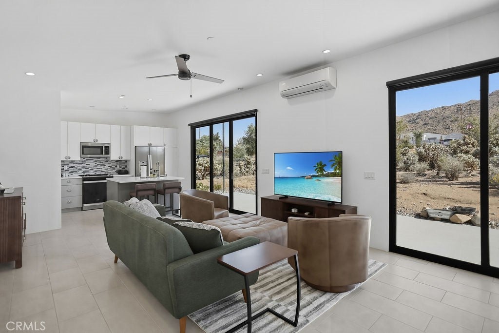 Turn-Key Fully Furnished Modern Construction With Solar Built In 2021 - located in one of the most sought-after areas of the Hi-Desert. Nestled on almost a half-acre lot in Upper Friendly Hills, this property is situated just minutes from the Joshua Tree village, which is full of boutique shopping and gourmet dining, as well as being down the street from captivating hiking trails and Joshua Tree National Park. You can’t ask for a better location! The drive up sets the mood, accompanied by panoramic views of the majestic boulder mountains of Joshua Tree National Park nestled in the backdrop. As you pull into the driveway, you will immediately notice a gorgeous modern design featuring a large carport and custom doors, along with lush xeriscape landscaping filled with cholla, cacti, Joshua trees, and other desert vegetation. Stepping through the front door of this spacious 2-bedroom, 1-bathroom home, you will find the ideal open modern floor plan punctuated by handpicked furniture and decor, high ceilings, recessed lighting, tile flooring, a modern ceiling fan, and a mini-split system for efficient heating and cooling. Two large well-placed windows bring in an abundance of natural light, creating an open and airy feeling that flows throughout this gem. Designed with entertaining in mind, the kitchen opens up to the living area, allowing you to prepare your favorite meals while still being part of the action! Perfectly outfitted with stylish modern cabinetry, a chic mosaic backsplash, brand new stainless steel appliances, quartz countertops, and an island, you have everything you need to prepare your culinary delights! Each bedroom is spacious and comes equipped with individual mini-split systems, modern ceiling fans, ample closet space, and elegant furnishings and decor. The bathroom features a stylish floating vanity, a trendy mirror, shelving, and a walk-in shower! Stepping back outside, enjoy the wraparound concrete patio, perfect for outdoor dining experiences, hosting barbecues, or simply relaxing after a long day while enjoying a soft desert breeze and admiring the starry nights only found in Joshua Tree. Additional features include new doors, paint, windows, a storage shed, indoor laundry with a washer and dryer, owned solar system and more! Don’t miss out on the opportunity to own this stunning modern home. Call today for your private showing before this one is gone!