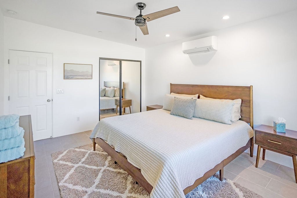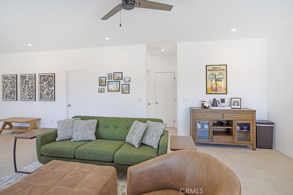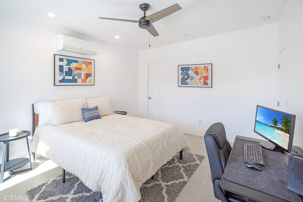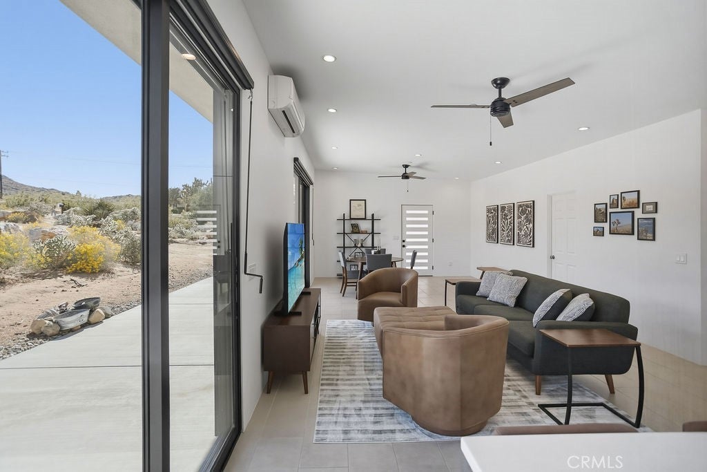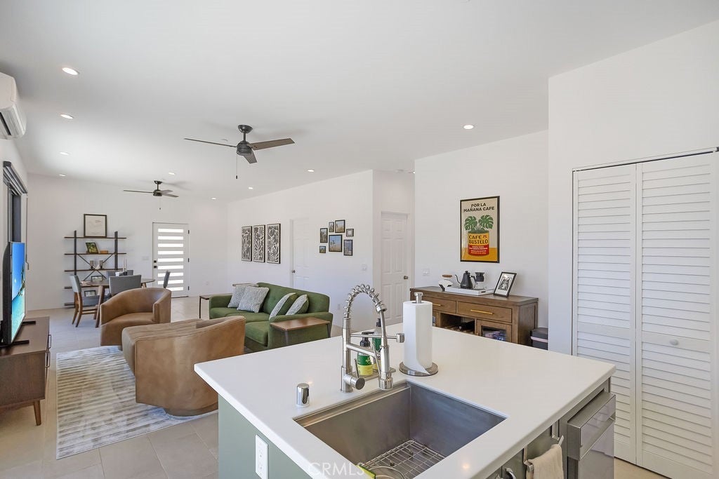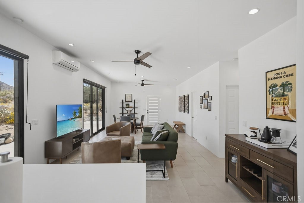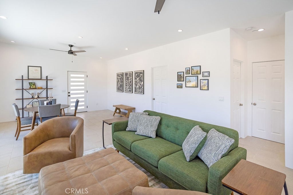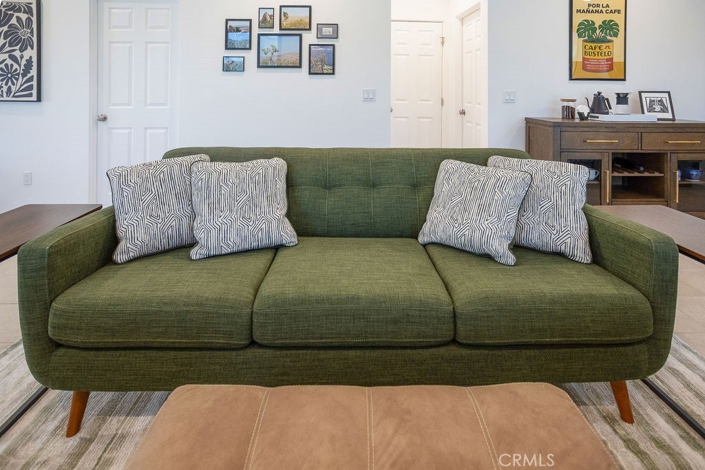 Turn-Key Fully Furnished Modern Construction With Solar Built In 2021 - located in one of the most sought-after areas of the Hi-Desert. Nestled on almost a half-acre lot in Upper Friendly Hills, this property is situated just minutes from the Joshua Tree village, which is full of boutique shopping and gourmet dining, as well as being down the street from captivating hiking trails and Joshua Tree National Park. You can’t ask for a better location! The drive up sets the mood, accompanied by panoramic views of the majestic boulder mountains of Joshua Tree National Park nestled in the backdrop. As you pull into the driveway, you will immediately notice a gorgeous modern design featuring a large carport and custom doors, along with lush xeriscape landscaping filled with cholla, cacti, Joshua trees, and other desert vegetation. Stepping through the front door of this spacious 2-bedroom, 1-bathroom home, you will find the ideal open modern floor plan punctuated by handpicked furniture and decor, high ceilings, recessed lighting, tile flooring, a modern ceiling fan, and a mini-split system for efficient heating and cooling. Two large well-placed windows bring in an abundance of natural light, creating an open and airy feeling that flows throughout this gem. Designed with entertaining in mind, the kitchen opens up to the living area, allowing you to prepare your favorite meals while still being part of the action! Perfectly outfitted with stylish modern cabinetry, a chic mosaic backsplash, brand new stainless steel appliances, quartz countertops, and an island, you have everything you need to prepare your culinary delights! Each bedroom is spacious and comes equipped with individual mini-split systems, modern ceiling fans, ample closet space, and elegant furnishings and decor. The bathroom features a stylish floating vanity, a trendy mirror, shelving, and a walk-in shower! Stepping back outside, enjoy the wraparound concrete patio, perfect for outdoor dining experiences, hosting barbecues, or simply relaxing after a long day while enjoying a soft desert breeze and admiring the starry nights only found in Joshua Tree. Additional features include new doors, paint, windows, a storage shed, indoor laundry with a washer and dryer, owned solar system and more! Don’t miss out on the opportunity to own this stunning modern home. Call today for your private showing before this one is gone!