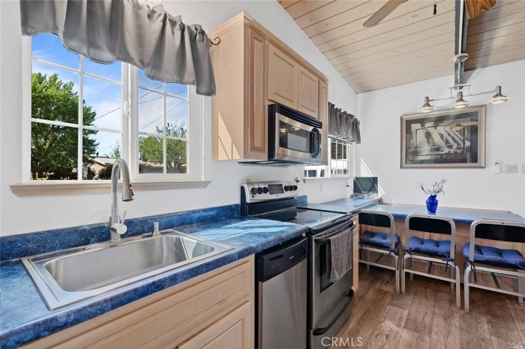 Beamed Ceilings, Ceiling Fan(s), Eat-in Kitchen, Country Kitchen, Laminate Counters, Main Level Primary