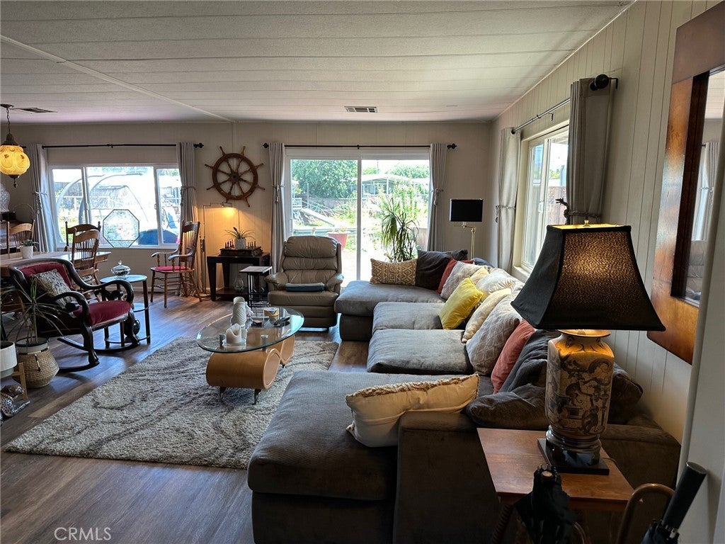 Experience the joys of lake living in this beautiful 2-bedroom, 2-bathroom home located in The Lagoons Park on the Lake. This vibrant 55+ community offers a resort like feel with events and get togethers. This spacious home features an open floor plan with a welcoming family room and an inviting atmosphere throughout. The large primary suite includes dual closets, built-in drawers and cabinets, plus a dedicated vanity area. The en suite bathroom offers dual sinks and a shower/tub combo for added convenience. The second bedroom has direct access to the second bathroom, ideal for guests or a home office. Enjoy plenty of natural light through dual-pane windows with coverings, and appreciate the seamless flow from the kitchen to the dining area, living space, and a fantastic bar. The kitchen boasts a brand-new oven, while the separate laundry area includes a washer, dryer, and pantry. Entertain effortlessly in the bar area, complete with a new bar fridge, and relax on new flooring throughout the home. Comfort is assured with newer air conditioning, heating, a brand-new water heater, and a new 100-gallon kerosene tank for the monitor heater. Step onto your back deck and soak in the peaceful lake surroundings. The outdoor space is beautifully landscaped with plants and cozy seating areas. The large lot features covered parking and additional storage. Community amenities include a pool and clubhouse, while the surrounding area offers dining, live music, local events, boating, and fishing. This is lake living at its finest!