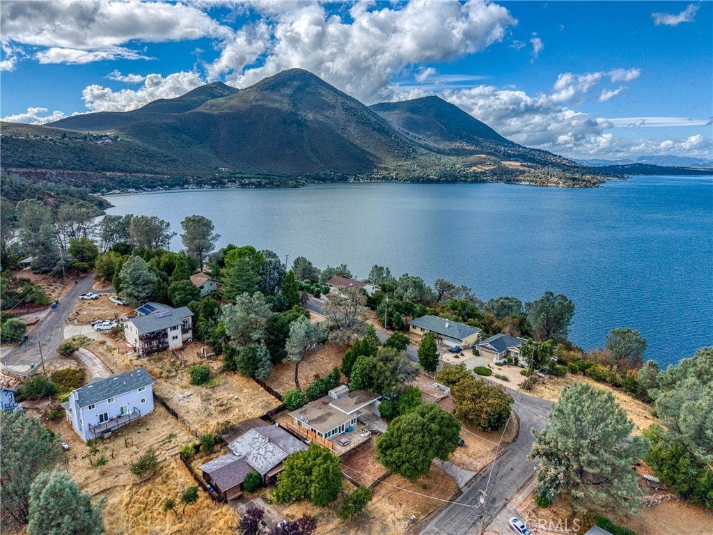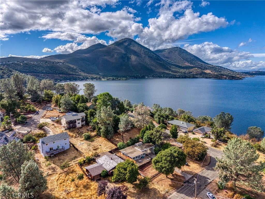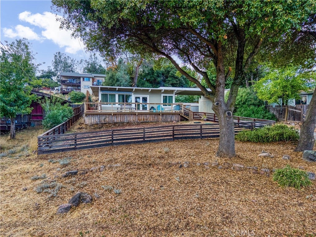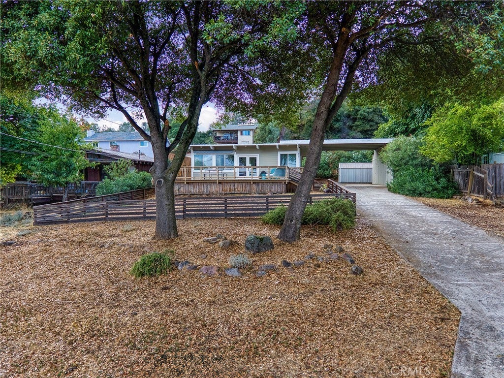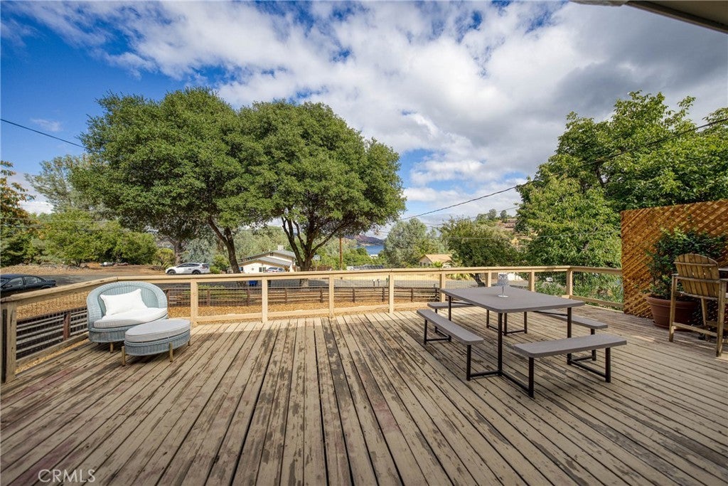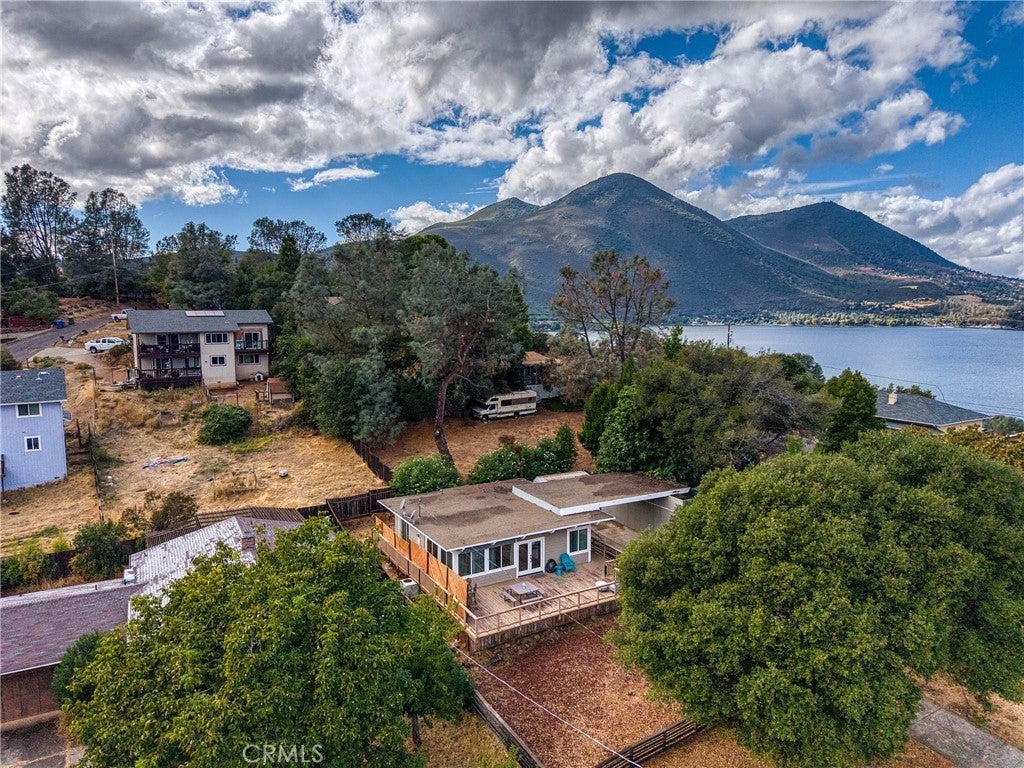This lakeside residence has been recently upgraded to reflect modern styling. Key features include new windows, French doors, and continuous laminate flooring throughout the main living areas. The light-filled great room boasts exposed beams and doors that open directly onto a large front deck overlooking the lake. The modern kitchen is equipped with tile countertops, bar counter seating, and stainless steel appliances, including a propane range, microwave hood, and refrigerator. The integrated dining room, enhanced by a modern chandelier, is situated off the French doors leading to the wrap-around style deck—an ideal space for entertaining and barbecues. The home offers two naturally lit bedrooms, both featuring slider doors that provide access to the wrap-around deck. The updated bathroom includes a walk-in tiled shower, wainscoting, and a single furniture-style vanity. Exterior amenities include a long, flat driveway suitable for multiple cars, an attached carport with built-in storage, and a separate laundry room. The fenced front yard is shaded by beautiful oak trees and offers frequent nature sightings. Located in the Kelseyville Riviera, this home is centrally positioned in Lake County, California, providing access to schools, shopping, and the lake. Enjoy peaceful country living in a community just 2.5 hours from San Francisco and 2 hours from Sacramento.