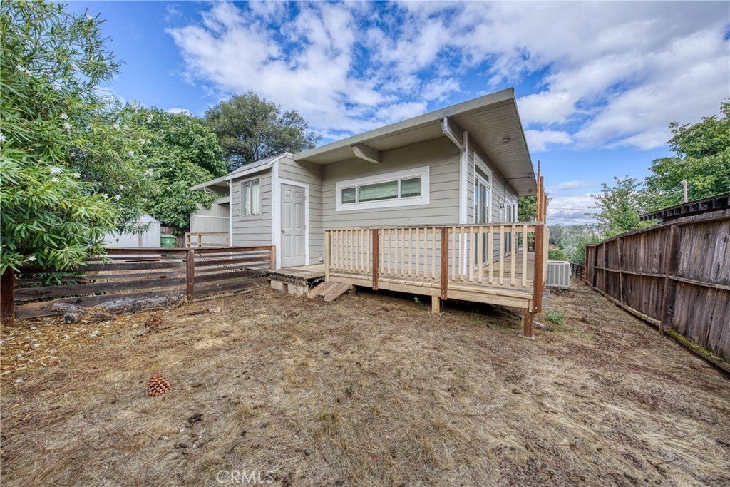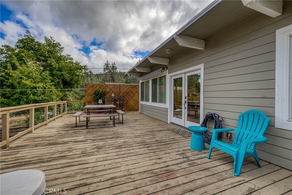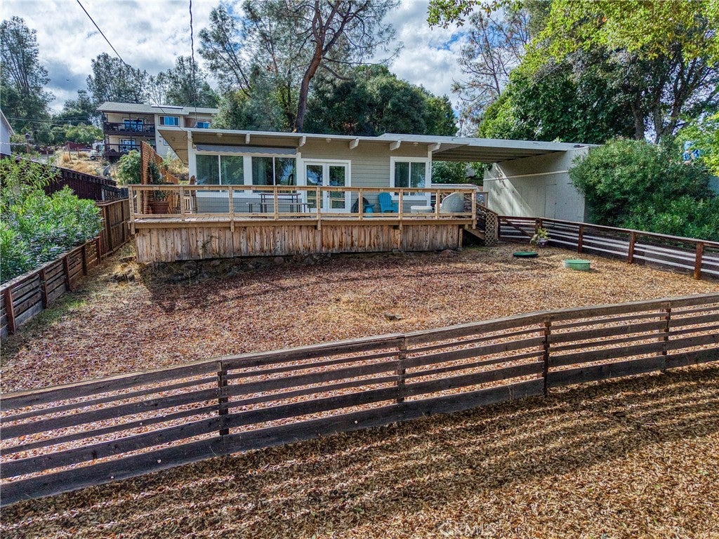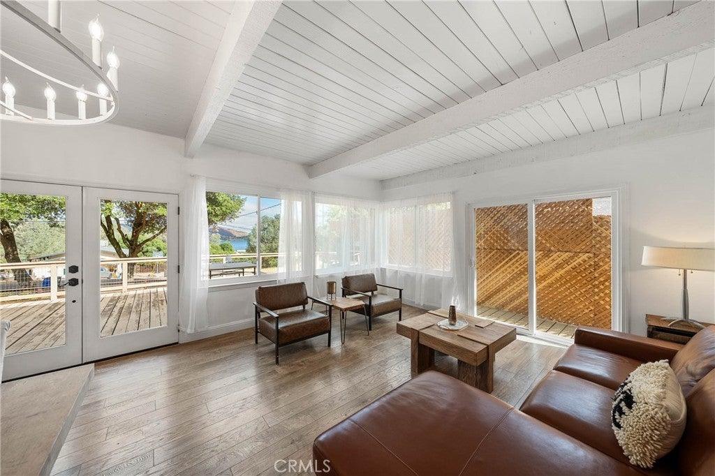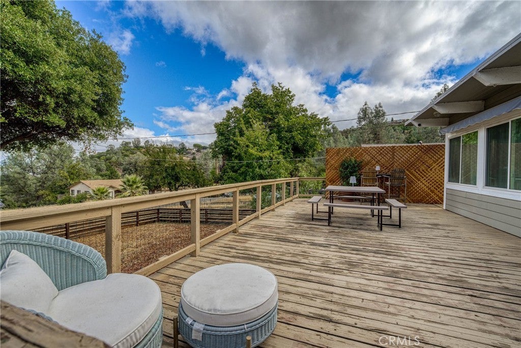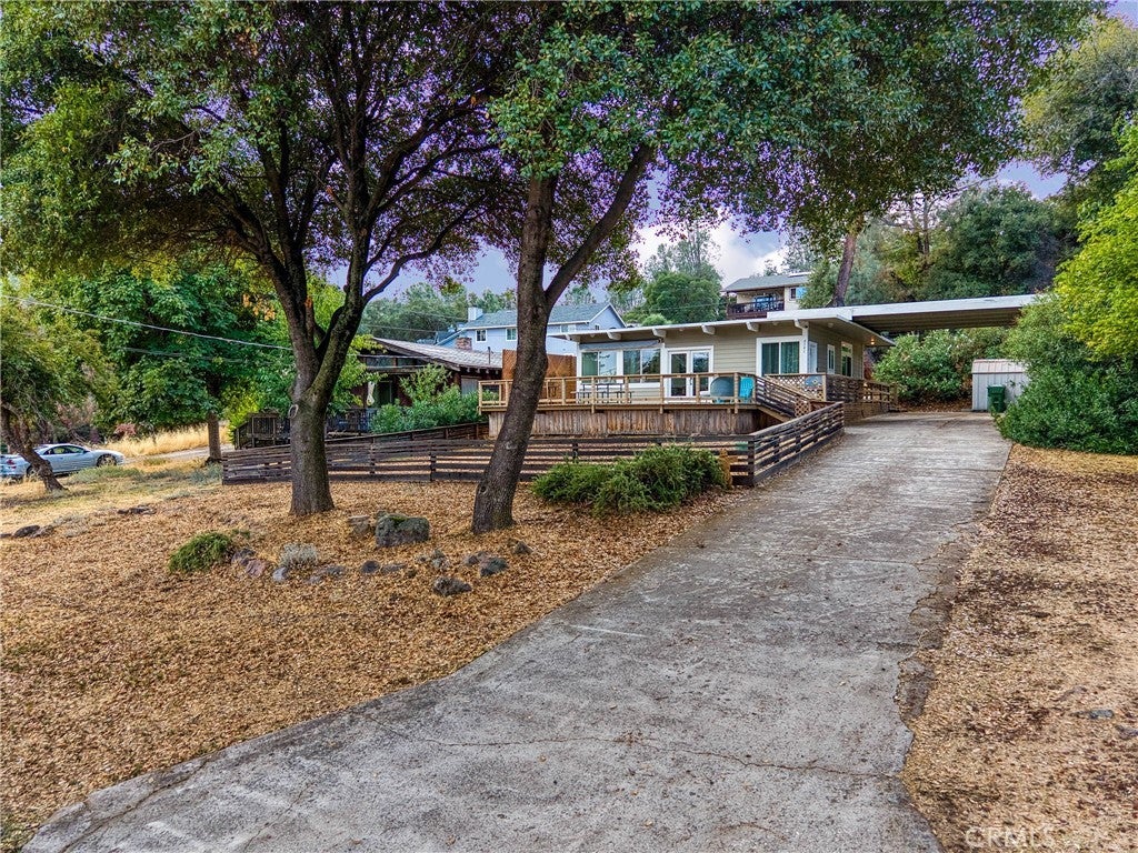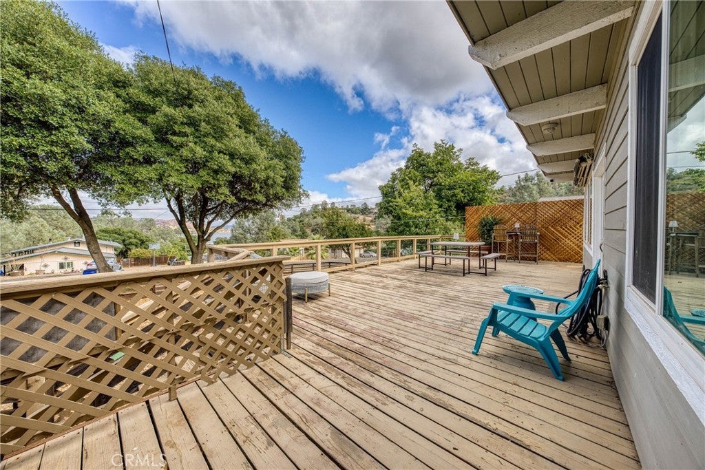 This lakeside residence has been recently upgraded to reflect modern styling. Key features include new windows, French doors, and continuous laminate flooring throughout the main living areas. The light-filled great room boasts exposed beams and doors that open directly onto a large front deck overlooking the lake. The modern kitchen is equipped with tile countertops, bar counter seating, and stainless steel appliances, including a propane range, microwave hood, and refrigerator. The integrated dining room, enhanced by a modern chandelier, is situated off the French doors leading to the wrap-around style deck—an ideal space for entertaining and barbecues. The home offers two naturally lit bedrooms, both featuring slider doors that provide access to the wrap-around deck. The updated bathroom includes a walk-in tiled shower, wainscoting, and a single furniture-style vanity. Exterior amenities include a long, flat driveway suitable for multiple cars, an attached carport with built-in storage, and a separate laundry room. The fenced front yard is shaded by beautiful oak trees and offers frequent nature sightings. Located in the Kelseyville Riviera, this home is centrally positioned in Lake County, California, providing access to schools, shopping, and the lake. Enjoy peaceful country living in a community just 2.5 hours from San Francisco and 2 hours from Sacramento.