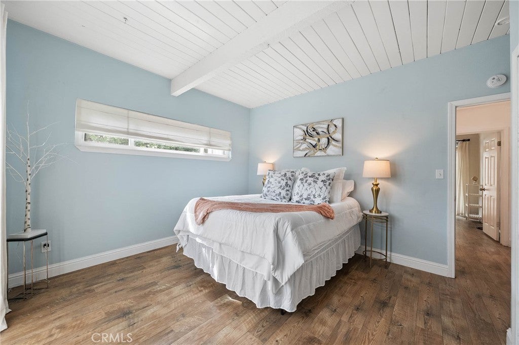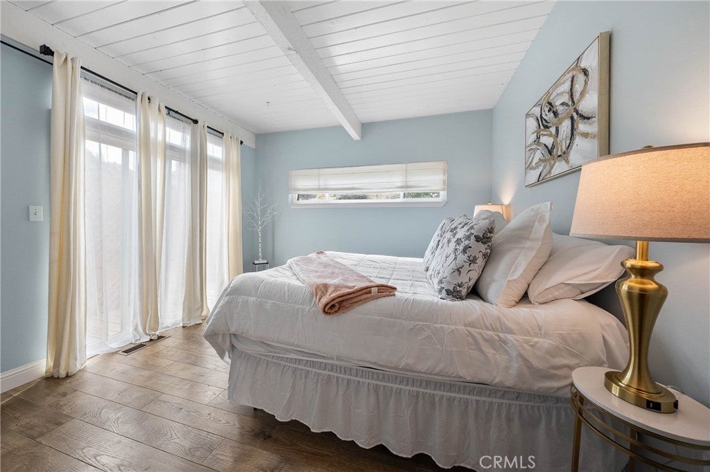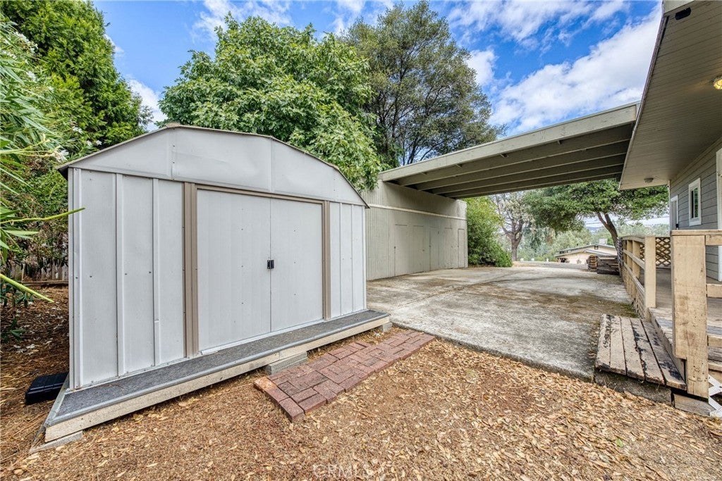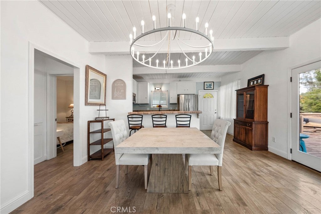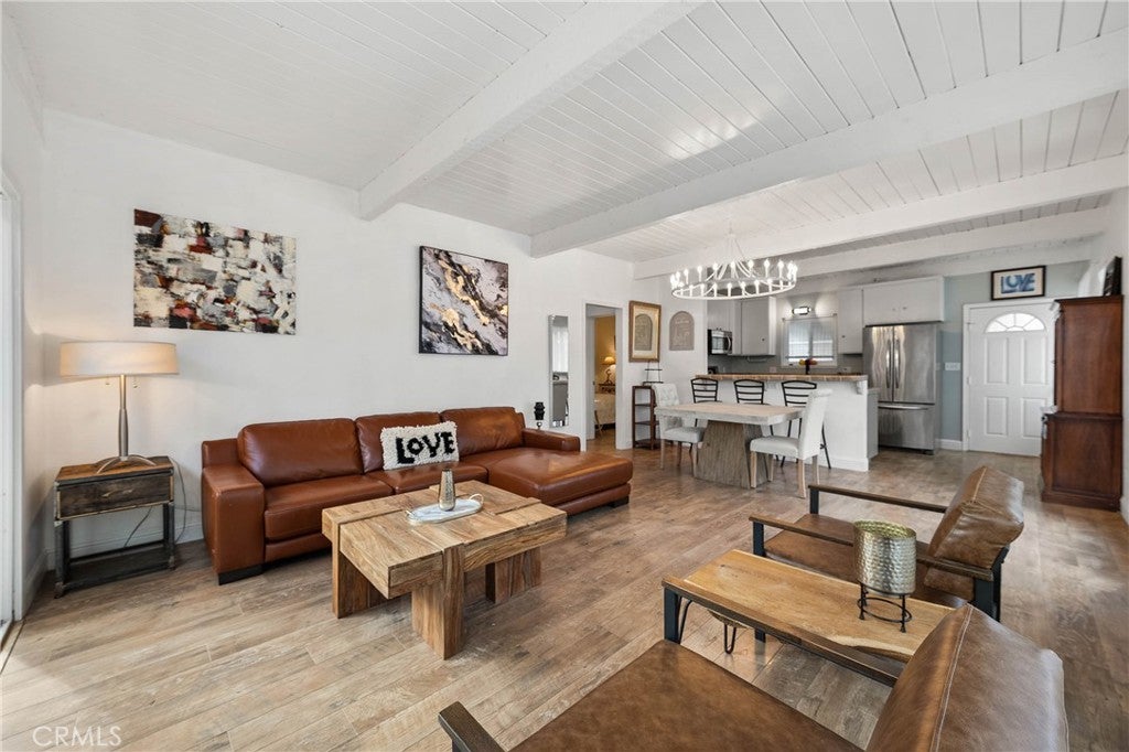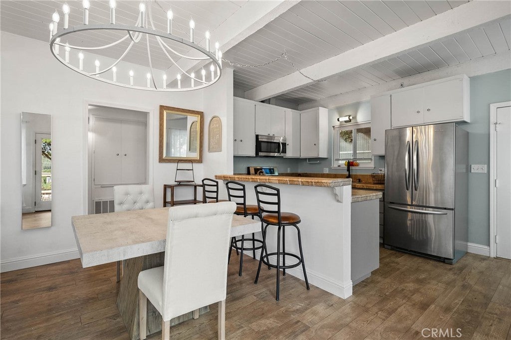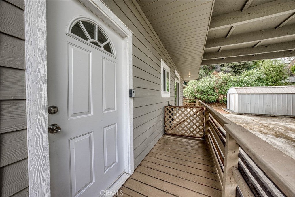 This lakeside residence has been recently upgraded to reflect modern styling. Key features include new windows, French doors, and continuous laminate flooring throughout the main living areas. The light-filled great room boasts exposed beams and doors that open directly onto a large front deck overlooking the lake. The modern kitchen is equipped with tile countertops, bar counter seating, and stainless steel appliances, including a propane range, microwave hood, and refrigerator. The integrated dining room, enhanced by a modern chandelier, is situated off the French doors leading to the wrap-around style deck—an ideal space for entertaining and barbecues. The home offers two naturally lit bedrooms, both featuring slider doors that provide access to the wrap-around deck. The updated bathroom includes a walk-in tiled shower, wainscoting, and a single furniture-style vanity. Exterior amenities include a long, flat driveway suitable for multiple cars, an attached carport with built-in storage, and a separate laundry room. The fenced front yard is shaded by beautiful oak trees and offers frequent nature sightings. Located in the Kelseyville Riviera, this home is centrally positioned in Lake County, California, providing access to schools, shopping, and the lake. Enjoy peaceful country living in a community just 2.5 hours from San Francisco and 2 hours from Sacramento.