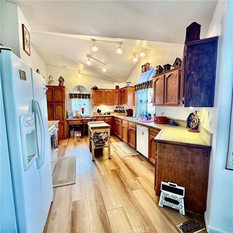 Peaceful Lakeview Living – 2 Bed + Office | 2 Bath | Lake Views Welcome to your dream retreat — a beautifully maintained 2-bedroom + office, 2-bath manufactured home that blends comfort, style, and breathtaking natural beauty. Nestled in a hill top location, this charming residence boasts beautiful lake views from your living room and private deck, offering a daily dose of tranquility. Step inside to find an open-concept layout flooded with natural light. The spacious living area features large picture windows that frame the lake view and nature, while elegant finishes and neutral tones create a warm, inviting atmosphere. The kitchen is a modern delight, with matching appliances, generous counter space, and a cozy breakfast area perfect for morning coffee with a view. The primary suite is a restful haven, complete with a private en-suite bath featuring dual sinks and a soaking tub. A second bedroom and full guest bath offer ample space for family or visitors. The dedicated office/den provides the perfect work-from-home setup or can be easily converted into a guest room, hobby space, or reading nook. Outside, enjoy your lake view and morning coffee or evening wine on the deck, taking in the sights and sounds of nature. The lot is landscaped for easy maintenance, and there's plenty of space for gardening or relaxing. Completely fenced in, RV parking and detached 2 car garage. Whether you're seeking a peaceful primary residence or a weekend escape, this lake view gem offers the perfect blend of low-maintenance living, scenic beauty, and modern comfort.