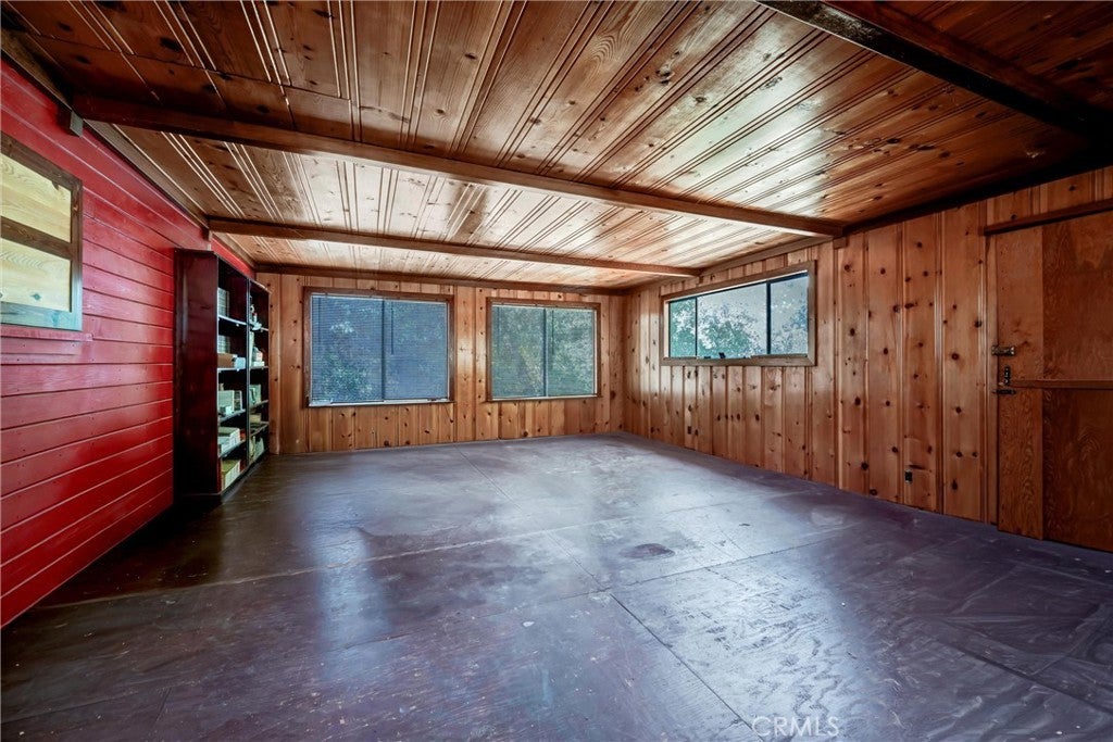 Welcome to this charming 3-bedroom, 1-bath cabin, set on a spacious 13,067 sq. ft. lot. Bursting with character, this home features custom trim and molding throughout, redwood-cased windows, and classic "lawyers wood" walls that add timeless warmth. A striking cobblestone fireplace anchors the living space, while new waterproof laminate flooring provides modern durability with rustic charm. The property includes a detached garage with both a 1-car bay and a dedicated RV spot, plus convenient boat storage tucked beneath the home—perfect for adventure seekers. Adding to its appeal, this home offers year-round neighborhood beach access, giving you a place to enjoy the lake in every season.