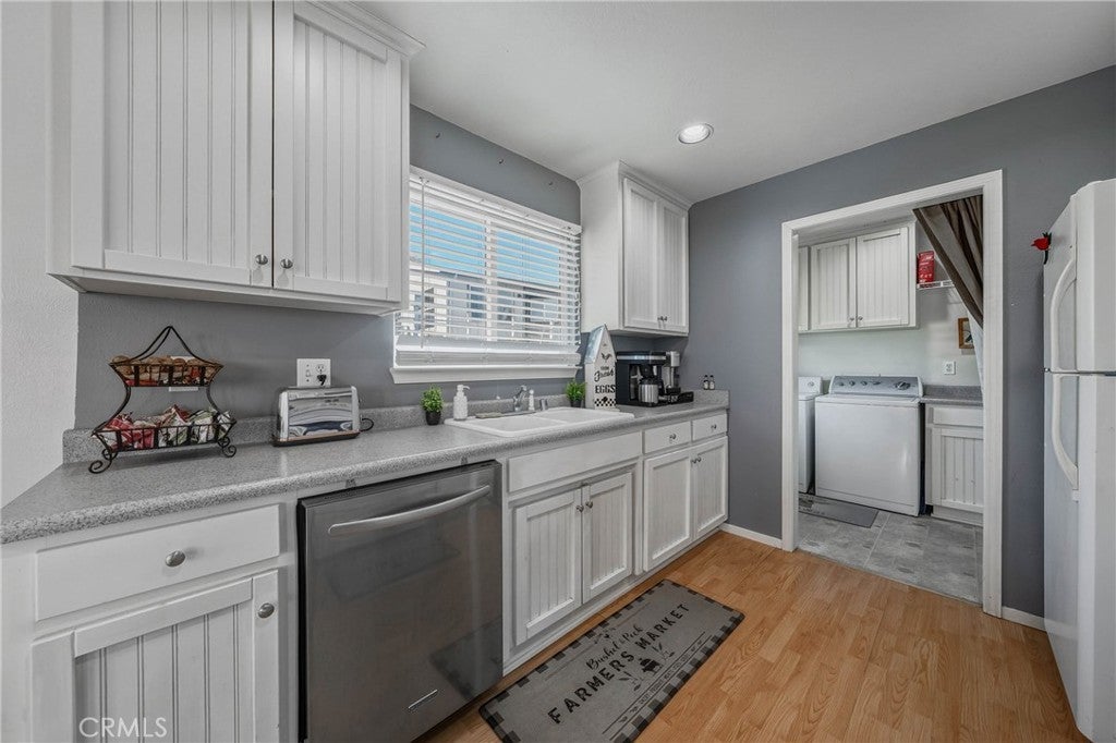 Charming 2005 Stick built house with 1192 sq ft of living space. 2-Bedrooms, 2-Bathrooms plus a BONUS room. The bonus room is currently used as a bedroom, but it can easily be turned into an office or a hobby room. The kitchen offers spacious counters, recessed lighting, electric cook-top, refrigerator, dishwasher, and wood laminate flooring. The dining area is accented with a ceiling fan. The primary suite is a nice size with a walk-in closet and its own full bath. You can also enjoy indoor laundry room with the washer and dryer included! Low maintenance landscaping in front and back yard and ample parking. This property is close to transit, shopping, dining, parks, and schools. A perfect opportunity for an investor, first time buyer, or someone looking to downsize and simplify! Peek- a- boo view of the lake from front room and front yard.