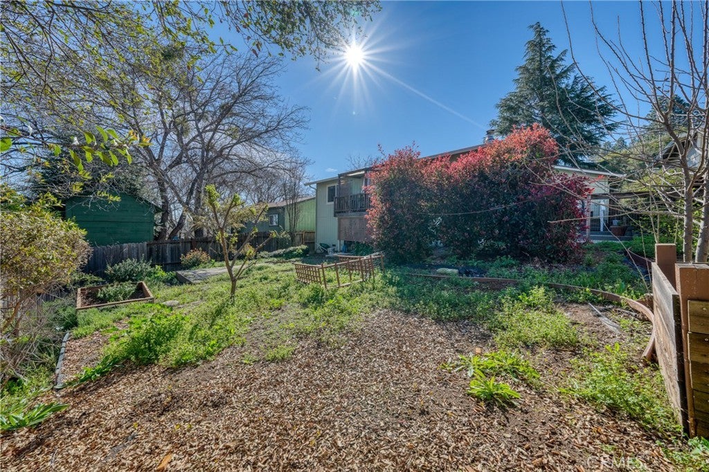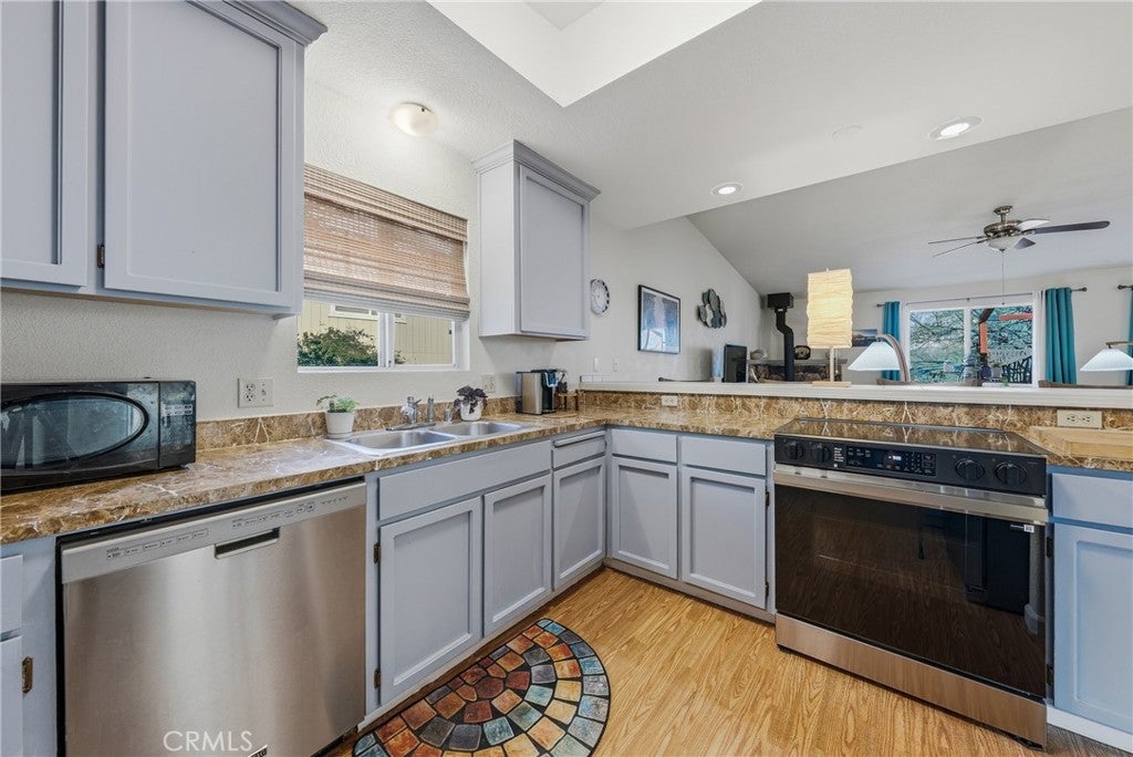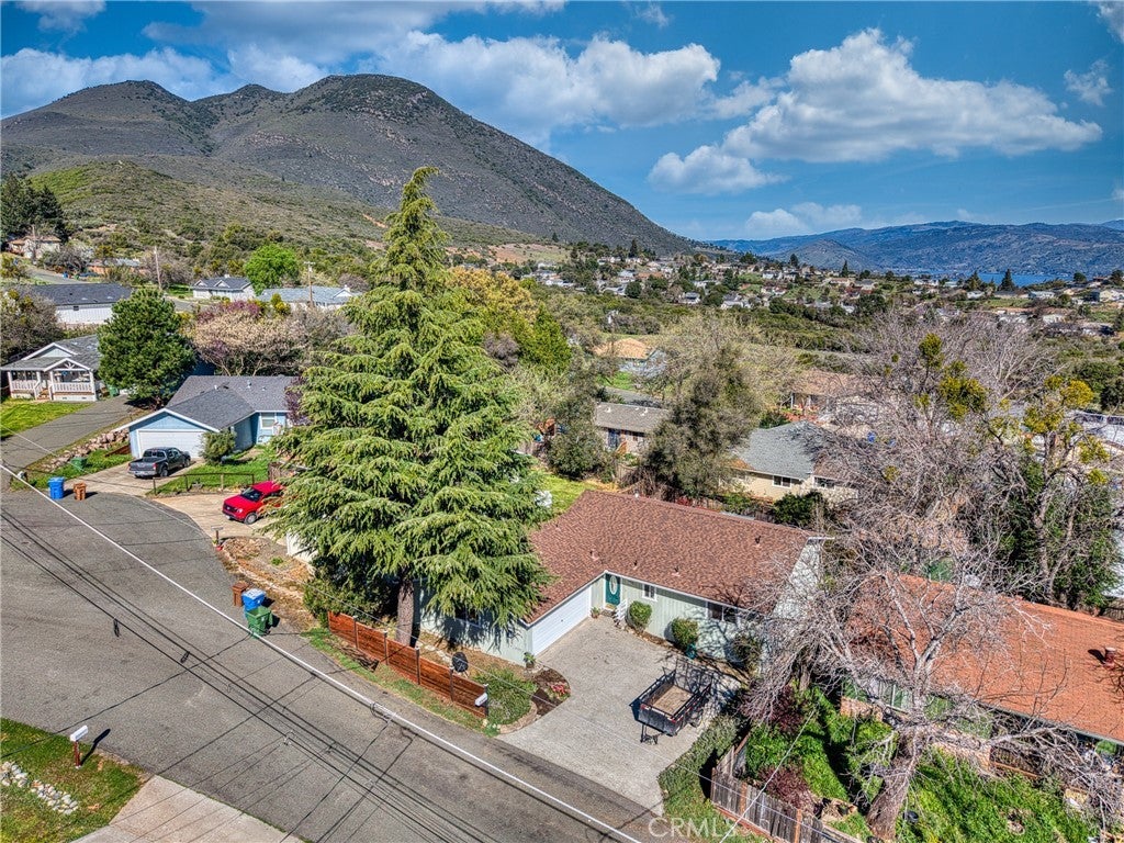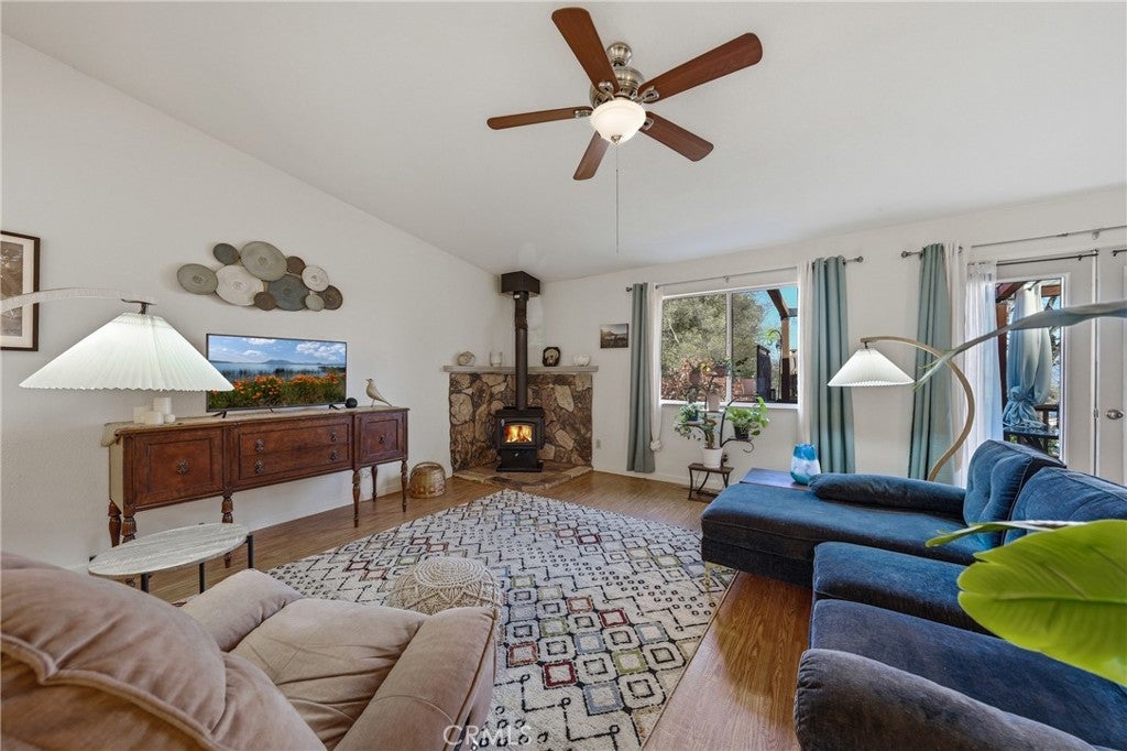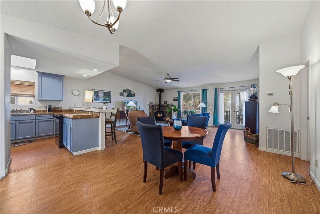 This single-level home is situated in the beautiful Clearlake Riviera community of Kelseyville, CA. A wood-look tile entry leads into an open floor plan featuring vaulted ceilings and vinyl floors, creating an inviting atmosphere throughout the home. The great room is further enhanced by a cozy rock hearth with a wood stove for added comfort. The large kitchen offers ample counter space and a breakfast bar that opens directly to the living area, with an additional dining space conveniently located nearby. The primary bedroom features a private view of the backyard and an en suite bathroom with a tub-shower combo. A second bedroom overlooks the front yard, while the hall bathroom is finished with wood-look tile floors and a tub-shower combo. Located off the great room, French doors open to an attached upper deck, providing a perfect spot to overlook the fenced backyard and its diverse selection of plants, trees, and shrubs. The front yard is designed with low-maintenance landscaping, including blooming flowers and greenery. A flat concrete driveway leads to the attached two-car garage, which includes a side door for easy access to the side patio and the shaded fenced backyard. Located just above CA. Largest natural Lake Clear Lake. Enjoy year-round water sports and amazing views.