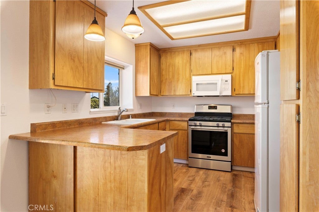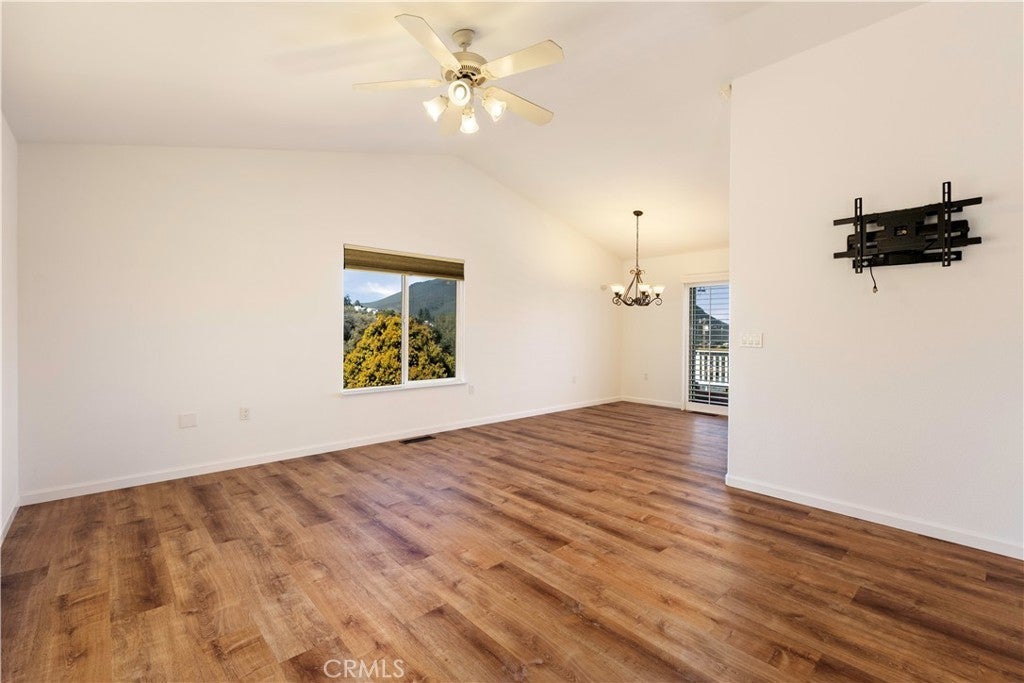 Tucked into a quiet cul-de-sac in Kelseyville Riviera, this cute and clean home offers front-and-center views of Mount Konocti. The main living area is bright and welcoming with vaulted ceilings, large picture windows that frame the mountain, and brand-new flooring throughout the open living and dining space. The sunny kitchen is well equipped with plenty of counter space, a breakfast bar for casual dining, and stylish pendant lighting. The primary bedroom is a comfortable retreat featuring its own electric fireplace, walk-in closet, and private bath. Two guest bedrooms offer ample closet space and share a nearby guest bathroom. An attached oversized two-car garage includes a convenient laundry area and additional storage. Out back, double decks create the perfect spot to relax, entertain, or simply take in the views, all overlooking a fully fenced backyard. Located just minutes from local shopping and the lake, this home offers easy living in a peaceful neighborhood setting.