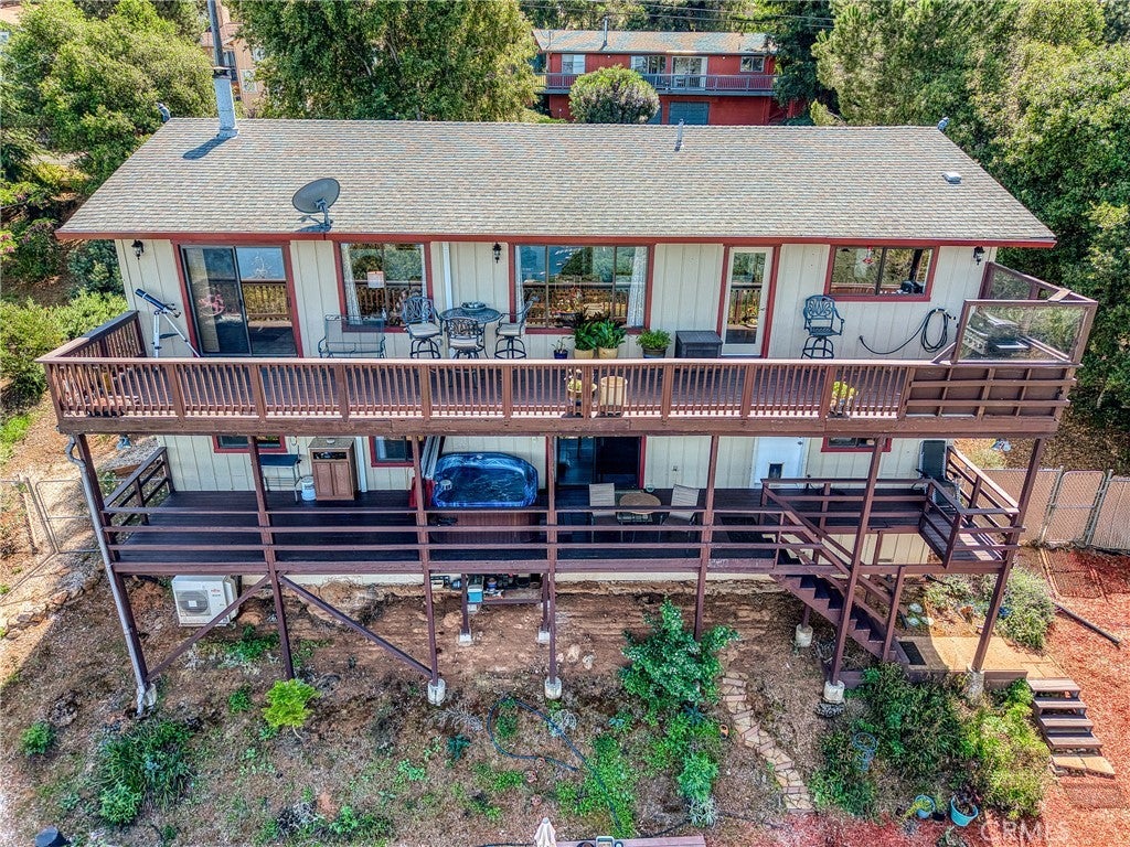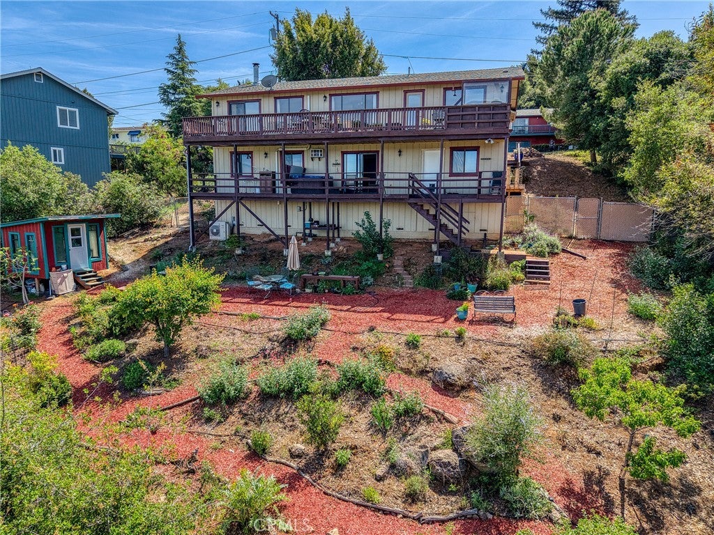 Tucked away at the base of majestic Mount Konocti, this inviting 3-bedroom, 2-bath plus a bonus room, this home offers a rare blend of privacy, comfort, and sweeping lake views. Set in a serene, natural setting. Step out onto one of the expansive back decks—perfect for entertaining with your barbecue while taking in the beauty of the surrounding landscape. Watch deer wander by, quail scurry through the brush, hummingbirds hover nearby, and eagles soar overhead. As evening falls, unwind in the hot tub under a blanket of stars, with twinkling lights along the shores of Konocti Bay and Windflower Point. Inside, the home is warm and welcoming, highlighted by a cozy woodstove—ideal for relaxing on cooler evenings. The upper level features durable ceramic tile flooring throughout, while the custom ceramic tile shower adds a touch of craftsmanship and style. The fully fenced backyard is equally charming, with a variety of fruit trees including peach, apricot, fig, and lime, along with a lovely perennial flower garden that brings seasonal color year-round. This is more than a home—it’s a peaceful retreat and one of Lake County’s truly special places. Come experience it for yourself.
