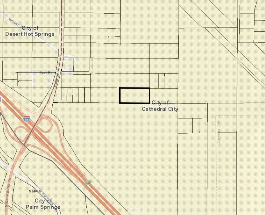 FIVE +- (5) ACRES, GORGEOUS MOUNTAIN and DESERT VIEWS, in CATHEDRAL CITY, Riverside County, Ca. Flat, rectangular lot is 338'+- on the West and East sides, 660'+- on the North and South. ZONING is MU-U (Mixed Use Urban) and COMMERCIAL. One of the last large lots conveniently located near Palm Drive, at the 60 FREEWAY EXIT. Corners consist of Arco/Mkt on the Southwest corner. Chevron/Mkt and a Jack in the Box on the Northeast corner. Just to the Northwest is cannabis cultivation zoning. Harborside Cannabis drive-thru, right on the other side of Palm Drive. New construction on the Northwest corner of Palm Drive and Paul. Amazing number of home tracts on the South side of the Freeway. This indicates the North Palm Springs/Desert Hot Springs/Cathedral City area is moving forward with commercial and residential growth. Large parcels will be at a premium and certainly retain investment values! Palm Drive is right between Indian Canyon Drive to the West and Date Palm Drive to the East, off the 60 Freeway. Head South on Palm Drive and it turns into the North Gene Autry Trail. This is the main road to Palm Springs International Airport, the Palm Springs Tramway, Palm Springs Art Museum and more. Shopping at the Sunrise Vista Chino Albertsons Center also available just East of the Airport. Palm Springs school district. Brightwood and Kaplan Colleges, Palm Springs High School, charter and elementary schools all within minutes of property. Palm Drive is a beautiful palm tree lined four-lane drive. Location is 100% Great investment!