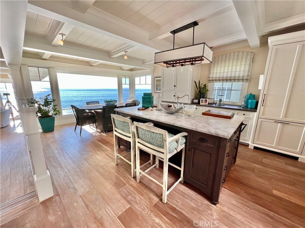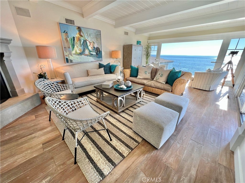 PRICE IMPROVEMENT! OCEANFRONT, Direct Beach Access home with expansive lot overlooking the Coastline, with panoramic views of the crashing surf below. Inspired by the Coastal Homes of Sag Harbor and the Hamptons, this 3 bedroom, 3 1/2 bath Beach House is fully remodeled and beautifully appointed with all designer-selected furnishings included for a turnkey purchase. Generous living and dining areas open to oceanfront patios and a large grass yard with BBQ and outdoor entertaining areas. The mostly flat (nearly quarter-acre) lot overlooks Tablerock Beach with lovely gardens and yard areas, perfect for lounging and sea-gazing. This "beachy-chic" home features a chef's kitchen with bar seating and ocean view dining areas, offering an authentic culinary experience with high-end appliances, an Italian stove, a center island, and plenty of workspace for informal or formal dining service. Three bedrooms with designer finishes and full baths complete the main level. An office area and another bathroom with a step-in shower are conveniently situated at the front entrance. This quintessential oceanfront Beach House is ideal for primary or second home living and also features a two-car attached garage and Central AC. The South Laguna Bluffs location, at the end of a quiet cul-de-sac, is just steps from the South Laguna Village area, with access to the shops and restaurants and just five minutes from downtown Laguna Village galleries, entertainment, and art festivals. This is a must-see home!