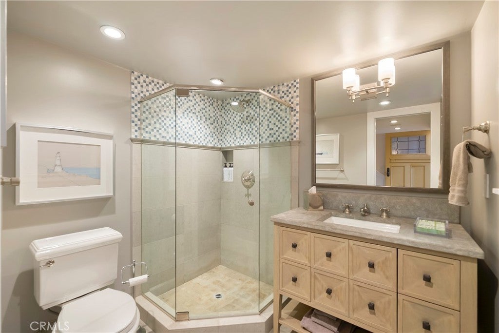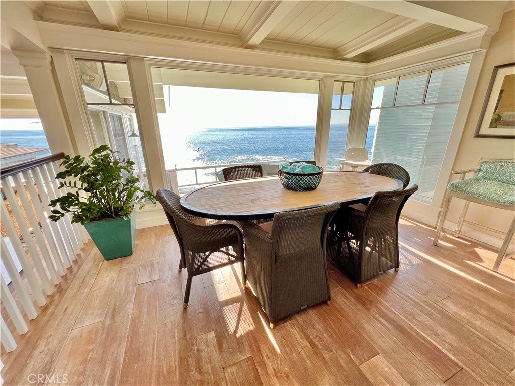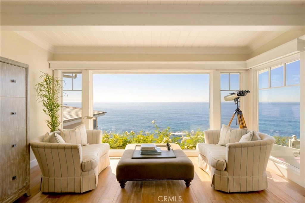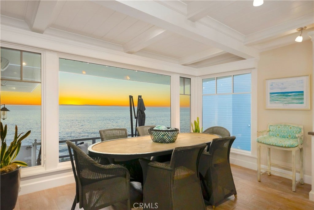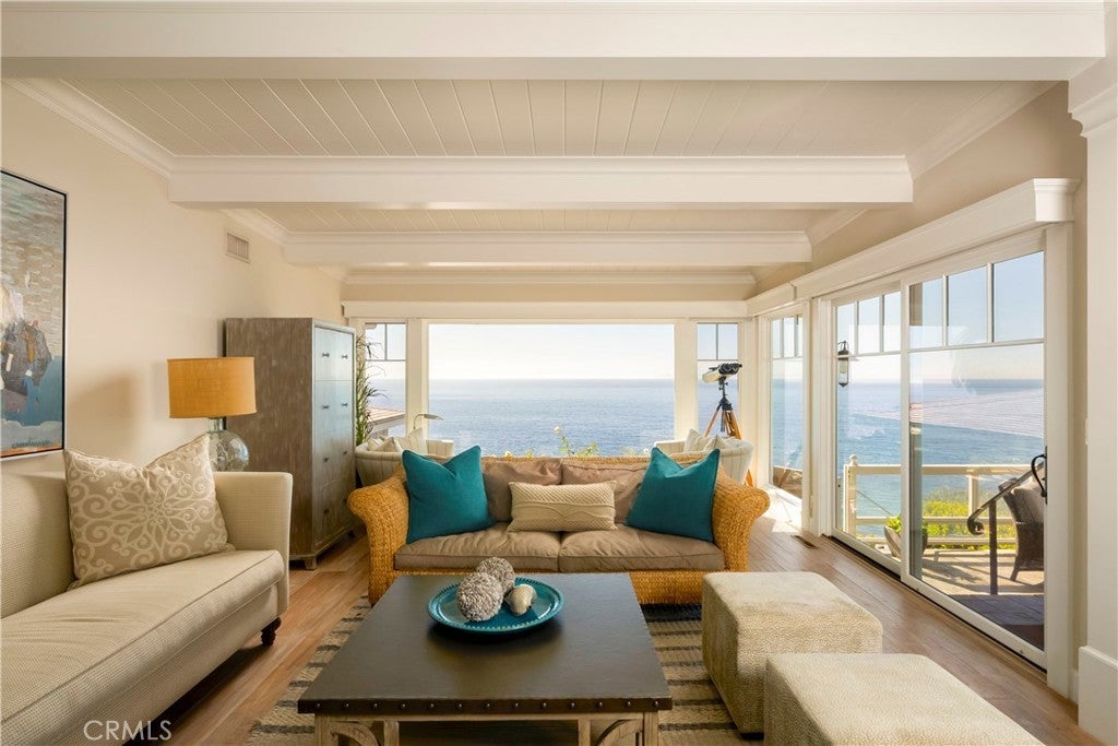 JUST REDUCED TO SELL! OCEANFRONT, Direct Beach Access home with expansive lot overlooking the Coastline, with panoramic views of the crashing surf below. Inspired by the Coastal Homes of Sag Harbor and the Hamptons, this 3 bedroom, 3 1/2 bath Beach House is fully remodeled and beautifully appointed with all designer-selected furnishings included for a turnkey purchase. Generous living and dining areas open to oceanfront patios and a large grass yard with BBQ and outdoor entertaining areas. The mostly flat (nearly quarter-acre) lot overlooks Tablerock Beach with lovely gardens and yard areas, perfect for lounging and sea-gazing. This "beachy-chic" home features a chef's kitchen with bar seating and ocean view dining areas, offering an authentic culinary experience with high-end appliances, an Italian stove, a center island, and plenty of workspace for informal or formal dining service. Three bedrooms with designer finishes and full baths complete the main level. An office area and another bathroom with a step-in shower are conveniently situated at the front entrance. This quintessential oceanfront Beach House is ideal for primary or second home living and also features a two-car attached garage and Central AC. The South Laguna Bluffs location, at the end of a quiet cul-de-sac, is just steps from the South Laguna Village area, with access to the shops and restaurants and just five minutes from downtown Laguna Village galleries, entertainment, and art festivals. This is a must-see home!