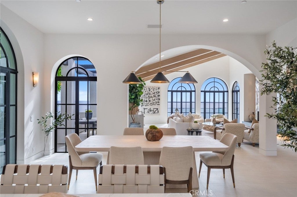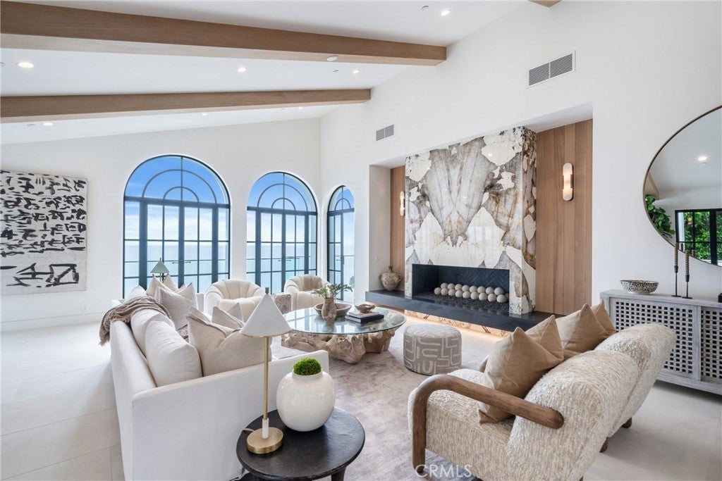 Perched majestically on a half-acre oceanfront bluff overlooking the beautiful Southern California coastline, 32101 Coast Hwy embodies the epitome of luxury Laguna Beach living. This stunning estate features panoramic white water, ocean, Catalina Island, sand, and coastline views. A one-of-a-kind home, it has been completely remodeled to the highest quality. A large bluff-top infinity pool with spa and pool house boast panoramic vistas: an architectural rarity that would never be approved if submitted today. This home was transformed into a contemporary Santa Barbara-style masterpiece by renowned architect James Conrad. Upon entry, the sprawling main level open floor plan immediately captivates with stunning panoramic ocean views. The main level features a spacious living room, dining room, gourmet chef's kitchen, powder room, luxurious primary suite, and magnificent outdoor decks all designed to maximize natural light and ocean vistas. The seamless flow extends to the lower level, where a large family room opens onto the expansive deck overlooking the pool, spa, and ocean. The lower level features three bedrooms, three bathrooms with immaculate tile work, spacious laundry room, and direct access to the pool deck, seamlessly blending indoor and outdoor living. Additional interior touches include incredible custom tile flooring, with ceilings featuring white oak beams and tongue & groove design. Moving outside, lush landscaping and a fully remodeled pool, spa, and waterfall delight the senses. Additionally, the pool house features a beautiful bathroom and bar. New roofing strategically integrates solar panels into the shingles. Three new sets of pocket doors and exterior steel doors with marine-grade finish, plus a brand-new Euroline steel front entry door complete the picturesque appearance. Every detail of this virtually brand-new home has been meticulously curated. The extensive three-year renovation included structural enhancements, updating the plumbing, electrical, & HVAC with state-of-the-art systems, and installation of top-quality windows. For a turnkey experience, the brand new elegant furnishings are available for purchase. 32101 Coast Hwy not only offers a luxurious residence, but a lifestyle characterized by coastal serenity and sophistication. Ideal for those seeking the ultimate in beachfront living, this property invites you to experience the pinnacle of Laguna Beach's coastal charm and beauty. Your one-of-a-kind coastal oasis awaits!