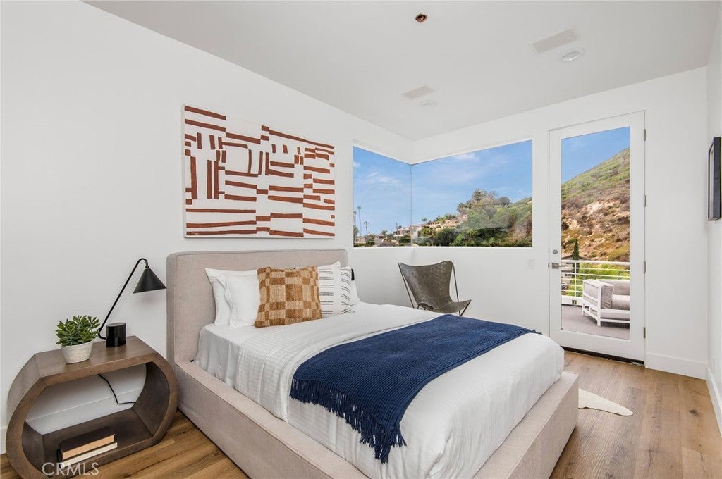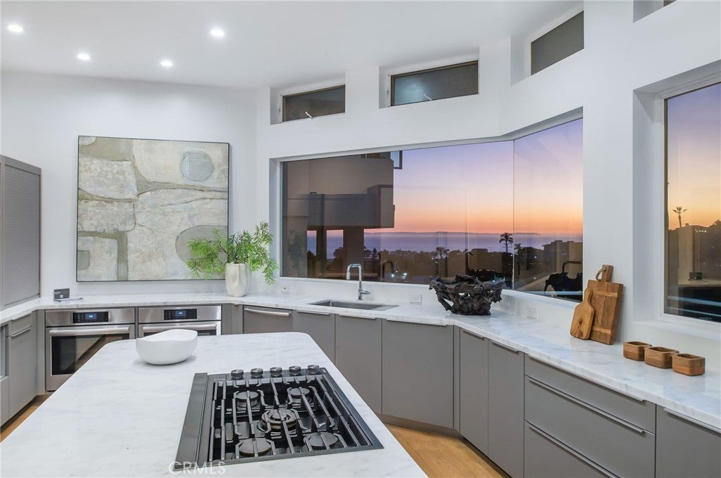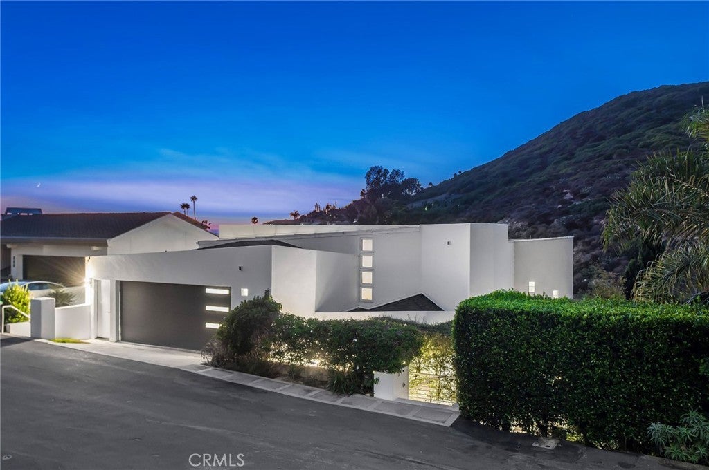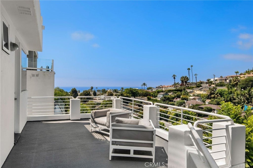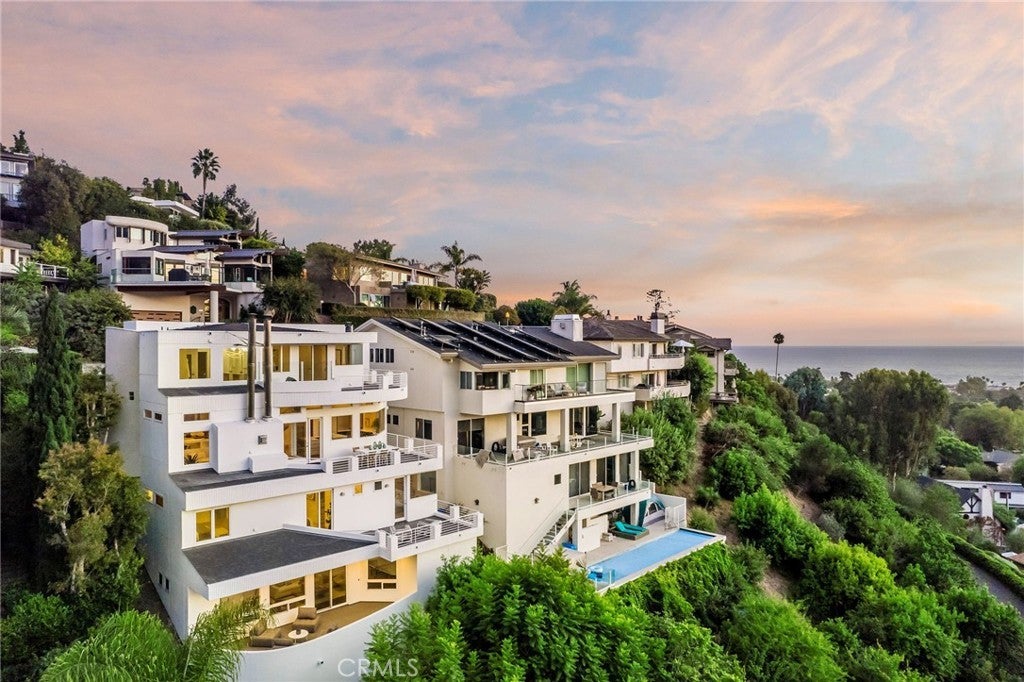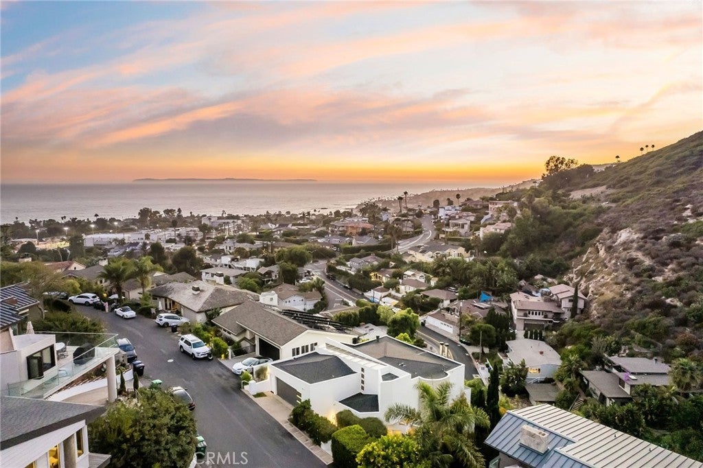 A stunning example of contemporary Laguna Beach architecture with panoramic views of the Pacific Ocean and the city below. This highly updated home spans approximately 4,256 square feet across four levels and features five bedrooms in addition to multiple outdoor spaces. The living space, dining area, and kitchen flow seamlessly to create a large, voluminous great room just off the main entryway. Multiple windows perfectly frame the ocean views and let in abundant light. The recently renovated kitchen features two-tone cabinetry, a suite of Bosch appliances, and a waterfall-edge marble island with a cooktop. A large patio off the living area allows for alfresco dining, while the fireplace with a modern concrete mantle anchors this airy space. The primary suite spans the entire top floor, with walls of Pacific-facing windows, a sizable balcony, and a massive walk-in closet. The remodeled owners’ bathroom is grand and features a standalone tub, a seamless dual shower, and floating vanities. Another of the home’s fireplaces rounds off this floor. All secondary bedrooms are located on lower levels, granting their occupants ultimate privacy. A junior suite with an adjacent five-piece bath and walk-in closet shares the floor with another of the home’s decks and two additional bedrooms connected by a jack-and-jill bathroom. The lowest level houses a large flex space with its own entrance, which lives like an ADU - with a kitchenette and a full bath. Dream location, with Laguna’s shopping, galleries, and famed beaches just minutes away.