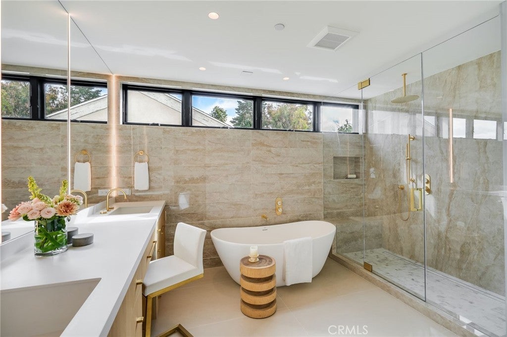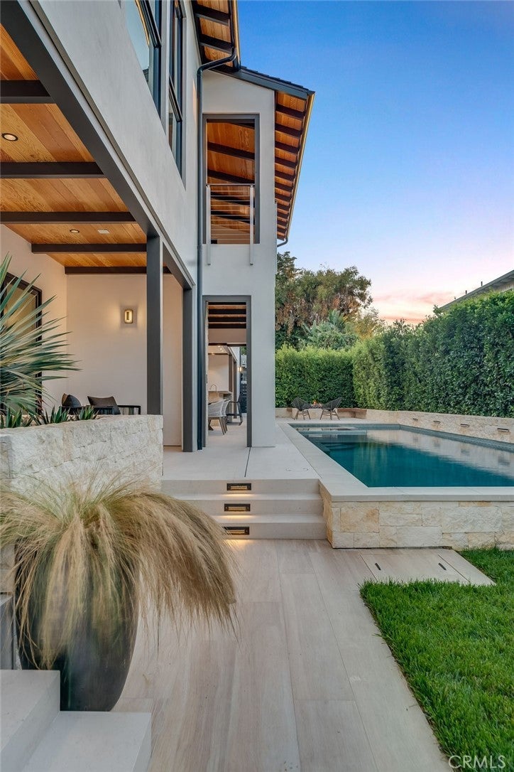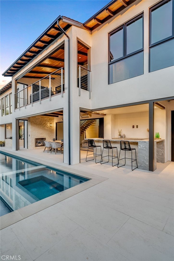 Rarely does a property that is created with such detail and care come to market immediately after completion. Welcome to 427 Santa Ana, your opportunity to own a curated luxury property without the wait! Thoughtfully designed by architect Karl Dakteris, this remarkable, newly constructed, custom modern masterpiece will check all of your boxes, from the 5 bedrooms each with en suite bathroom, the attached multi-level ADU, to the stunning double wide parcel with prime indoor/outdoor living. The grandeur of this home unfolds as you enter through the impressive entrance and find yourself swept into a world of high end modern luxury. Utilizing a mix of quality natural materials and expansive walls of glass to allow for natural light, this home is a stunning combination of contemporary design and warmth. Travel through the open-concept layout, anchored by a two-story limestone fireplace wall and a striking custom chandelier of European hand-blown glass, and discover exceptional attention to detail throughout. The heart of the home is the intelligently designed kitchen. With an extra-large central island, gorgeous and functional Dekton countertops, custom minimalist cabinetry, high end chef’s appliances, a walk-in pantry, and an additional complete caterer’s kitchen, this custom kitchen is the perfect backdrop for any gathering or culinary adventure. Retreat to the primary suite where you will find dual walk-in closets, a luxurious spa-like bath outfitted for ultimate relaxation, and an attached large deck. Travel downstairs by way of the central floating steps, or custom elevator, and find yourself in the secondary living space with access to the rear yard - designed to entertain with ease under the covered loggia, around the fully equipped bar, or by the sparkling pool surrounded by lush landscaping that provides privacy and seclusion. An attached ADU provides an additional living space in a beautifully compact fully functioning 2-story home – the perfect space for extended family, live-in help, guests, or even grown children. Additional important home features include - Lutron lighting, owned solar, security system, a/v wiring and speakers throughout, pre-wired shades, etc. In the heart of Newport Heights, find yourself moments from Newport Beach's award winning schools, famous beaches, exceptional retail shops and restaurants.