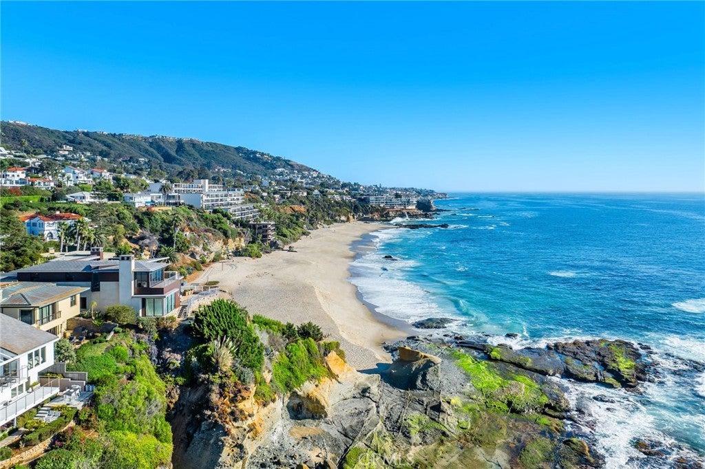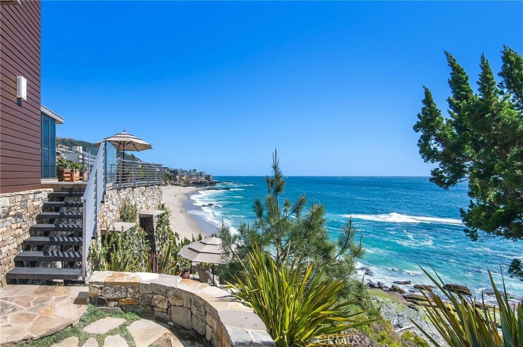 15 Camel Point is an exquisitely executed contemporary oceanfront offering with rare direct beach access via the estate’s private staircase. Sited on over a third of an acre at the end of the point just south of the famed Montage Laguna Beach, this architecturally significant property designed by Bill Murray features stunning 270-degree views of the Pacific Ocean. The interiors, curated by Tommy Chambers, are a study in form and function: concrete, glass, natural stone, and wood elements are seamlessly combined throughout. The main level of this approximately 5,100 square foot estate located in one of Orange County’s most sought-after gated enclaves features distinct entertaining areas, with walls of glass on all sides and views of the Pacific Ocean beyond. Numerous multi-paneled doors expertly connect the interior with the property’s several large patio areas for the essential indoor-outdoor California living experience. The primary suite occupies the majority of the upper level and is comprised of an ocean-facing bedroom, dream bathroom with stand alone tub, a massive master closet, and an adjacent home office. The lower floor can be utilized as a home gym, play area, or converted into additional sleeping quarters. A garage with a hydraulic lift is a car lover’s dream. The numerous spacious outdoor patios offer an ideal setting for enjoying panoramic views spanning from Dana Point to Palos Verdes in an ultra-private location, with West Street, Treasure Island, and Aliso Beaches just steps away. Property is currently under major construction and around year out from final completion.