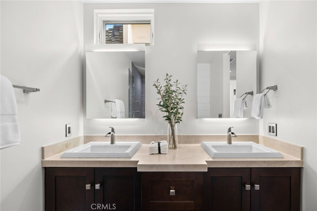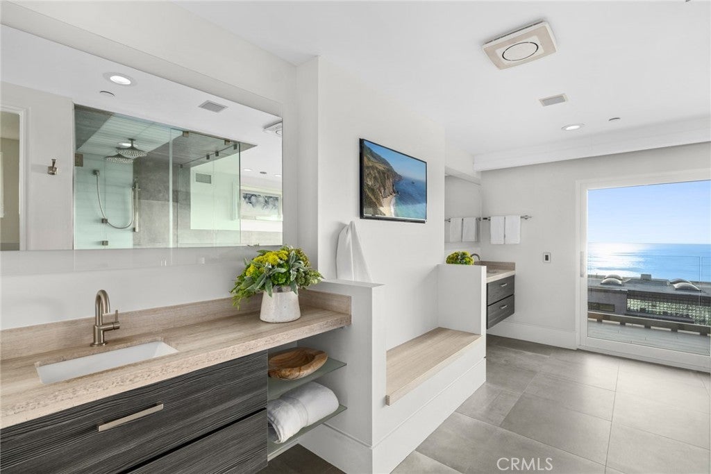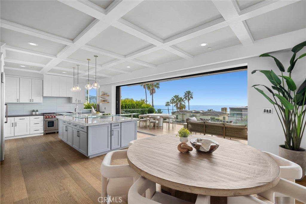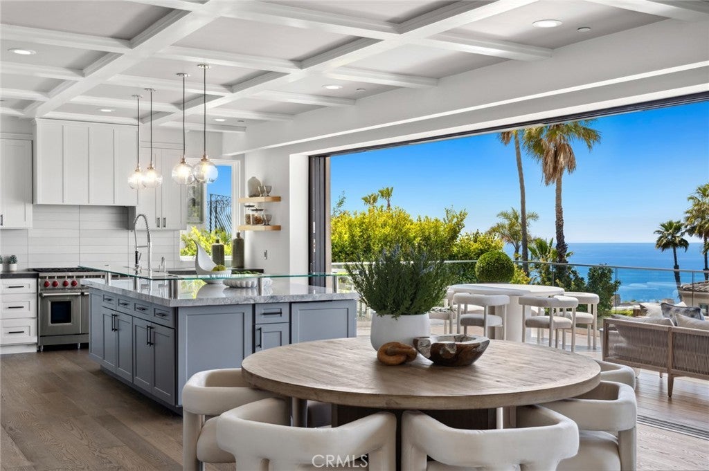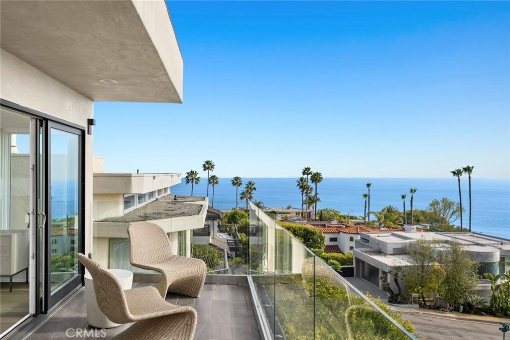 Nestled near the end of a peaceful cul-de-sac in Laguna Beach’s desirable Portafina enclave, this stunning custom home is a true oasis offering exceptional privacy and unparalleled ocean views. Flashing sparkles of light reflecting off the Pacific Ocean, Catalina Island’s iconic silhouette, and city lights twinkling after sunset are just some of the captivating visual delights that you will enjoy. Extensively remodeled and expanded, the modern showplace captures views from indoor and outdoor living spaces. Extending approximately 3,315 square feet, a phenomenal floorplan with four ensuite bedrooms and four- and one-half baths provides an impressive flow that accommodates easy entertaining, all with the ocean as a gorgeous backdrop. The main level is introduced by a large living room with vaulted ceiling and a stacked-stone fireplace flanked by custom built-ins. Walls of slideaway glass doors open this level to a generous heated deck where friends and loved ones will savor ever-changing ocean views. A lounge and glass-enclosed temperature-controlled wine room set the tone for elegant dinner parties in the dining room, which transitions seamlessly to a fabulous island kitchen. Chefs of all skill levels will appreciate the style and functionality of abundant Shaker cabinetry and stone countertops. A built-in refrigerator displays cabinet-matched panels, while a built-in coffee station is joined by a six-burner Wolf range and double oven. Truly one of a kind, the residence offers an elevated design aesthetic that is destined to stand the test of time. Wood flooring, coffered ceilings, designer lighting fixtures and top-tier finishes and millwork are showcased throughout. Guests will feel at home in a main-level bedroom that offers the convenience of flexibility. For the ultimate escape, the fireplace-warmed primary suite opens to sweeping ocean views on a private deck and reveals a sitting room and two walk-in closets. An oversized rain shower and a soaking tub enrich the primary bath. On par with the interior, the exterior of the home is exceptional. Curb appeal is redefined with impeccable landscaping and custom front-yard hardscaping. Parking for four is accommodated with two driveway spaces and a two-car garage. Victoria Beach and Woods Cove are nearby, and resorts, restaurants and shopping are minutes from home. Your dream of sharing a home of this caliber with the people you love can come true at this extraordinary Laguna Beach residence.