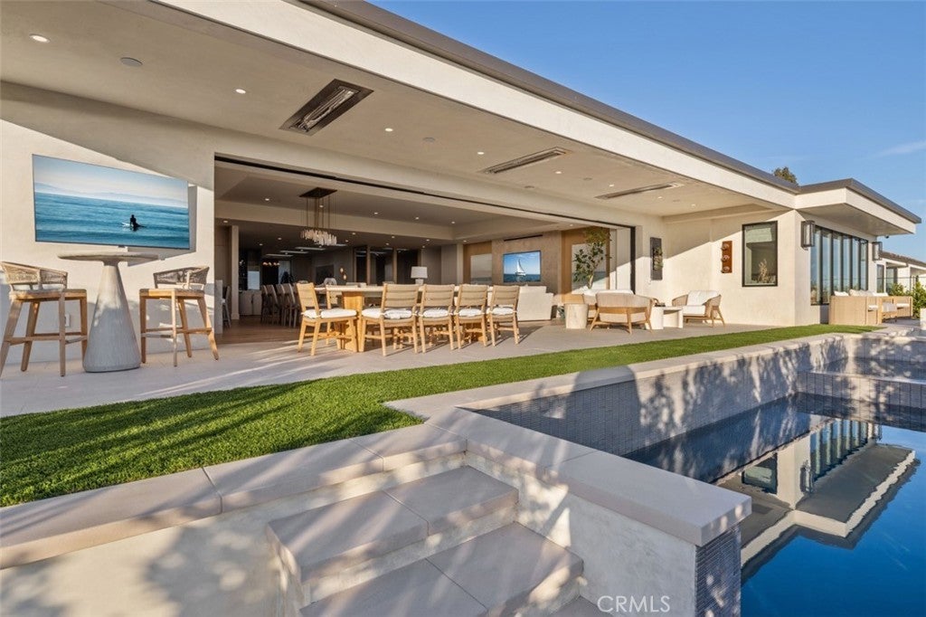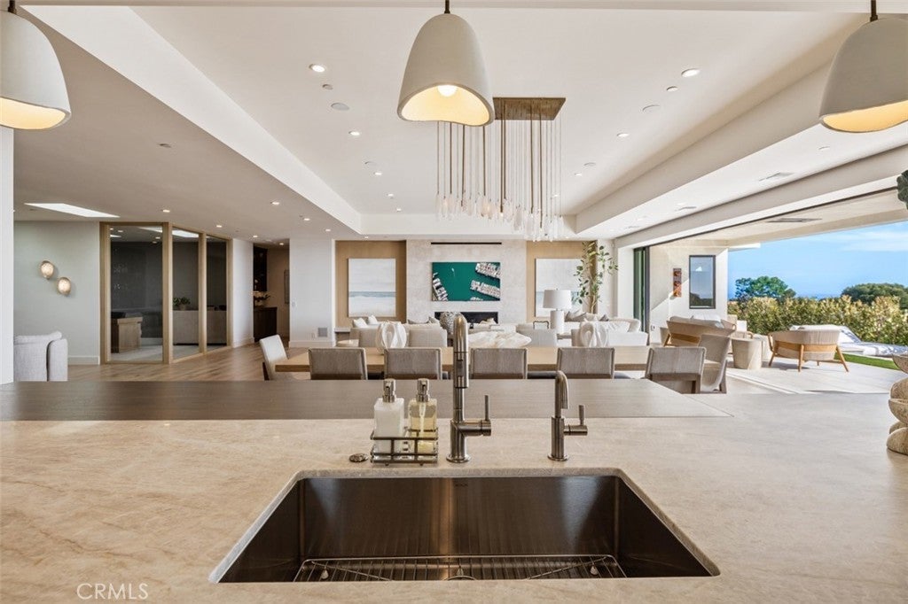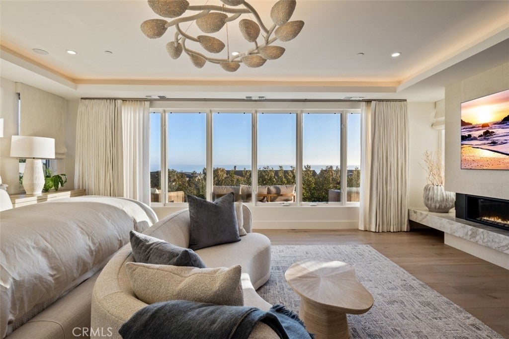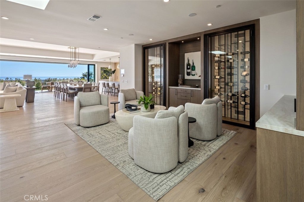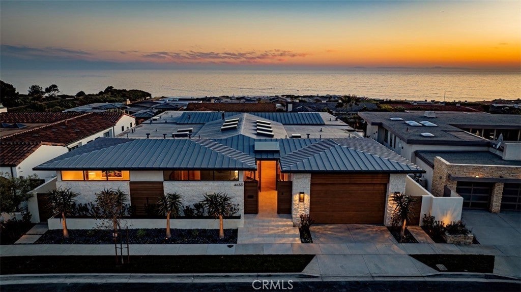 Set in Corona Del Mar’s most prestigious oceanfront community, this brand-new single-level home in Cameo Shores captures the very essence of refined coastal living and high-end design. Conceived by architect Mark Teale, constructed by Nicholson Companies, and finished with the refined eye of Bliss Home Design, every detail of this warm contemporary residence reflects elevated craftsmanship and comfort. Upon arrival, one is welcomed by a calming water wall, a prelude to the natural flow and serenity showcased throughout the home. Enter through a grand wood pivot door into an airy layout highlighted by wide-plank white oak floors, custom natural stone finishes, and thoughtfully placed skylights that fill the home with soft natural light. Every corner invites an emotional connection, none more compelling than the expansive great room, which blurs the line between indoor and outdoor living with pocketing glass walls that frame priceless vistas of the Pacific Ocean and Catalina Island beyond. The main living space includes a sleek entertainment area featuring dual temperature-controlled wine walls and a bespoke bar, leading to a chef-caliber kitchen with Wolf and Sub-Zero appliances, Miele coffee system, and a striking two-toned island finished in Taj Mahal quartzite beneath custom ceramic pendants. Set around a stunning sculptural chandelier, the formal dining area is ready for elevated entertaining. Privacy and comfort define the home’s four en-suite bedrooms, including a luxurious primary suite with a fireplace, wet bar, spa-like bath with dual walk-in shower, soaking tub, dual vanities, and a spacious walk-in closet. Additional highlights include a dedicated executive office, a versatile media room/den adorned in rich wood paneling, and a party prep room designed to support effortless entertaining, just off the three-car garage. Outside, a private oasis awaits with a custom pool and spa, outdoor kitchen with BBQ and wet bar, firepit, and a heated TV lounge area, all surrounded by lush curated landscaping and designed to take full advantage of the sunset views. Here in Cameo Shores, residents enjoy exclusive access to three private beach gates, a picturesque community park, and a world-class lifestyle just minutes from Crystal Cove, Fashion Island, and the dining and shopping of CDM Village. Much more than merely a residence, this property is an everyday retreat that brings together style, sophistication, and the serenity of coastal California living.