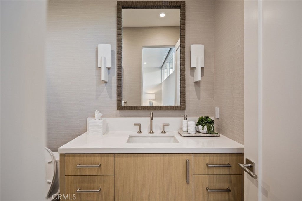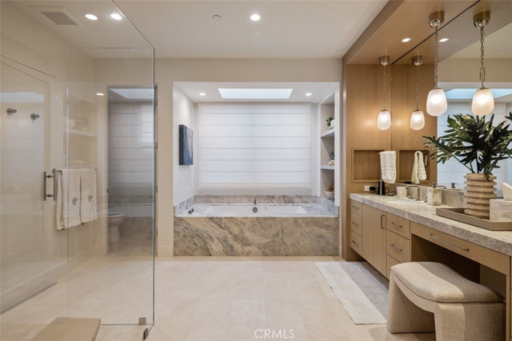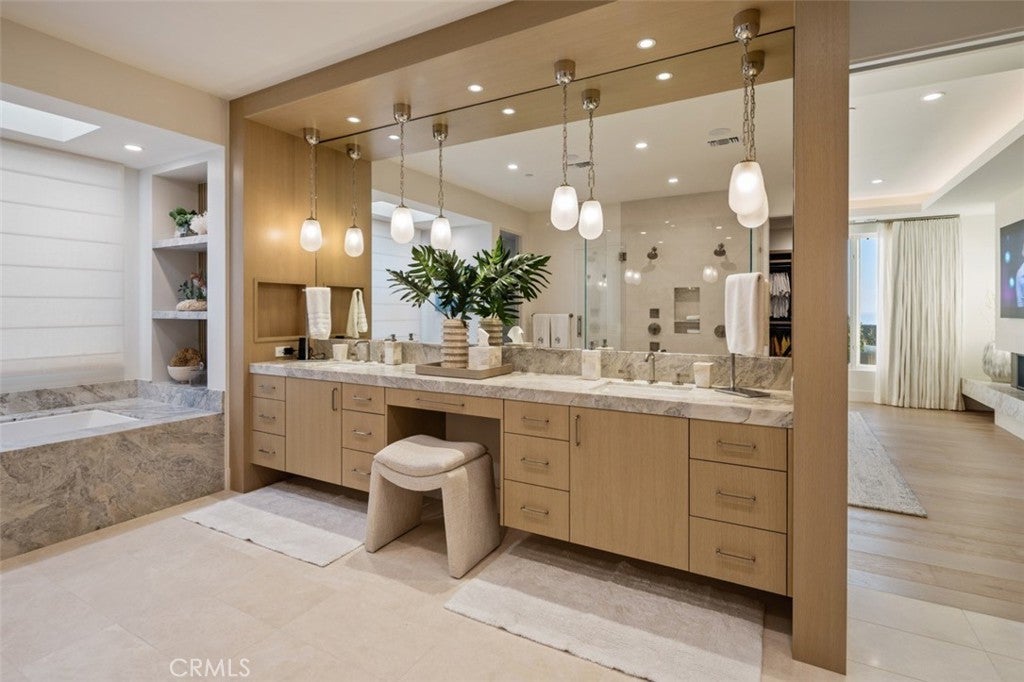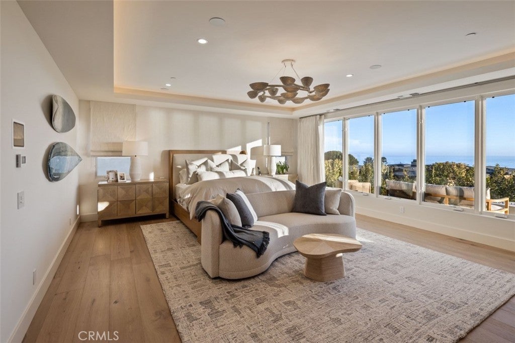Set in Corona Del Mar’s most prestigious oceanfront community, this brand-new single-level home in Cameo Shores captures the very essence of refined coastal living and high-end design. Conceived by architect Mark Teale, constructed by Nicholson Companies, and finished with the refined eye of Bliss Home Design, every detail of this warm contemporary residence reflects elevated craftsmanship and comfort. Upon arrival, one is welcomed by a calming water wall, a prelude to the natural flow and serenity showcased throughout the home. Enter through a grand wood pivot door into an airy layout highlighted by wide-plank white oak floors, custom natural stone finishes, and thoughtfully placed skylights that fill the home with soft natural light. Every corner invites an emotional connection, none more compelling than the expansive great room, which blurs the line between indoor and outdoor living with pocketing glass walls that frame priceless vistas of the Pacific Ocean and Catalina Island beyond. The main living space includes a sleek entertainment area featuring dual temperature-controlled wine walls and a bespoke bar, leading to a chef-caliber kitchen with Wolf and Sub-Zero appliances, Miele coffee system, and a striking two-toned island finished in Taj Mahal quartzite beneath custom ceramic pendants. Set around a stunning sculptural chandelier, the formal dining area is ready for elevated entertaining. Privacy and comfort define the home’s four en-suite bedrooms, including a luxurious primary suite with a fireplace, wet bar, spa-like bath with dual walk-in shower, soaking tub, dual vanities, and a spacious walk-in closet. Additional highlights include a dedicated executive office, a versatile media room/den adorned in rich wood paneling, and a party prep room designed to support effortless entertaining, just off the three-car garage. Outside, a private oasis awaits with a custom pool and spa, outdoor kitchen with BBQ and wet bar, firepit, and a heated TV lounge area, all surrounded by lush curated landscaping and designed to take full advantage of the sunset views. Here in Cameo Shores, residents enjoy exclusive access to three private beach gates, a picturesque community park, and a world-class lifestyle just minutes from Crystal Cove, Fashion Island, and the dining and shopping of CDM Village. Much more than merely a residence, this property is an everyday retreat that brings together style, sophistication, and the serenity of coastal California living.