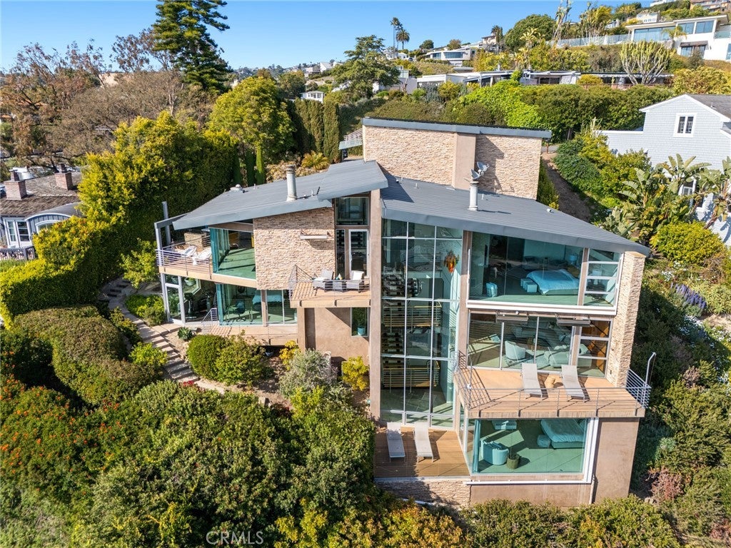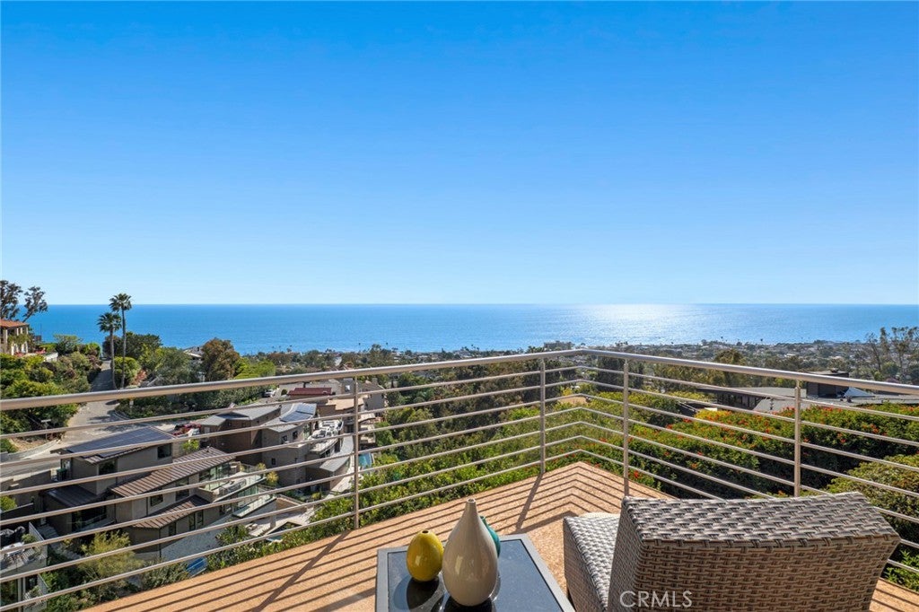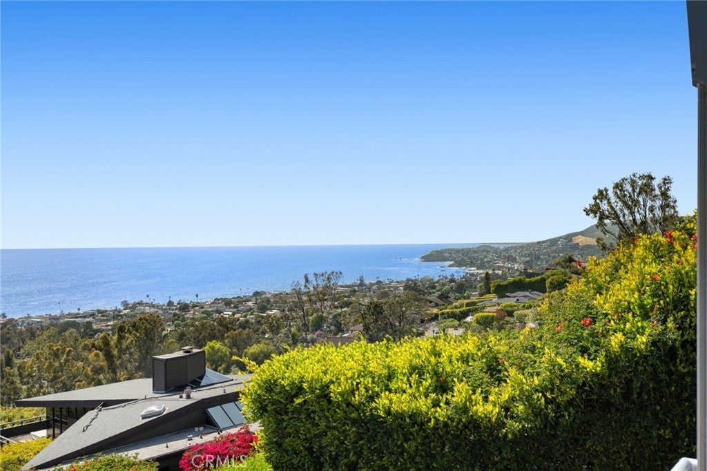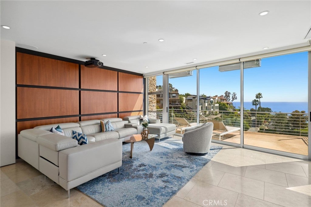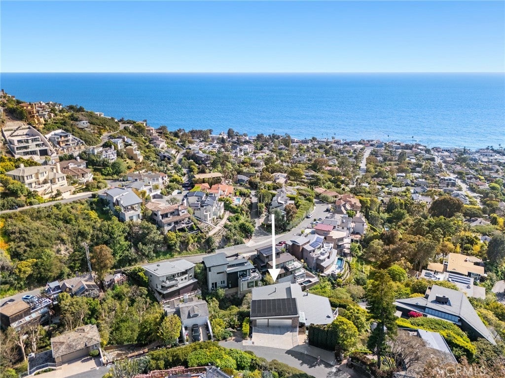 Welcome to a Mark Singer-designed sanctuary where modern sophistication meets coastal serenity. Perched in the highly sought-after enclave of Woods Cove, this one-of-a-kind 4-bedroom, 4,400 SF architectural marvel offers sweeping, unobstructed views of the Pacific Ocean, Catalina Island, and the pristine coastline of Laguna Beach. From the moment you step through the front door, you're enveloped in floor-to-ceiling ocean vistas, soft coastal breezes, and refined finishes that evoke the indulgence of a five-star resort. Thoughtfully upgraded with newly installed and fully owned Tesla solar panels, the home offers cutting-edge energy efficiency without compromising luxury. The main level hosts a breathtaking primary suite with expansive walls of glass framing the endless seascape and twinkling city lights. The spa-inspired ensuite bath features heated floors, vaulted ceilings, and timeless elegance. A true chef’s kitchen awaits with quartzite countertops and backsplash, a large central island, and top-tier appliances including a Hestan range, Liebherr refrigerator, Cove dishwasher, and built-in two-drawer refrigerator. A spacious walk-in pantry adds convenience and style. Seamless indoor-outdoor living is at the heart of this home, with a tranquil water feature leading to a large entertaining deck—ideal for sunset dinners or lively gatherings under the stars. The mid-level offers a second living area for entertaining, complete with a built-in projector, expansive ocean-facing deck, and a climate-controlled 800-bottle wine cellar—perfect for movie nights or intimate tastings. Each secondary bedroom suite is a private retreat, featuring its own terrace, entrance, and coastal views. One room also doubles as a creative studio or home office. A distinctive staircase adds architectural flair, capturing sunlight and ocean sparkle by day and golden sunsets by night. Practical luxury continues with a generous three-car garage and a full driveway, ideal for guests and car collectors. And with fully owned Tesla solar, you’ll enjoy sustainable living with reduced energy costs—without sacrificing comfort. This is more than a home; it's a lifestyle—a rare opportunity to live above the waves in timeless style, just moments from world-class beaches, restaurants, boutique shopping, and the vibrant Laguna Beach art scene.