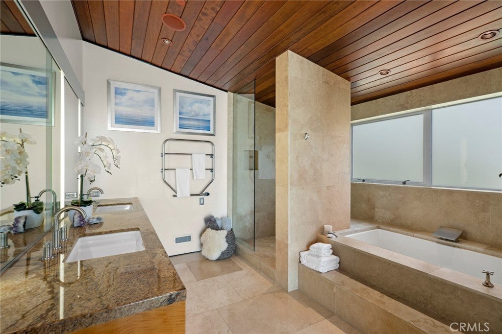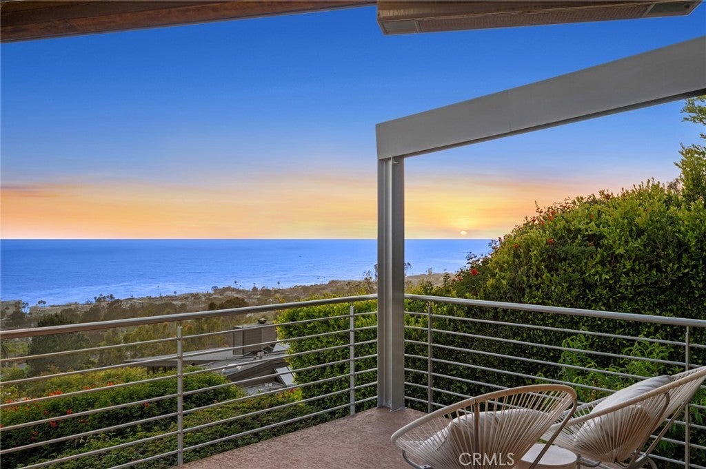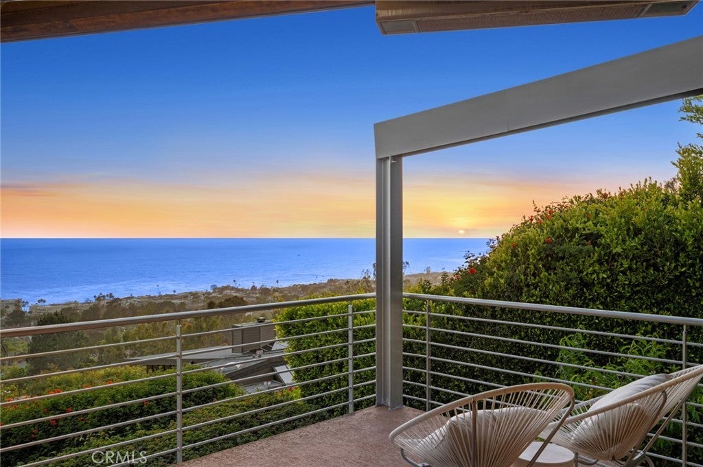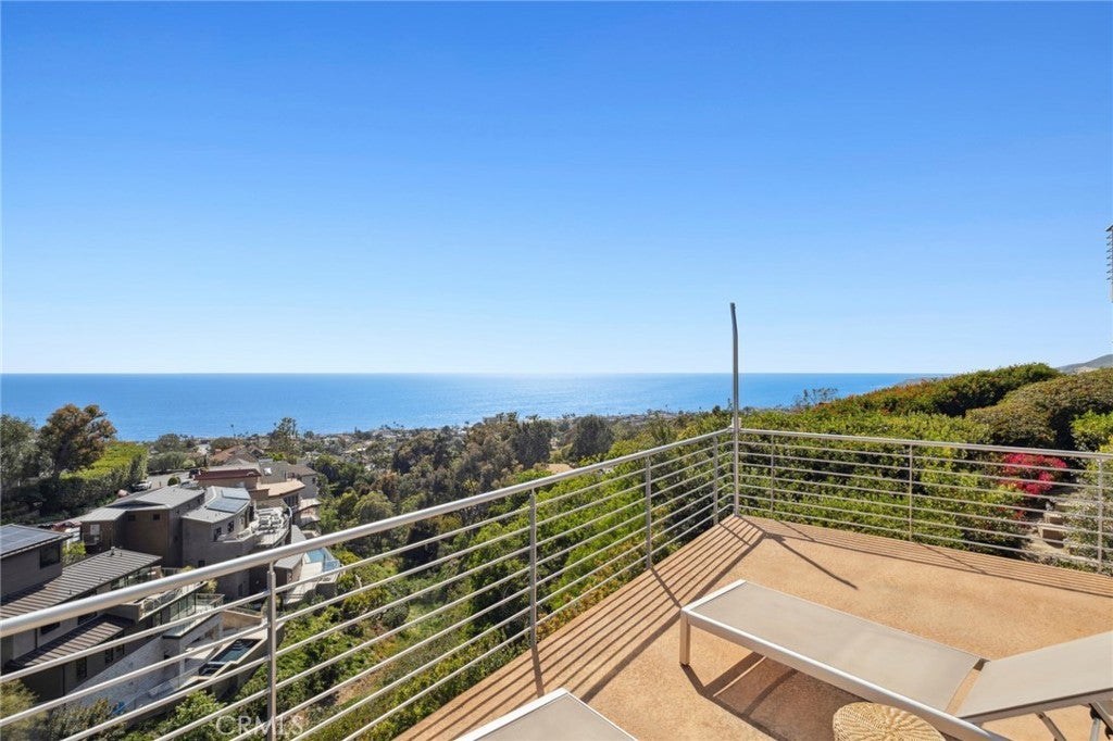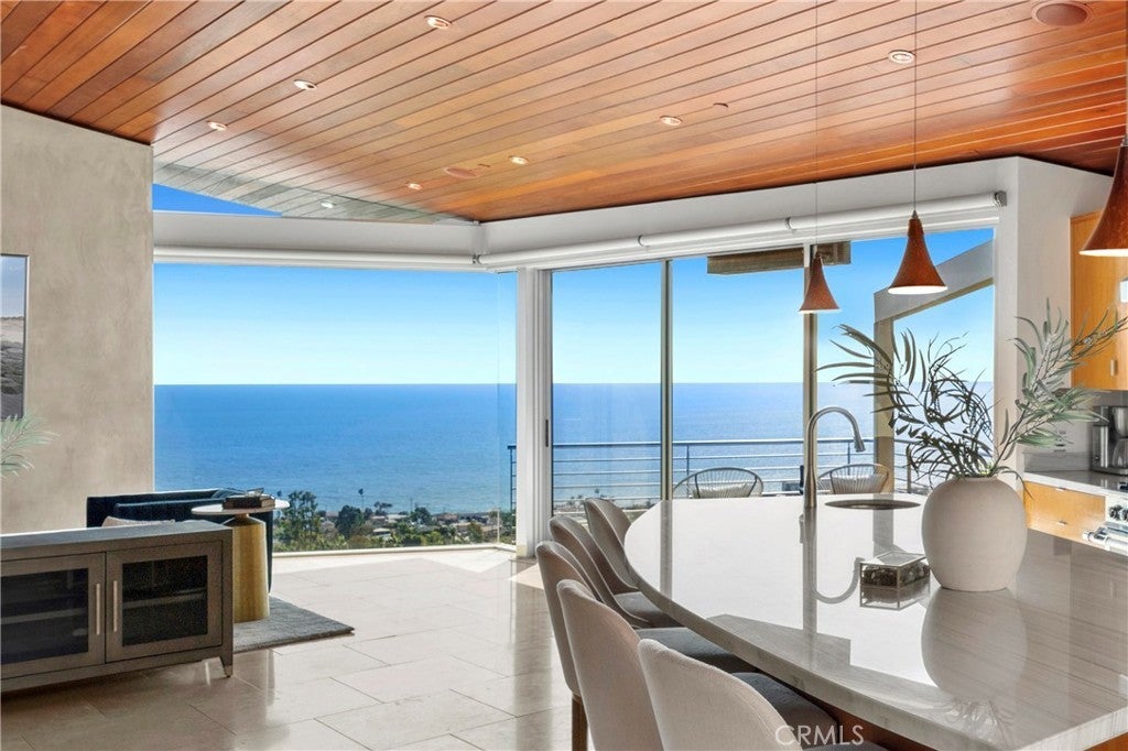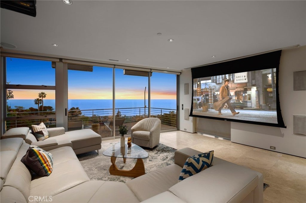 Welcome to a Mark Singer-designed sanctuary where modern sophistication meets coastal serenity. Perched in the highly sought-after enclave of Woods Cove, this one-of-a-kind 4-bedroom, 4,400 SF architectural marvel offers sweeping, unobstructed views of the Pacific Ocean, Catalina Island, and the pristine coastline of Laguna Beach. From the moment you step through the front door, you're enveloped in floor-to-ceiling ocean vistas, soft coastal breezes, and refined finishes that evoke the indulgence of a five-star resort. Thoughtfully upgraded with newly installed and fully owned Tesla solar panels, the home offers cutting-edge energy efficiency without compromising luxury. The main level hosts a breathtaking primary suite with expansive walls of glass framing the endless seascape and twinkling city lights. The spa-inspired ensuite bath features heated floors, vaulted ceilings, and timeless elegance. A true chef’s kitchen awaits with quartzite countertops and backsplash, a large central island, and top-tier appliances including a Hestan range, Liebherr refrigerator, Cove dishwasher, and built-in two-drawer refrigerator. A spacious walk-in pantry adds convenience and style. Seamless indoor-outdoor living is at the heart of this home, with a tranquil water feature leading to a large entertaining deck—ideal for sunset dinners or lively gatherings under the stars. The mid-level offers a second living area for entertaining, complete with a built-in projector, expansive ocean-facing deck, and a climate-controlled 800-bottle wine cellar—perfect for movie nights or intimate tastings. Each secondary bedroom suite is a private retreat, featuring its own terrace, entrance, and coastal views. One room also doubles as a creative studio or home office. A distinctive staircase adds architectural flair, capturing sunlight and ocean sparkle by day and golden sunsets by night. Practical luxury continues with a generous three-car garage and a full driveway, ideal for guests and car collectors. And with fully owned Tesla solar, you’ll enjoy sustainable living with reduced energy costs—without sacrificing comfort. This is more than a home; it's a lifestyle—a rare opportunity to live above the waves in timeless style, just moments from world-class beaches, restaurants, boutique shopping, and the vibrant Laguna Beach art scene.