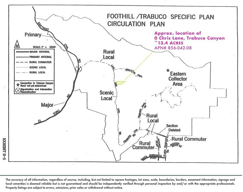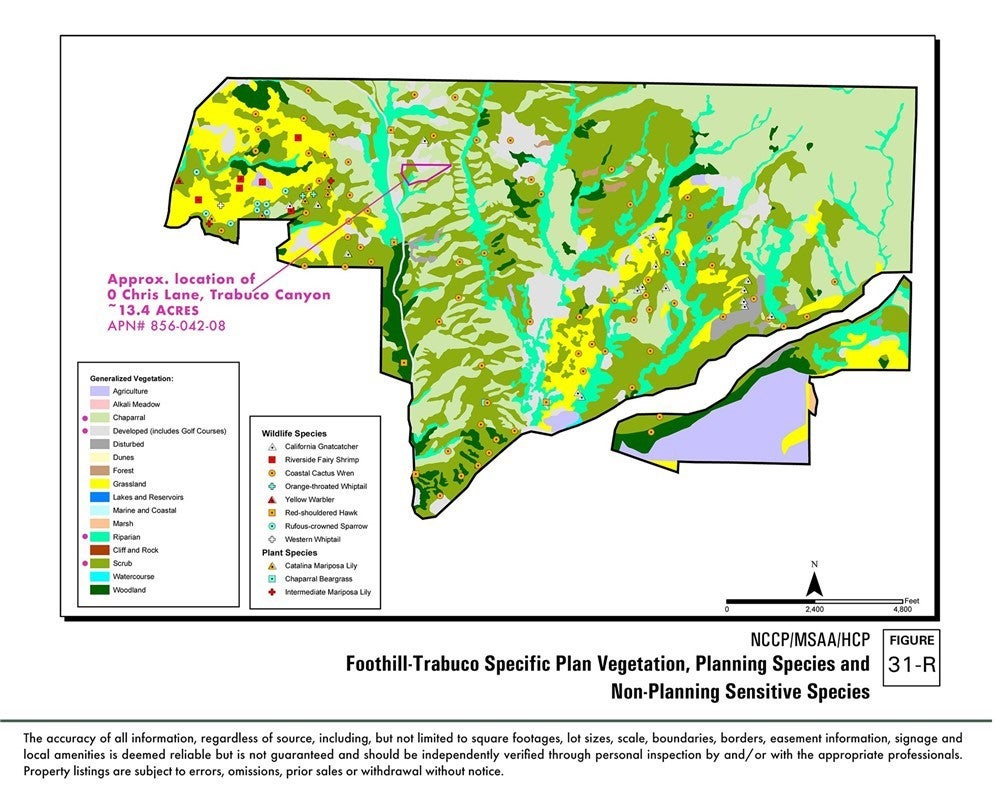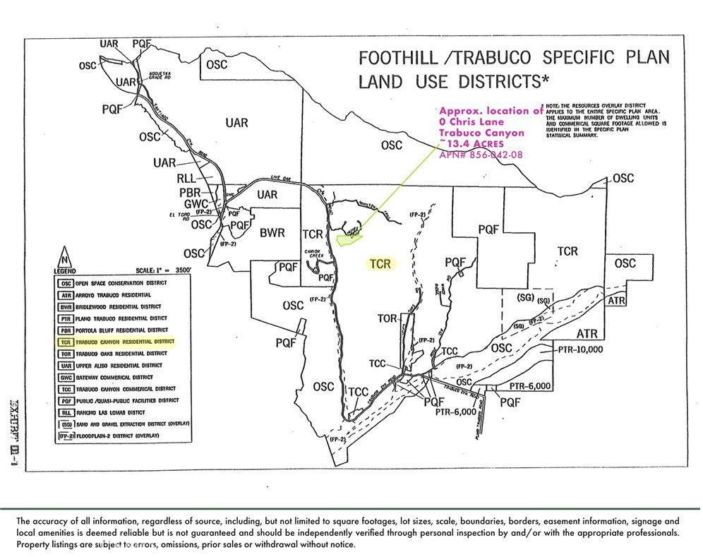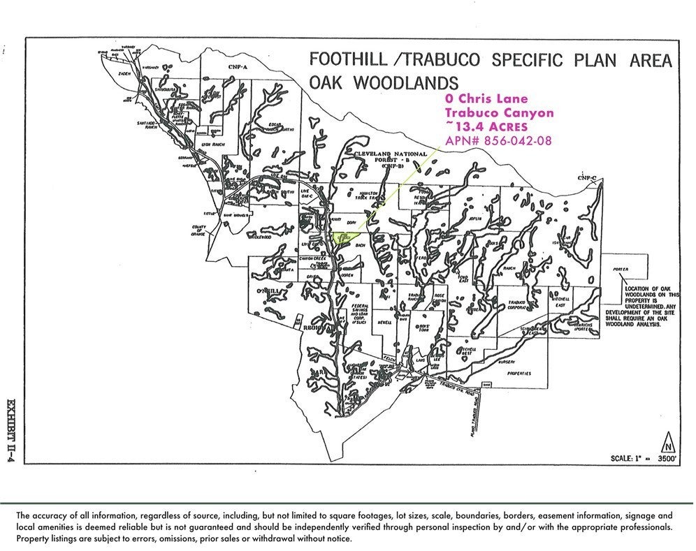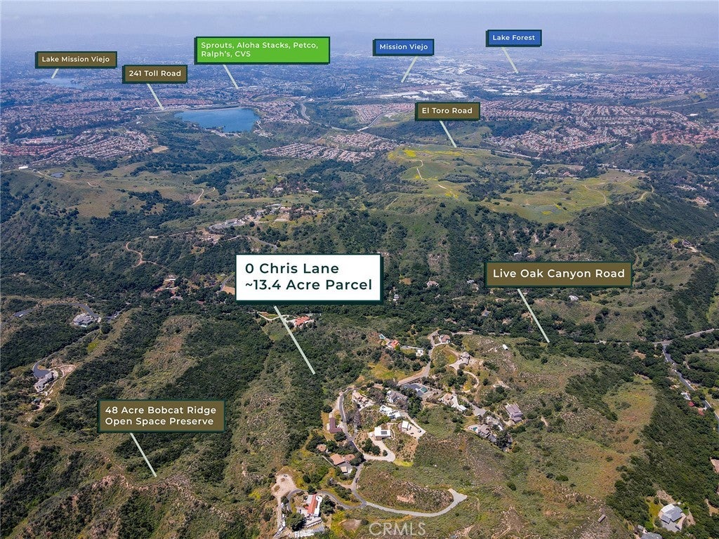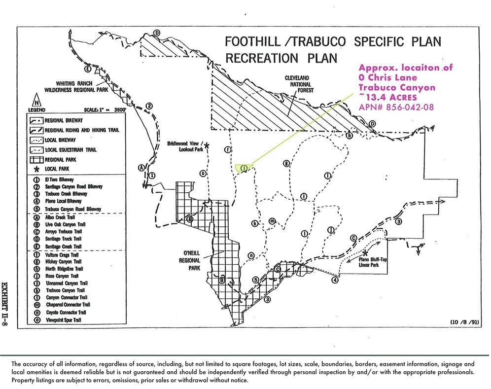 Located just off picturesque Live Oak Canyon Road in Trabuco Canyon, this parcel is 13.4 acres of precious raw, rural land in Orange County - a truly rare commodity. Build an equestrian dream home overlooking the rural canyon, use it for conservation or mitigation banking purposes or - keep it as is and preserve it for future generations. This property has rolling hillsides, oak canyons, and views that stretch for miles, all located within a short drive to Rancho Santa Margarita & Mission Viejo. Get the best of both worlds - rugged and raw living only minutes from shopping, dining, grocery stores, great schools, and hiking & biking trails. The 241 toll road is less than 10 minutes away - get away to the beach or business centers of Irvine & Newport Beach in 20 - 30 minutes. The property is subject to the "Foothill/Trabuco Specific Plan" (FTSP) which was crafted to preserve the character of the canyons; the FTSP limits the uses of the property but ensures that the canyon areas will be developed responsibly and stay beautiful for generations to come. Development of three (3) dwelling units is possible per the FTSP, subject to satisfying development requirements of the FTSP & County of Orange.