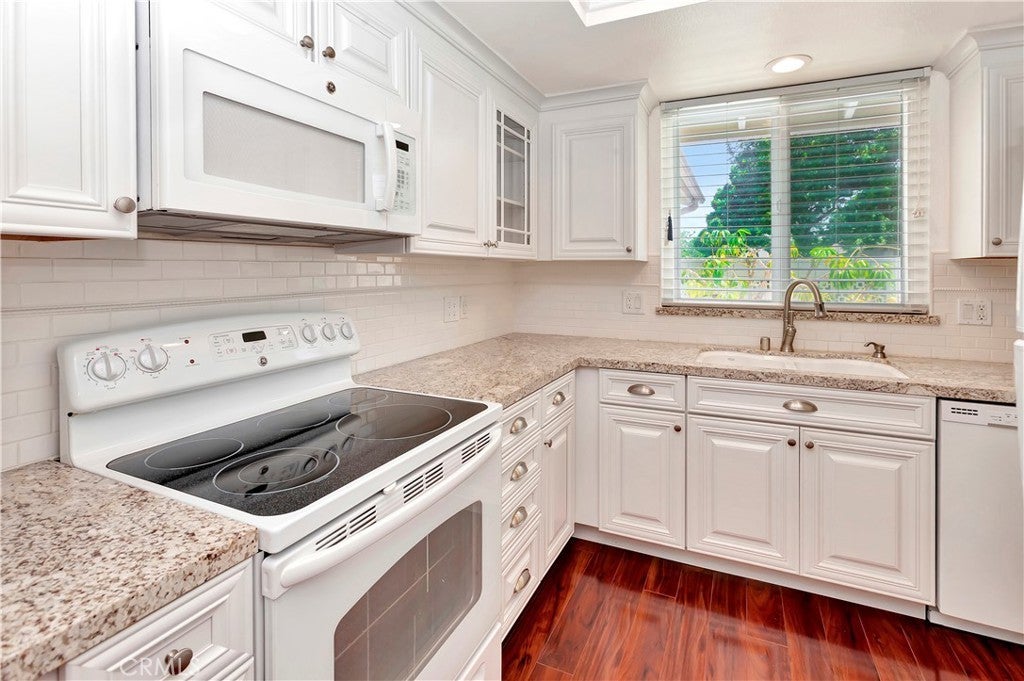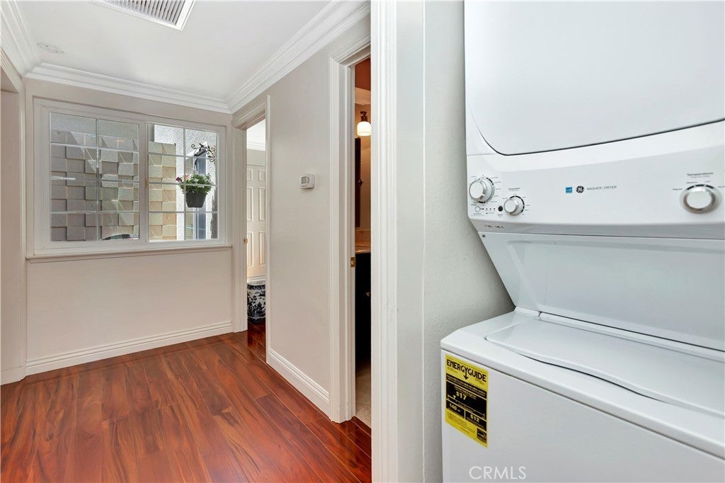 Curated in a warm cottage style, this beauty features a bright white kitchen with warm beige granite countertops and quiet close drawers. Plenty of storage and dedicated desk space. Upgraded appliances and window providing natural light. Wooden floors, new bright paint and crown molding flow seamlessly throughout the home. Ceilings updated with smooth modern finish. Updated bathroom with various lights and skylight to fit your needs. Stylish double sink vanity and safe shower. Topnotch washer/dryer combo conveniently located in the hallway. Big open living room/dining room combo with vaulted ceiling, floor to ceiling storage as well as plenty of light from windows and atrium. Two spacious bedrooms: one with wainscoting and warm grey paint off the atrium; the primary lit up by a huge window. Central AC and heating. Double paned windows. Nice front patio to expand your living space, plenty parking on front street and in the carport. Additional outdoor storage on porch and in carport. Laguna Woods Village is a gated community offering countless amenities, including: golf courses, tennis, pools, gyms, 200+ clubs (i.e. ceramics, woodworking, and jewelry making), restaurant, horseback riding, performing arts classes and center and much more. Additionally, Laguna Woods Village boasts a free private bus system to nearby shopping, banks, restaurants, mall, medical facilities & houses of worship. Co-op qualifications: Cash only; Income: $40,000.00. Assets: $125K plus the purchase price. Purchaser must be 55+. Purchaser must pay Cash (Seller or private financing could be an option, pending HOA approval). Contact Laguna Woods directly for Co-op qualification questions. Monthly fee of $931.39 includes $761.02 for assessment/dues (HOA) , $54.23 for Property Insurance and $116.14 for Property Taxes.