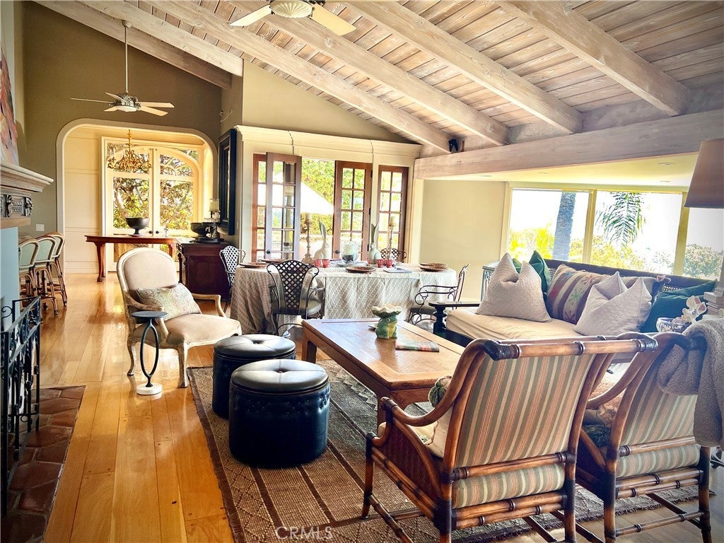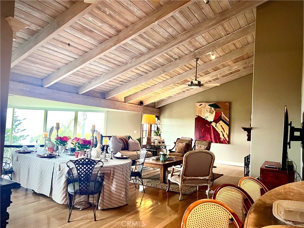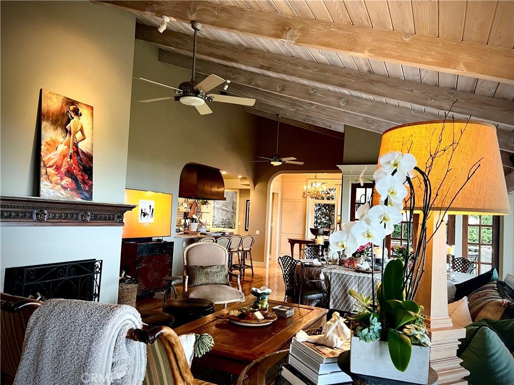 Breakfast Bar, Ceiling Fan(s), Cathedral Ceiling(s), Bedroom on Main Level, Primary Suite, Walk-In Closet(s), Beamed Ceilings, Dressing Area, Main Level Primary, Track Lighting
