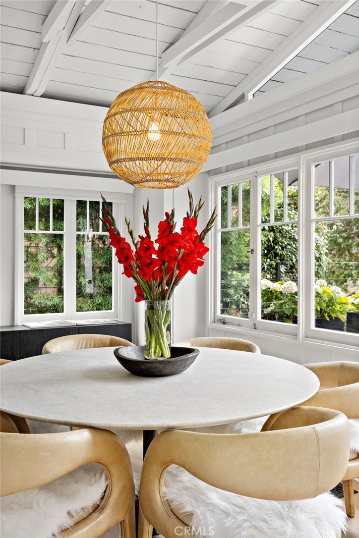 Separate/Formal Dining Room, Primary Suite, Beamed Ceilings, Ceiling Fan(s), Furnished, High Ceilings
