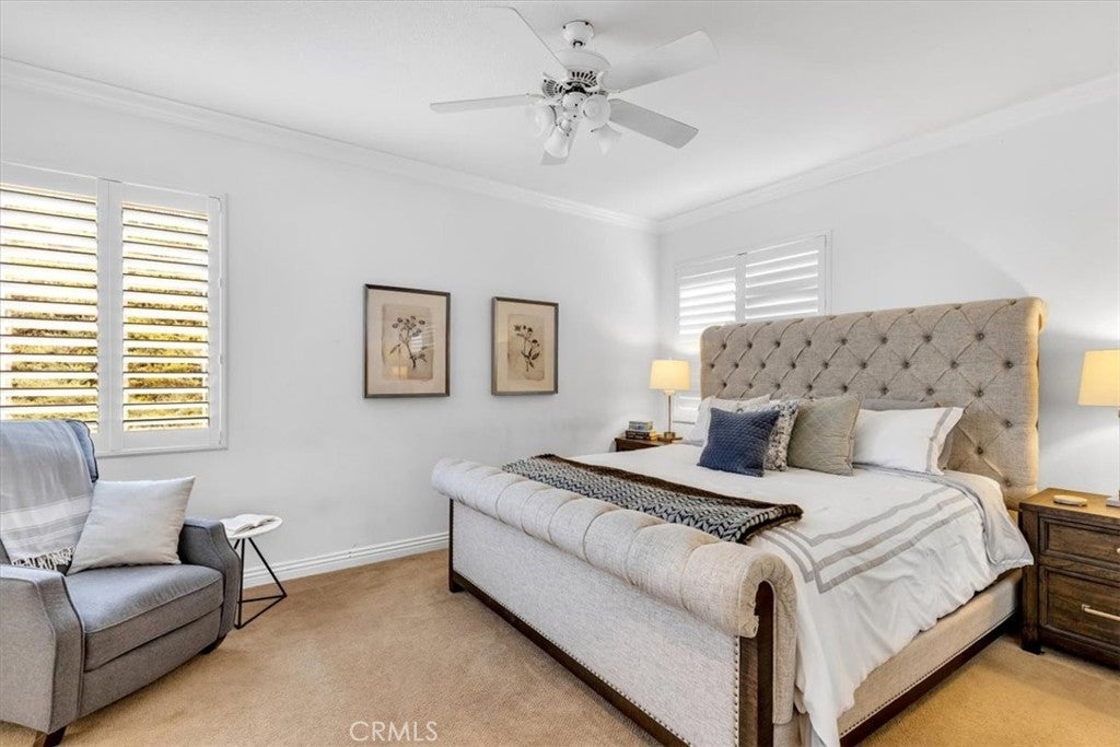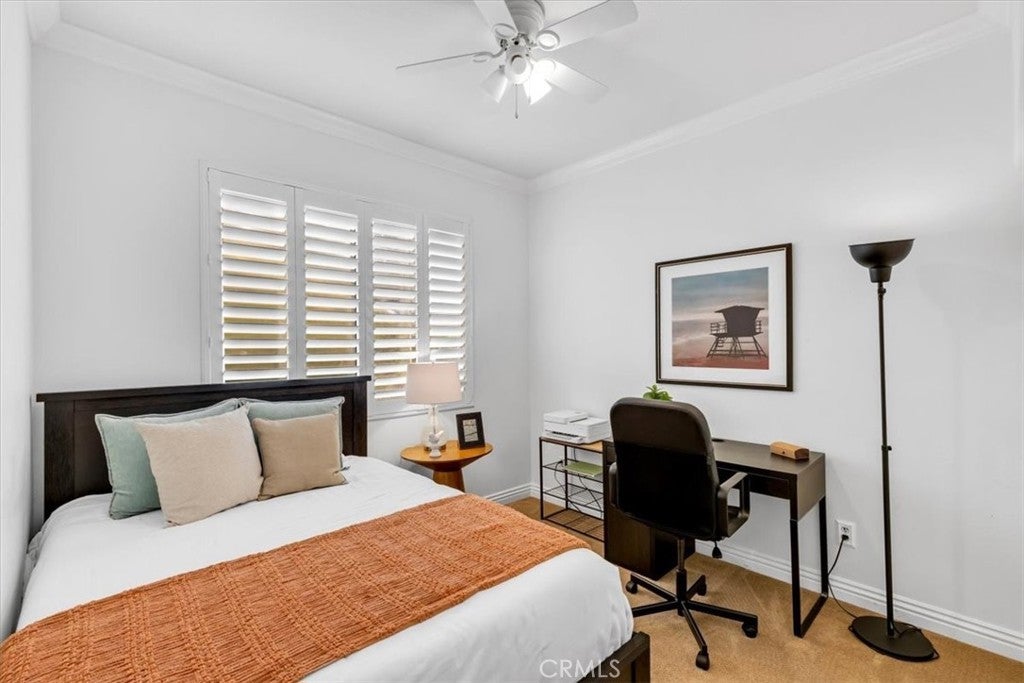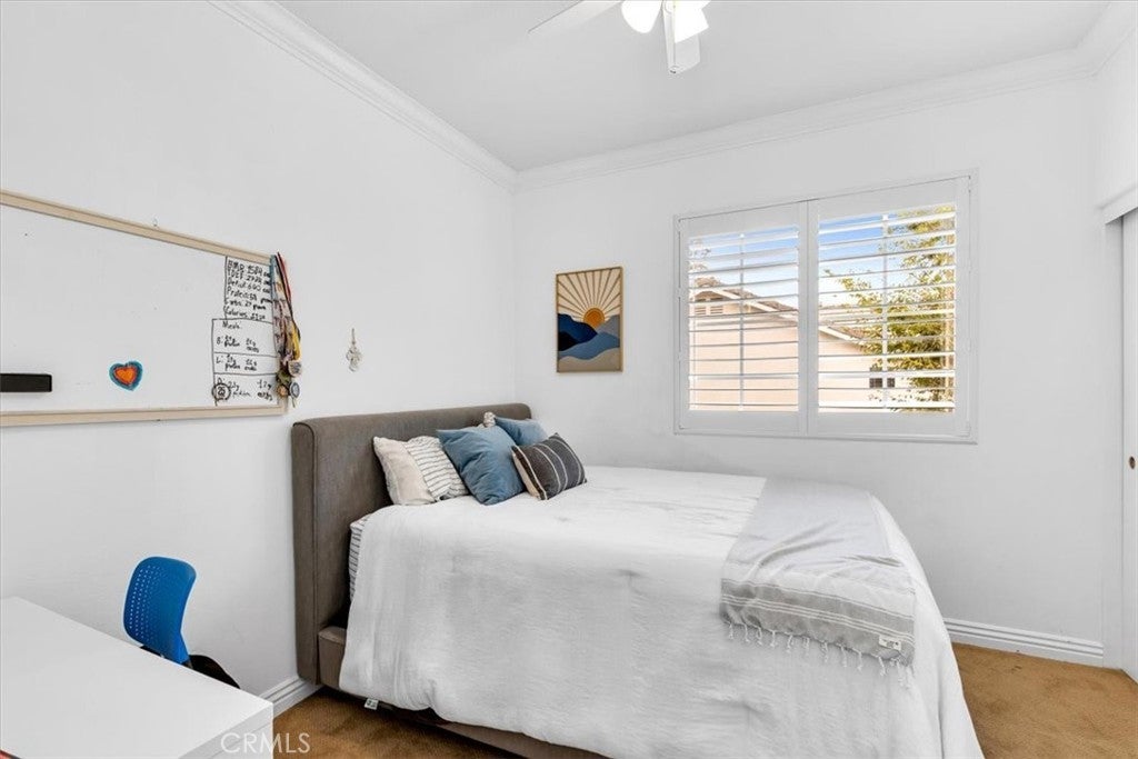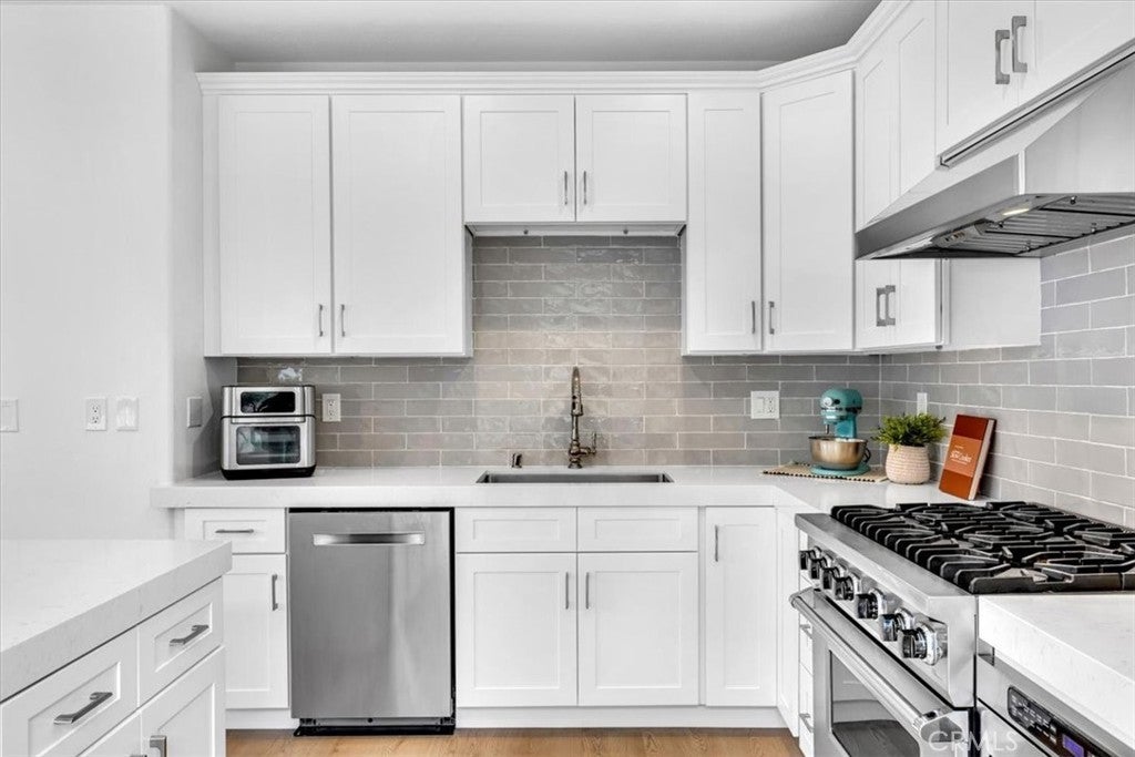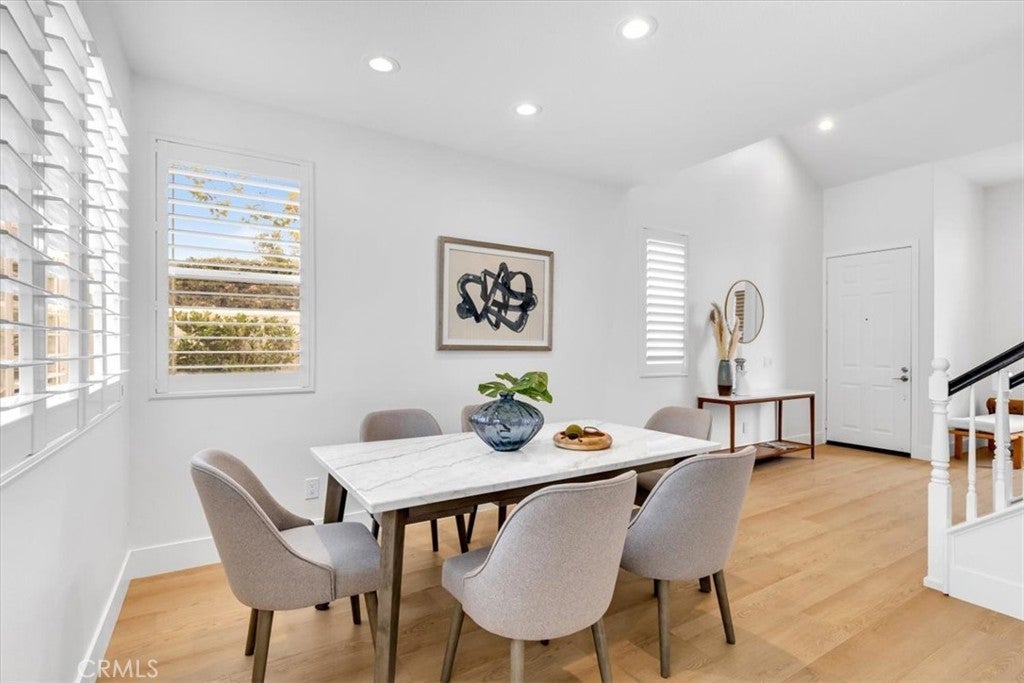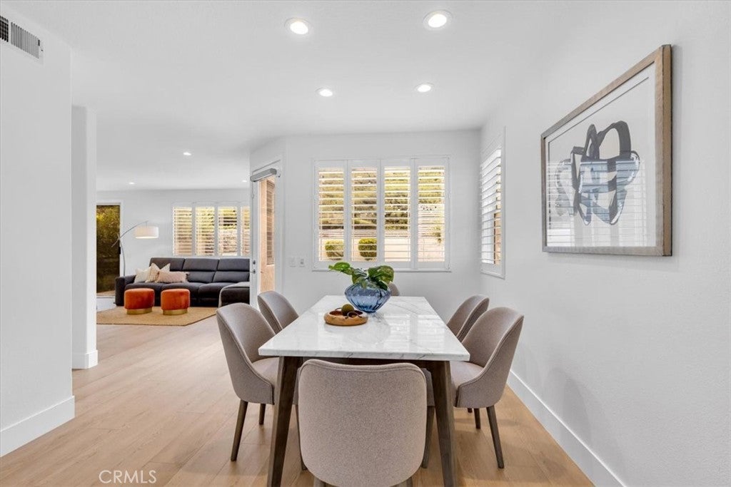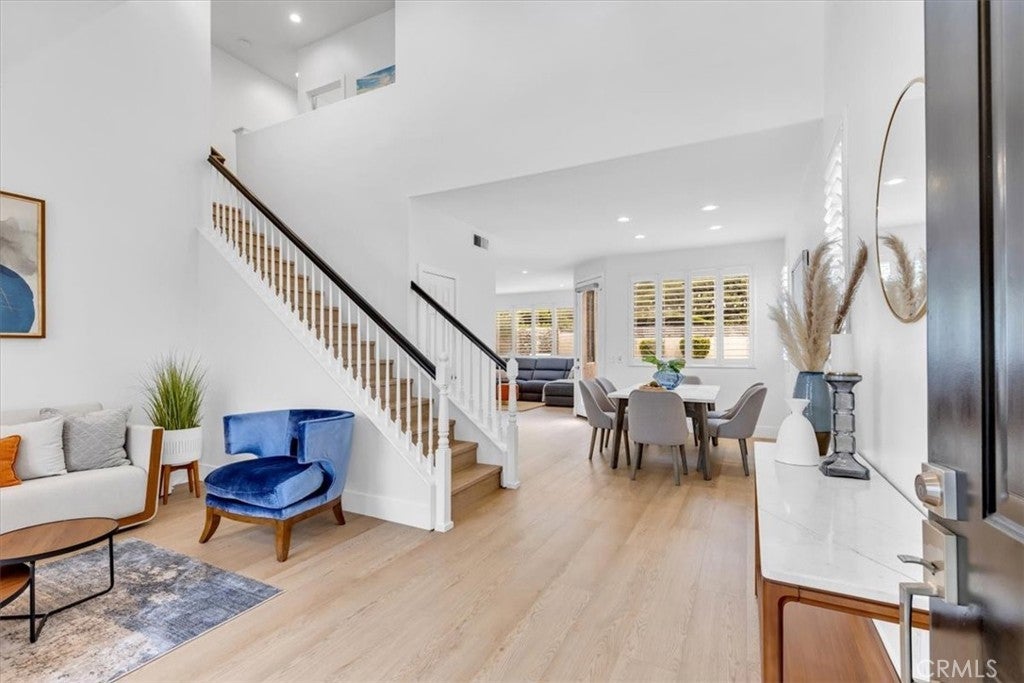 Welcome to this stunning 4-bedroom, 2.5-bathroom home in the desirable Harvest community of Aliso Viejo, where homes rarely come on the market. Perfectly situated on a corner lot at the end of a quiet cul-de-sac, this nearly 1,900 sq. ft. residence blends comfort, style, and functionality in every detail. From the moment you enter, you’re greeted by soaring ceilings, abundant windows, and natural light, creating an inviting and airy atmosphere. Plantation shutters add timeless elegance while maintaining privacy. The open-concept main level is designed for modern living, featuring brand-new laminate flooring throughout and a remodeled kitchen with recessed lighting, quartz countertops, shaker cabinetry, a Viking 6-burner gas range, and Bosch stainless steel refrigerator and microwave—ideal for both everyday meals and entertaining guests. The peaceful backyard, accessible directly from the kitchen, feels like a true extension of the living space. Complete with a built-in grill and plenty of room for gatherings, it’s the perfect spot for summer barbecues, weekend entertaining, or simply relaxing outdoors. Upstairs, you’ll find all four bedrooms along with a conveniently located laundry room. The secondary bathroom is generously sized, offering dual sinks, crown molding, tile floors, and a shower/tub combination. The primary suite is a luxurious retreat with a mirrored closet door, a large walk-in closet, and a spa-inspired bathroom showcasing dual sinks with granite counters, a soaking tub, a step-in glass shower, crown molding, and custom lighting. The Harvest community is known for its pride of ownership and peaceful setting. Enjoy being within walking distance to neighborhood parks, hiking, and biking trails, and just a short drive to shopping, dining, entertainment, and convenient freeway and toll road access. Families will especially appreciate the home’s location within the award-winning Aliso Viejo school district. Don’t miss this rare opportunity to own in Harvest—schedule your private showing today!