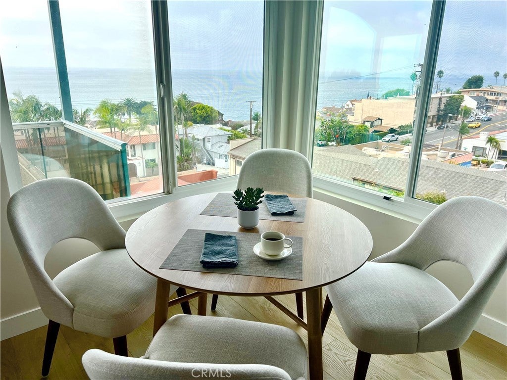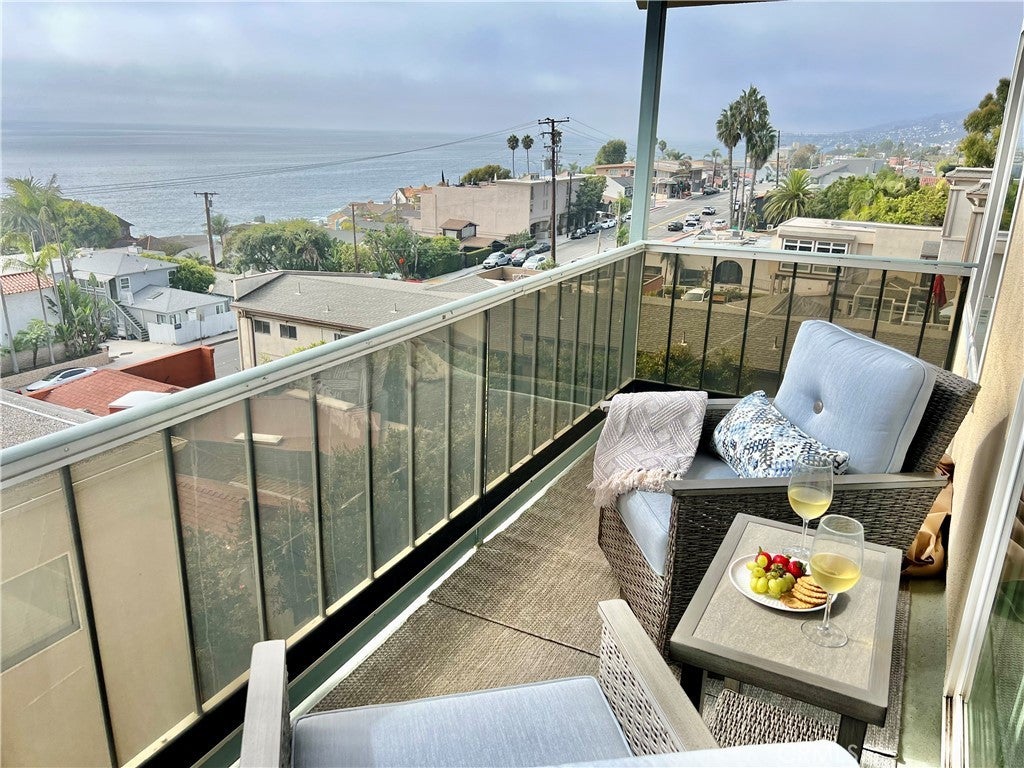 Beautifully remodeled, top-level, corner unit condo with panoramic Ocean and Catalina Island views in charming Wood's Cove. Just a block from the beach entrance, this turn-key, furnished unit has been thoughtfully designed with luxury features and an open floorplan to take advantage of the sweeping Coastline views. Cozy, decorative fireplace and contemporary Bosch decor in the Living Room, New kitchen with all white cabinets, granite counters, and top-quality appliances (instant Induction stove) wood laminate floors, and opens to tasteful Living spaces and ocean view dining. The Primary Suite also has ocean views and large, flat-screen TV. The luxurious bathroom has a large, step-in shower, granite counters, and new tile floors. Step out to a covered outdoor patio/deck area with panoramic views. All this, just steps away from Laguna Beach's shops, restaurants, and an easy walk into the Hip District and downtown Village area. Available for short-term (31+ days) and seasonal rentals, please inquire.