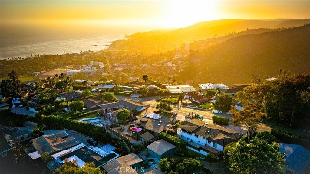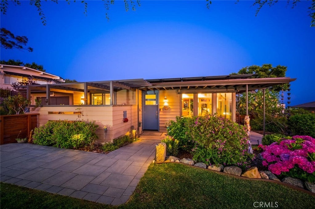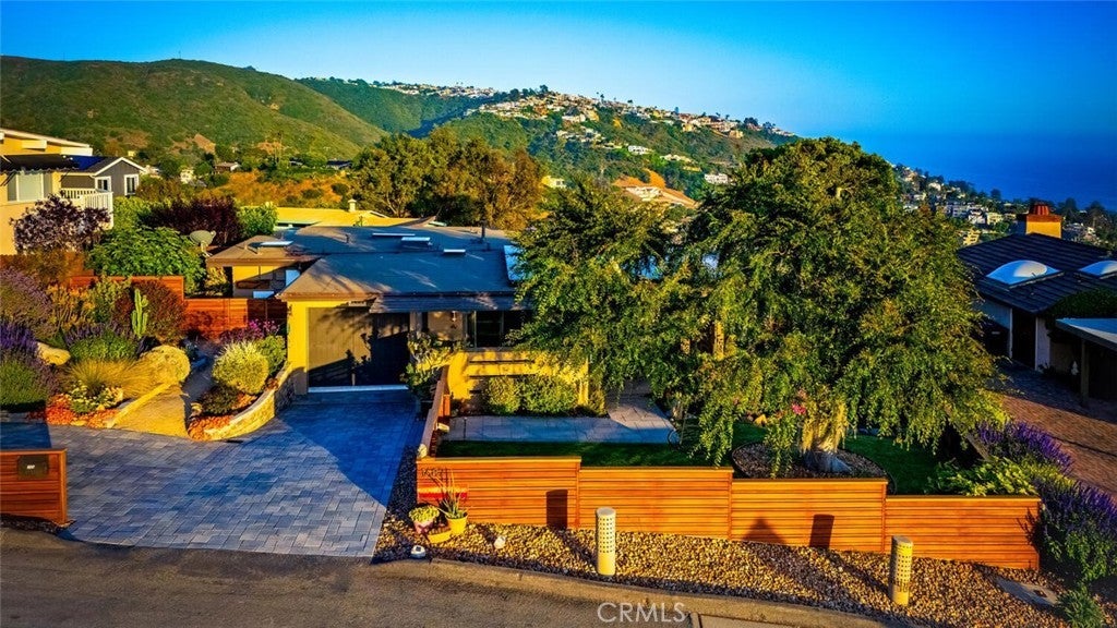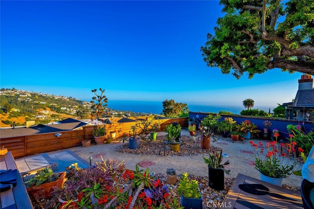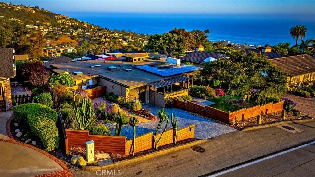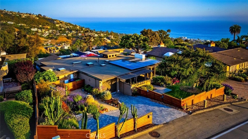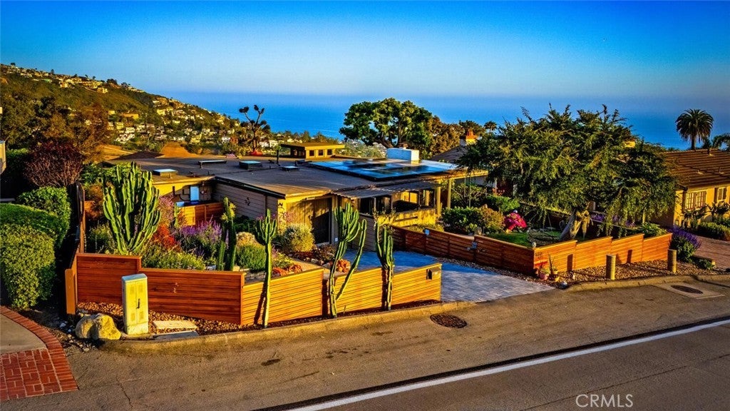 Perched above the pristine coves of laguna beach, this mid century modern masterpiece echoes the timeless influence of early Frank Loyd Wright design. With iconic post-and-beam construction and dramatic walls of glass, the home is thoughtfully positioned to capture sweeping ocean and canyon vistas from every angle. This single level, two bedroom two bath retreat has been beautifully remodeled to blend classic architecture with modern comforts. New floor to ceiling windows and elevated skylights flood the space with natural light, while lush landscaping and panoramic views create a seamless indoor outdoor living experience. Set on nearly 10,000 square feet of flat, useable land, the home offers privacy, serenity, and room to grow-complete with architectural plans included in the sale and potential for an ADU. Inside, a chef's ocean view kitchen flows effortlessly into the open plan living and dining rooms, grounded by rich wood flooring, and elegant stone surfaces throughout. Step outside onto the expansive wrap around deck, where a gentle breeze and post card worthy sunsets await. Cozy up by the wood burning fireplace as day turns into night and the coastline begins to glow. Whether you're seeking a peaceful retreat, an entertainer's dream, or a foundation for future expansion, this one of a kind architectural jewel delivers it all.