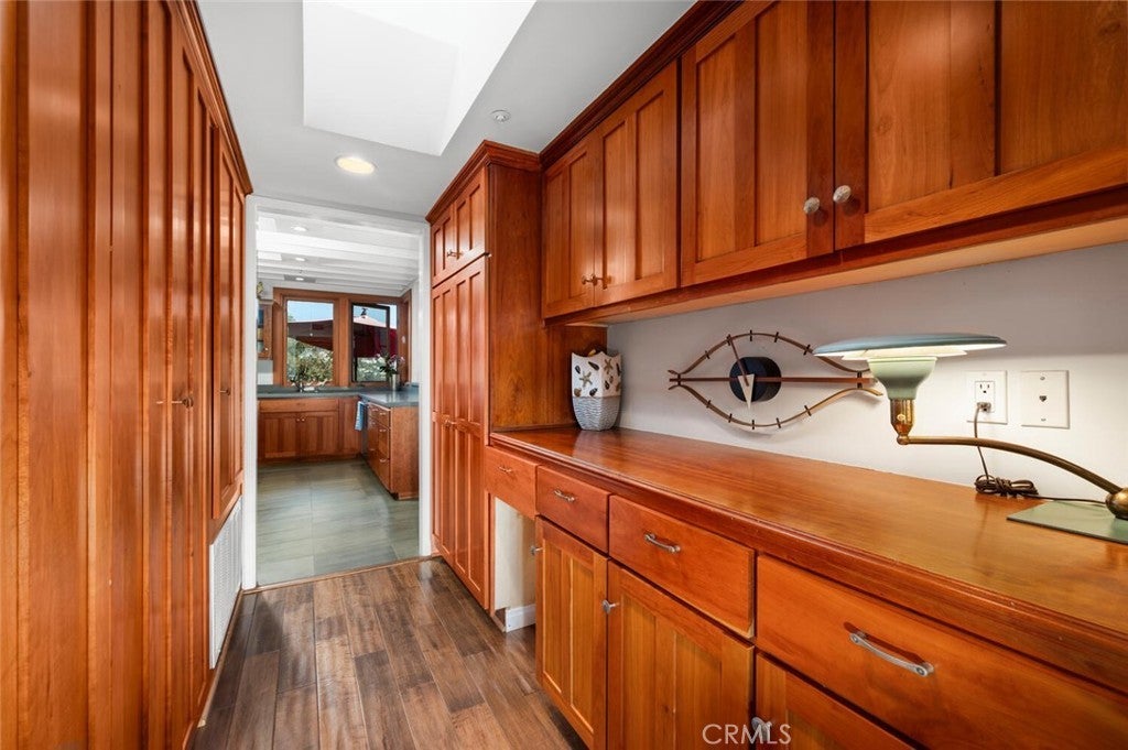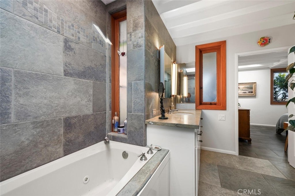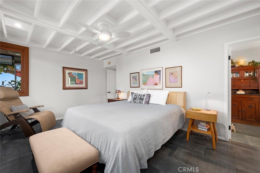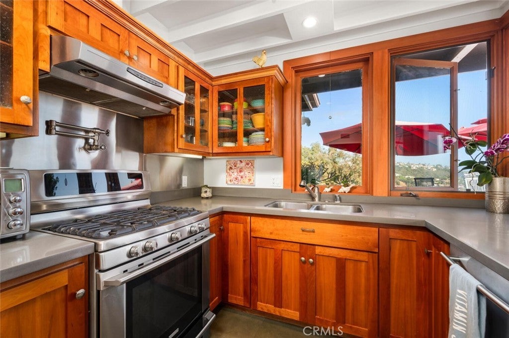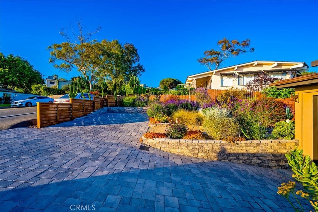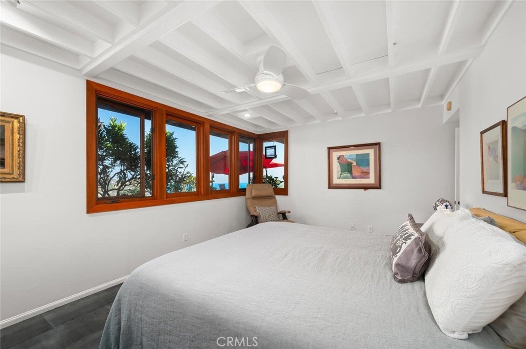 Perched above the pristine coves of laguna beach, this mid century modern masterpiece echoes the timeless influence of early Frank Loyd Wright design. With iconic post-and-beam construction and dramatic walls of glass, the home is thoughtfully positioned to capture sweeping ocean and canyon vistas from every angle. This single level, two bedroom two bath retreat has been beautifully remodeled to blend classic architecture with modern comforts. New floor to ceiling windows and elevated skylights flood the space with natural light, while lush landscaping and panoramic views create a seamless indoor outdoor living experience. Set on nearly 10,000 square feet of flat, useable land, the home offers privacy, serenity, and room to grow-complete with architectural plans included in the sale and potential for an ADU. Inside, a chef's ocean view kitchen flows effortlessly into the open plan living and dining rooms, grounded by rich wood flooring, and elegant stone surfaces throughout. Step outside onto the expansive wrap around deck, where a gentle breeze and post card worthy sunsets await. Cozy up by the wood burning fireplace as day turns into night and the coastline begins to glow. Whether you're seeking a peaceful retreat, an entertainer's dream, or a foundation for future expansion, this one of a kind architectural jewel delivers it all.