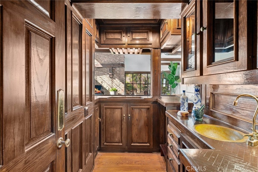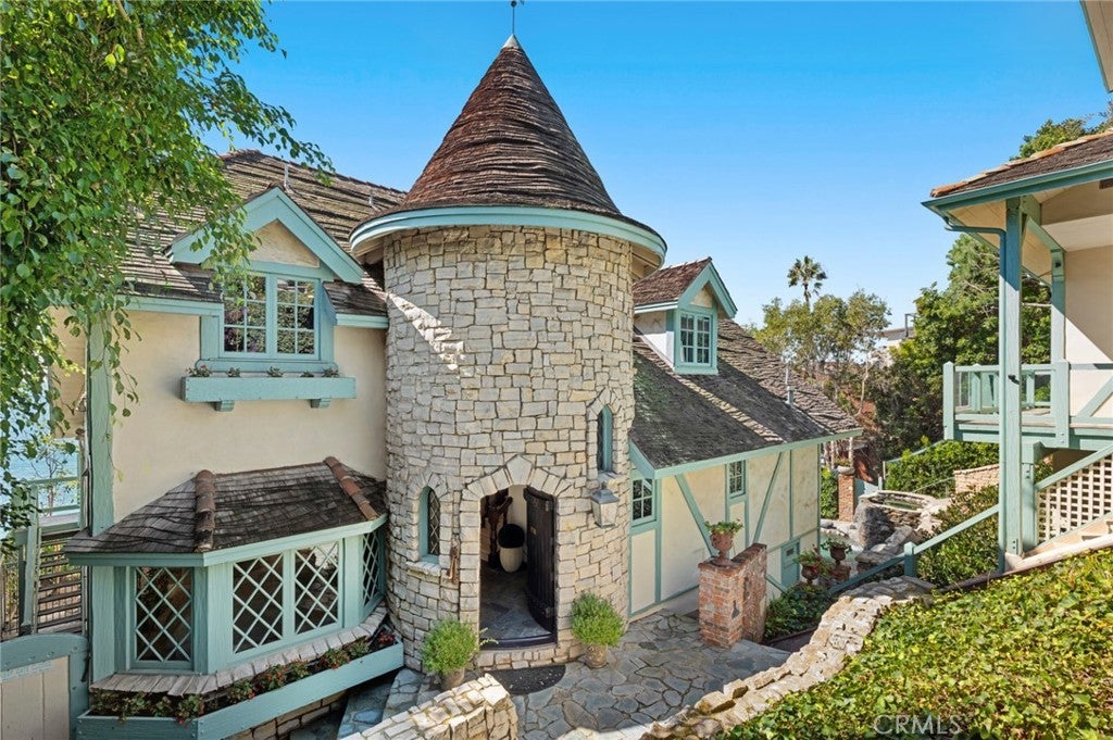 Perched above the Pacific Ocean, this rare Laguna Beach estate unfolds across more than half an acre, offering direct beach access with rare ownership of a portion of the sand, panoramic coastal views, and resort-style amenities. Designed to celebrate its dramatic oceanfront setting, the property blends timeless craftsmanship with whimsical architectural character and effortless California elegance across approximately 5,756 square feet of living space, featuring seven bedrooms and seven total bathrooms. The compound includes a stunning main home, poolside guest quarters, and a separate guest apartment. The main residence feels both grand and enchanting, with a stone turret, diamond-patterned windows, and a shingled roof that mirrors the rhythm of the waves below. Inside, stone floors, a sculptural floating staircase, and soaring beamed ceilings frame endless ocean vistas. The living room, anchored by an impressive double-height fireplace, opens to an oversized deck that appears to float above the water, while the formal dining room and vintage kitchen with a wet bar for entertaining invite gatherings that linger late into the evening. The primary suite offers a private ocean-view deck, fireplace, dual baths, and a walk-in closet—a serene retreat overlooking the sea, with panoramic coastal views, Catalina Island, sunsets, and sparkling night lights. Additional highlights include a loft-style office, expansive family room, and two main-level guest rooms. The poolside guest quarters feature ocean views, a fireplace, and an ensuite bath, while the separate approximately 1,485-square-foot guest residence showcases panoramic ocean vistas, high ceilings, abundant natural light, three bedrooms (two ensuite), a den, and ocean-view patios. Lush stone pathways meander through the grounds, connecting multiple terraces, a resort-style pool and spa, and the sandy shoreline of renowned Thousand Steps Beach. An oversized three-car garage and expansive motor court with a circular drive complete the property. This rare oceanfront compound, where craftsmanship and coastal magic converge, captures the very essence of Laguna Beach living. Ideally situated moments from fine and casual dining, art galleries, and the Montage Resort, it represents the pinnacle of coastal living.