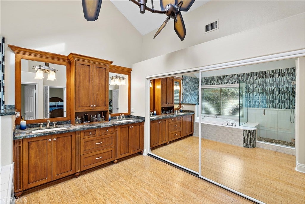 Balcony, Ceiling Fan(s), Cathedral Ceiling(s), Separate/Formal Dining Room, Eat-in Kitchen, Granite Counters, Quartz Counters, Bedroom on Main Level, Primary Suite, Walk-In Closet(s)
