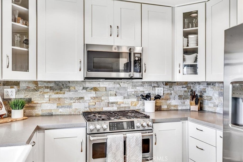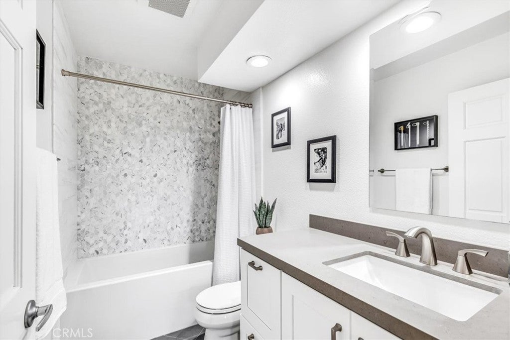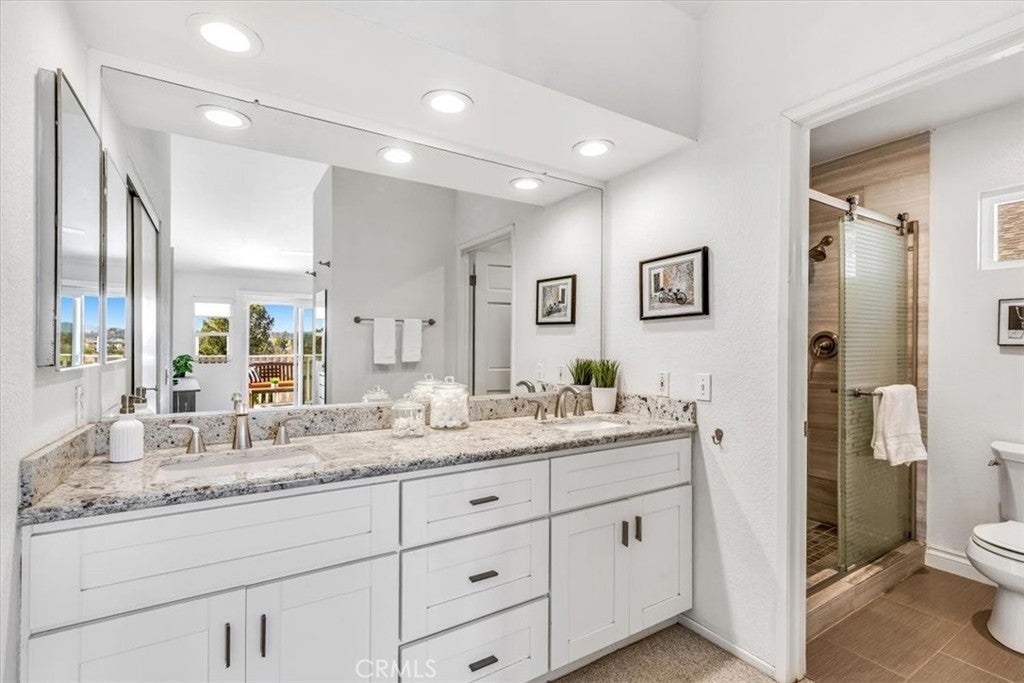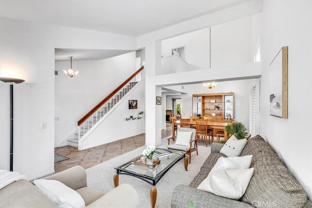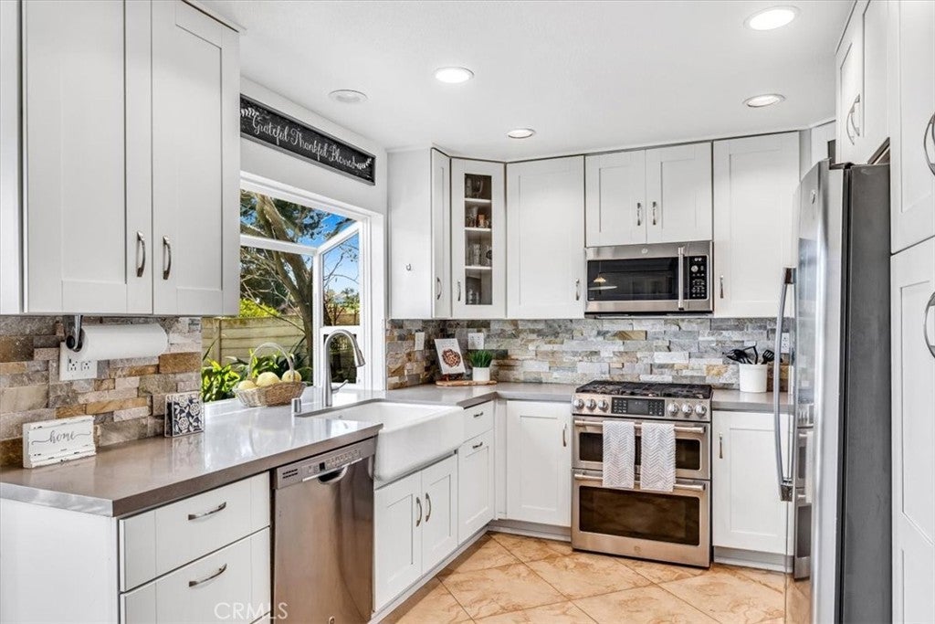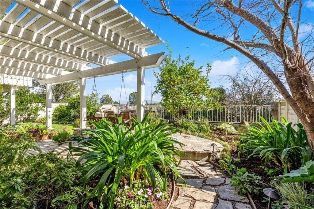 Stunning View Home in Aliso Viejo, showcasing fantastic curb appeal, refined interior finishes, and thoughtful upgrades. This beautifully maintained Four Bedroom home is ideally located in the desirable Glenwood Terrace community—walkable to parks, the neighborhood pool, and lighted tennis courts. Designed with an excellent floor plan, the home features a main-level bedroom and full bathroom, ideal for guests or multigenerational living. A welcoming entry opens to the light-filled living room with vaulted ceilings, upgraded vinyl windows, and plantation shutters. The formal dining room flows seamlessly to a private side-yard retreat, creating an inviting additional outdoor living space. The completely remodeled kitchen offers timeless style with quartz countertops, stone backsplash, white shaker cabinetry, GE stainless steel appliances, an oversized farmhouse sink, and a charming garden window overlooking the backyard. A casual dining area opens to the family room with a gas log fireplace. Extensive home upgrades include a newer roof, whole-house PEX repipe, owned solar, upgraded HVAC, newer water heater, and remodeled bathrooms. Upstairs, three bedrooms enjoy east-facing views of the Saddleback Mountains. The primary suite features vaulted ceilings, two separate closets and an updated en-suite bathroom with granite countertops and dual sinks. The oversized balcony is perfect for enjoying colorful sunrises, sparkling city lights, and 4th of July fireworks. Artistically designed landscaping creates a serene front and backyard oasis with multiple patios, drip irrigation, exterior lighting, porch awning, and mature shade and fruit trees including orange, lemon, lime, persimmon, crape myrtle, and redbud. Enjoy exceptional community amenities including a heated lap pool, spa, fitness center, clubhouse, BBQ and picnic areas, greenbelts, and lighted tennis courts. Conveniently located near the 18-hole Jack Nicholas Golf Course, scenic trails of Aliso and Wood Canyons Wilderness Park, and just minutes from the renowned beaches of Laguna Beach. A truly turnkey home with timeless finishes in an exceptional location—this stunning property is an absolute must-see!