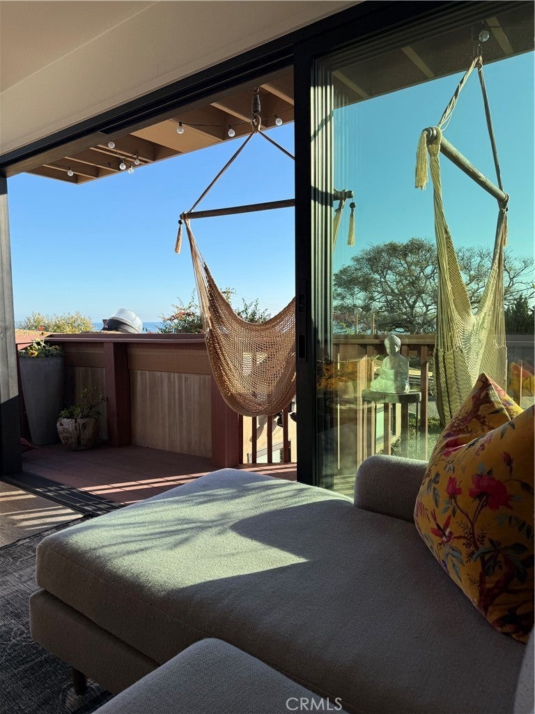 Great North Laguna back house above garage with ocean views! Beautiful light and bright modern style with an ocean view deck with 2 hammocks. The living room is spacious with dining area and hardwood floors throughout, with La Cantina doors that provide an indoor outdoor space when opened to balcony overlooking ocean and coastline views. The full kitchen with dishwasher opens up to living room and deck. The ocean view bedroom has an attached bathroom with tub and shower! Street parking only. No pets or smoking allowed. Landlord pays for gas, water, electric, cable and wifi~Available 8/01/2026~